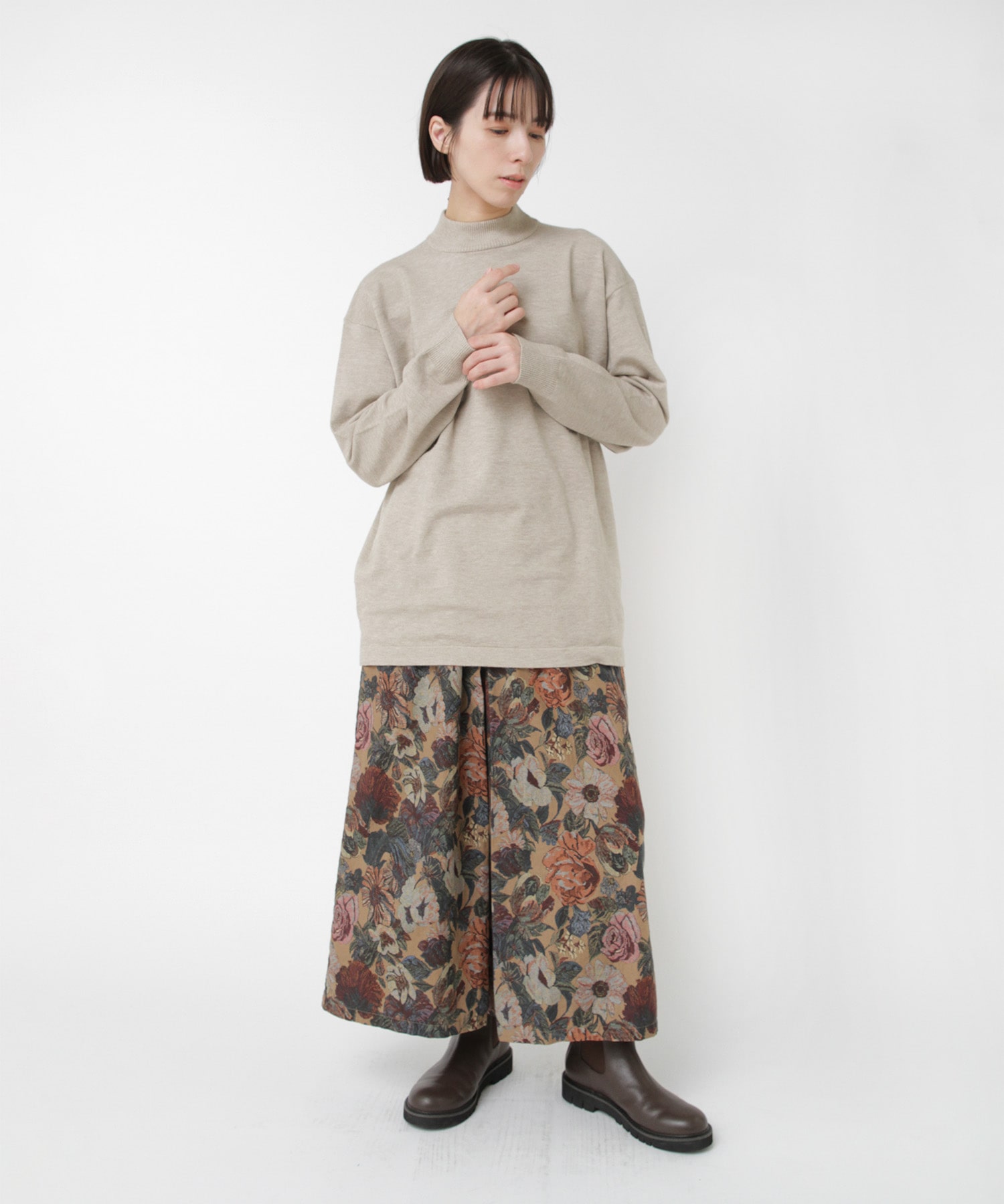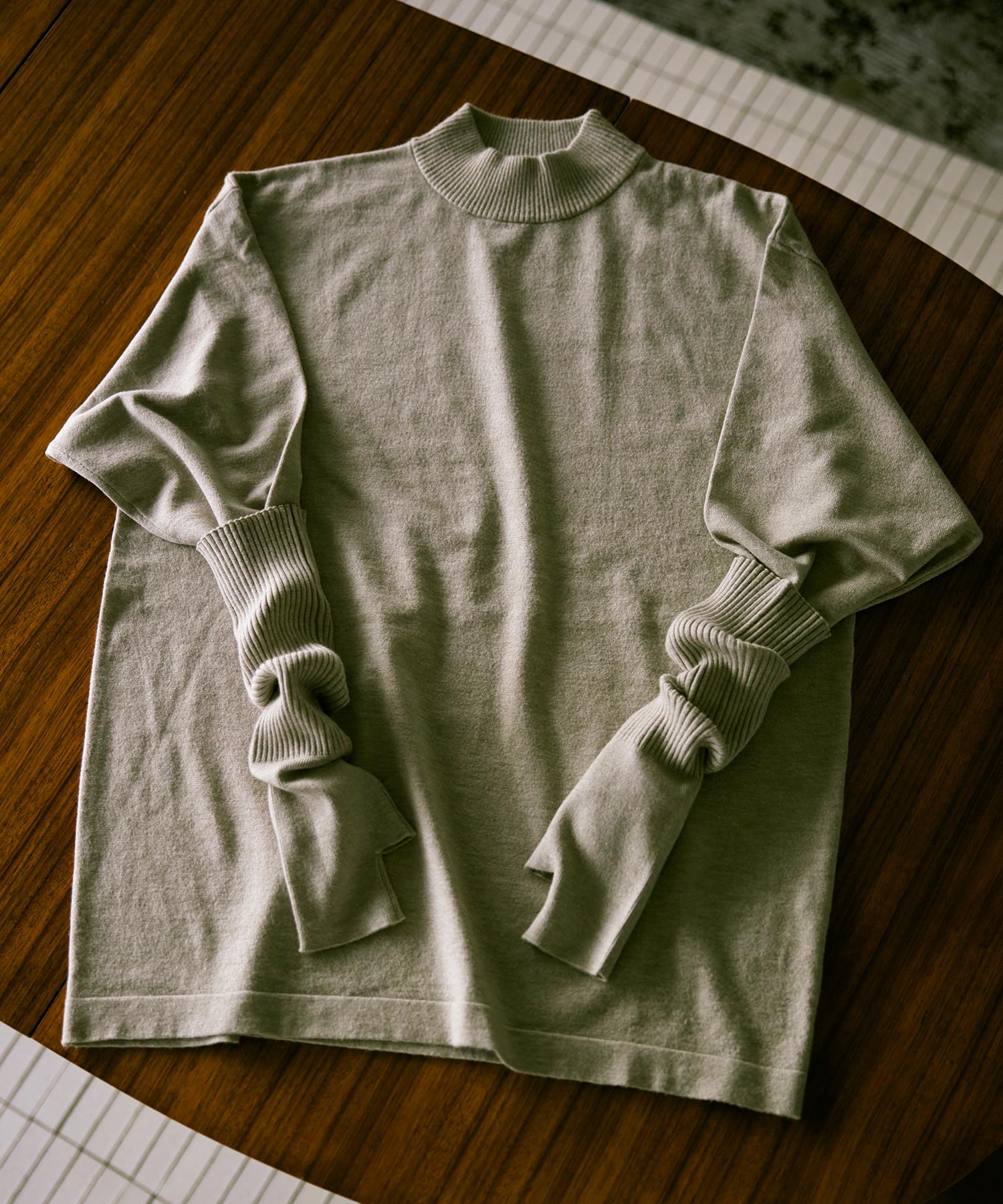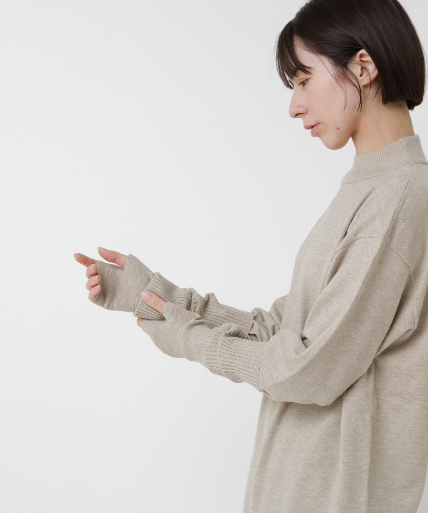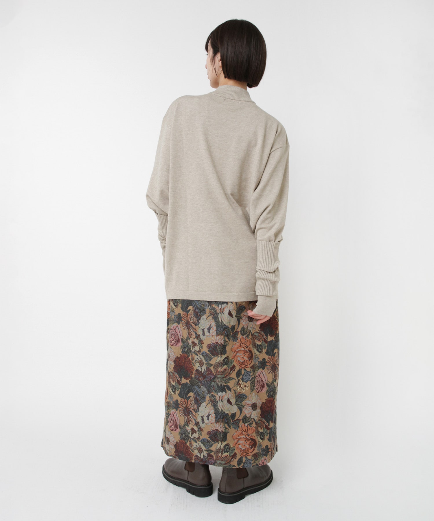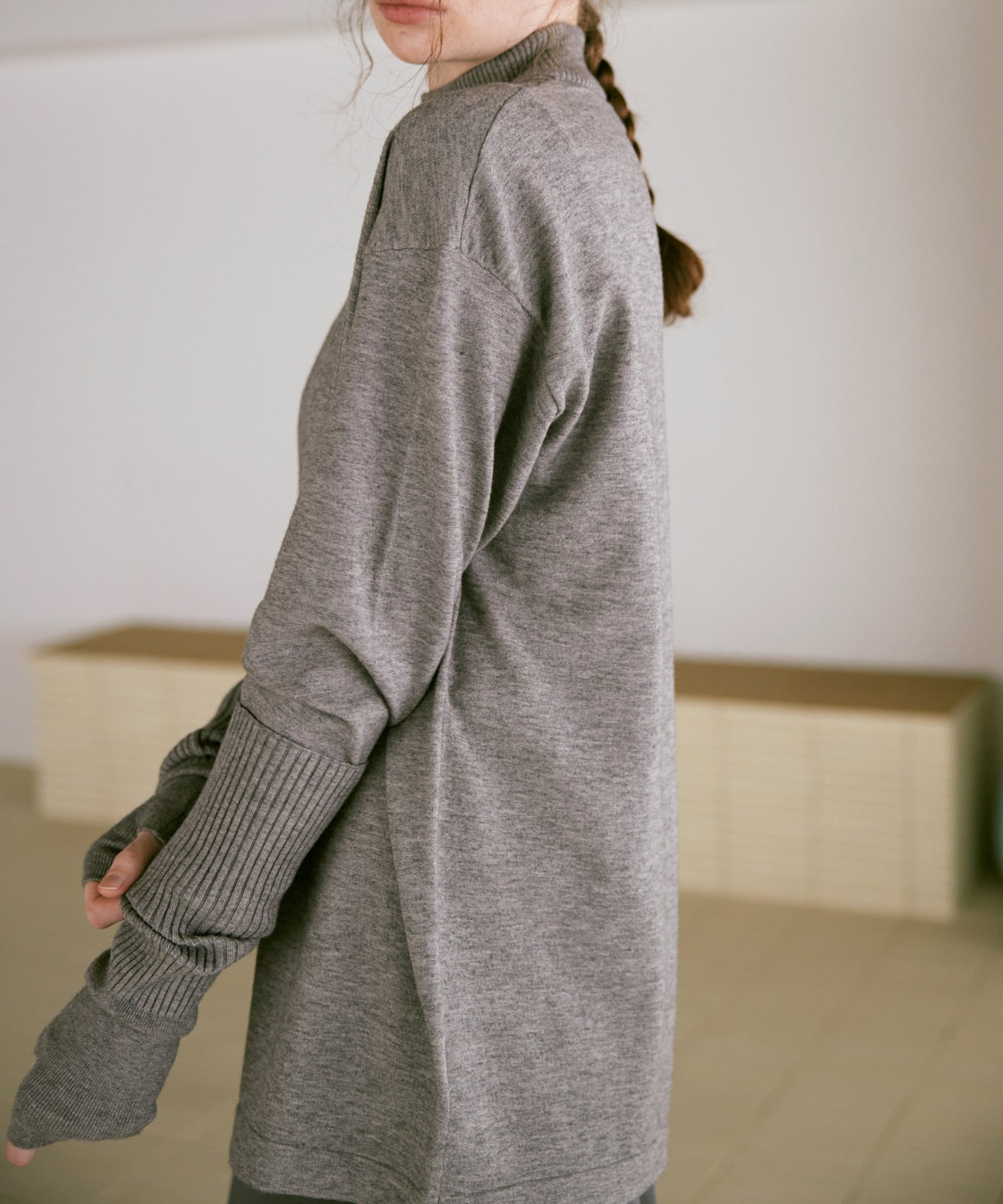 襟元はやや高さを出したモックネックで、カジュアルな中にも品のある印象に。