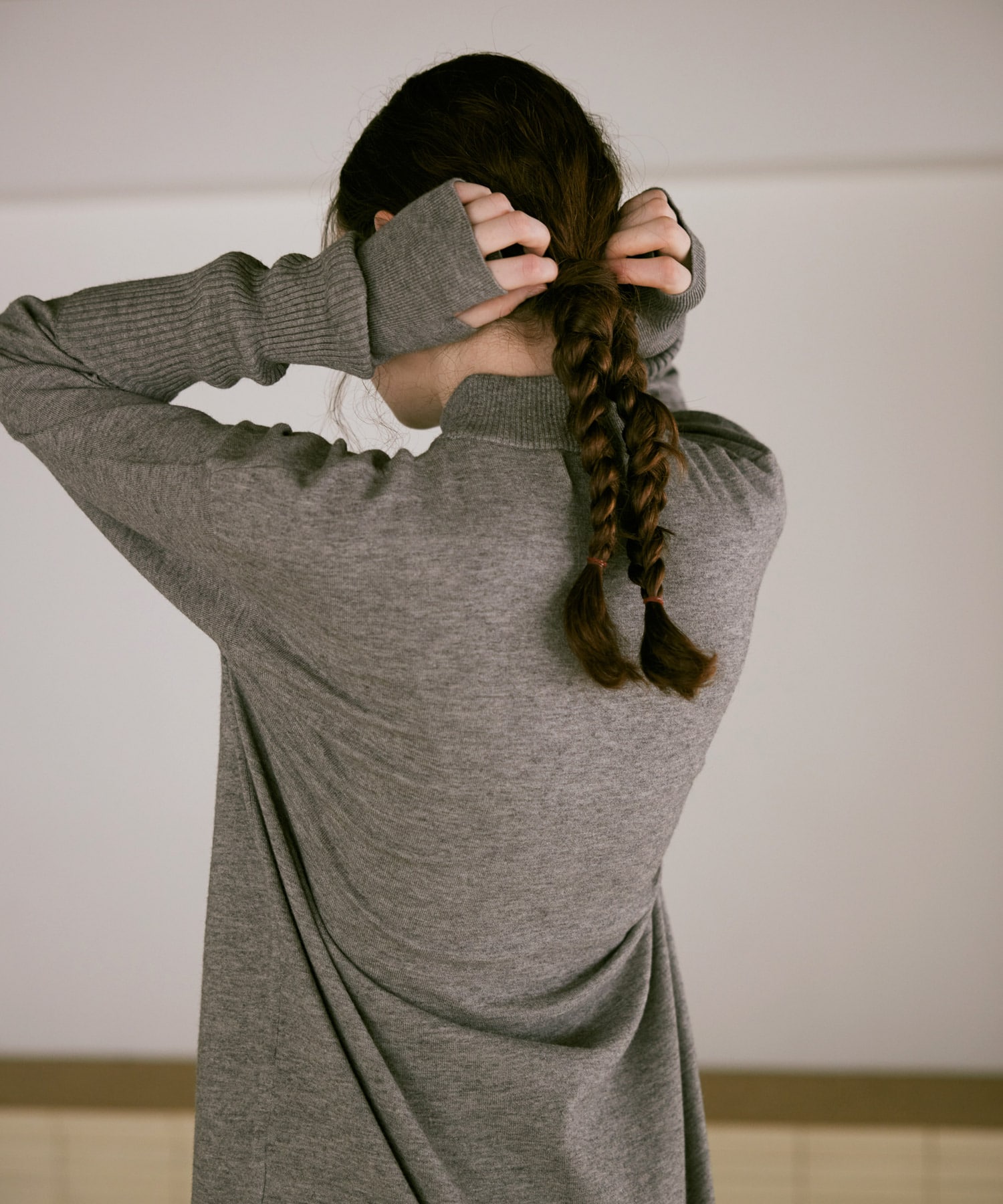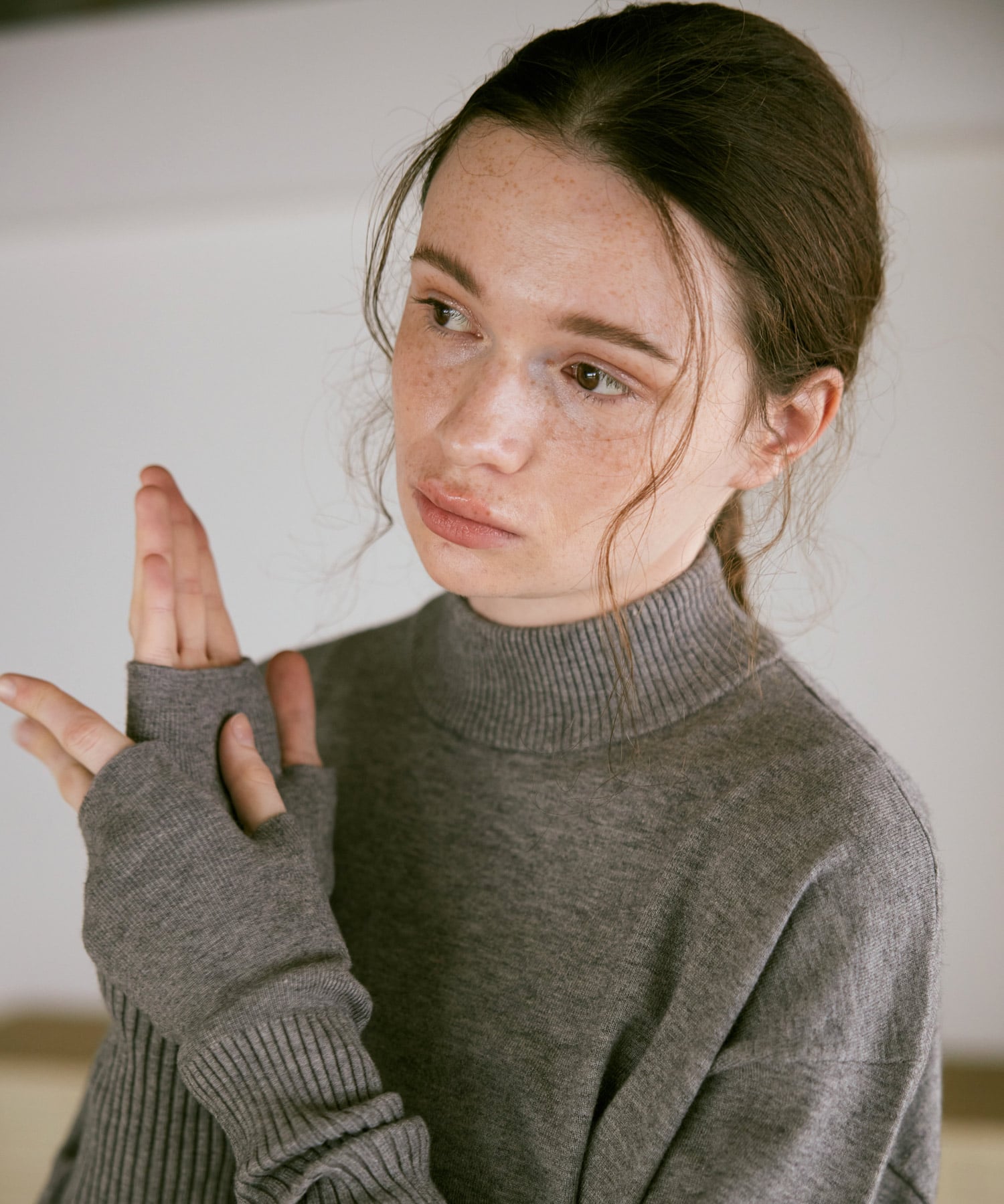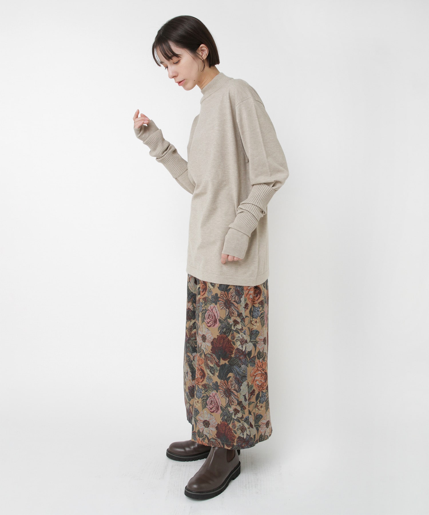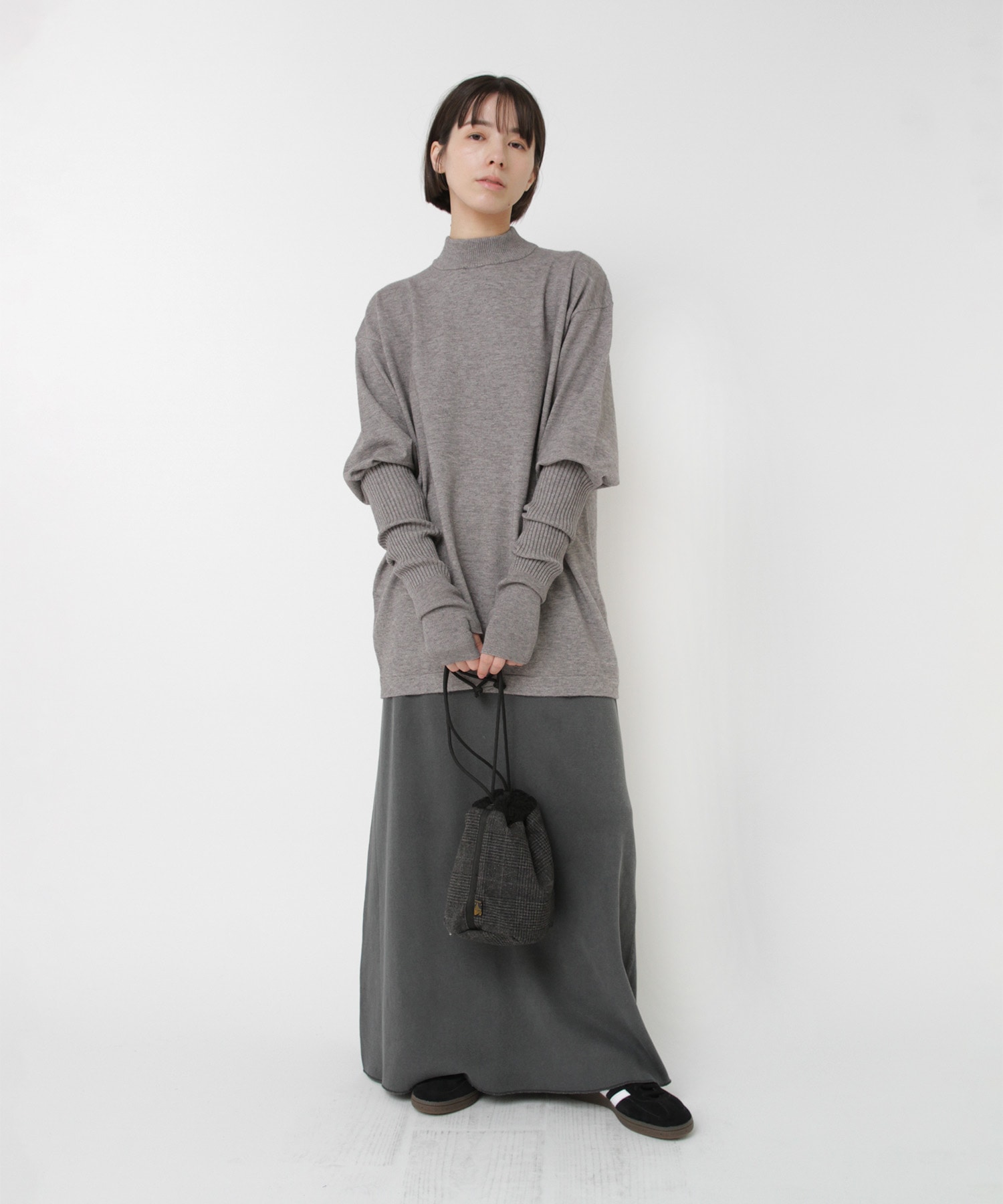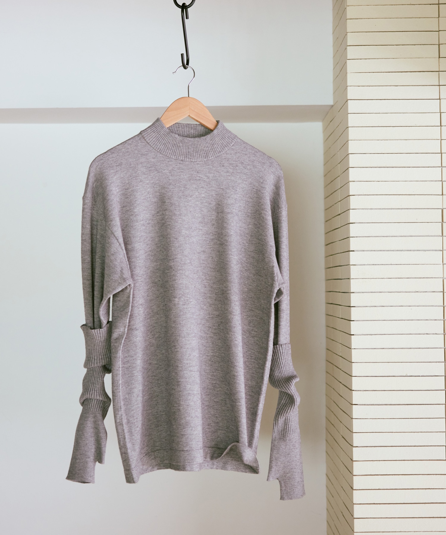 襟元はやや高さを出したモックネックで、カジュアルな中にも品のある印象に。