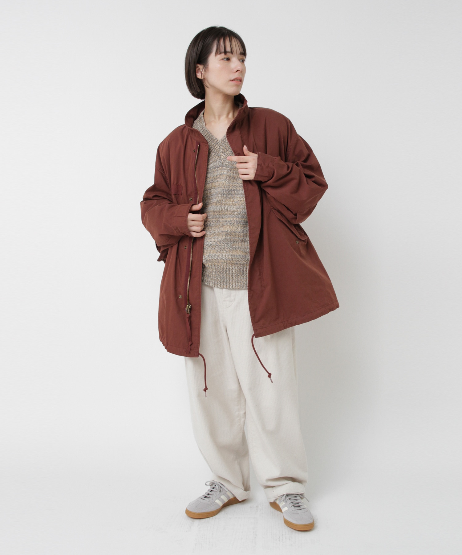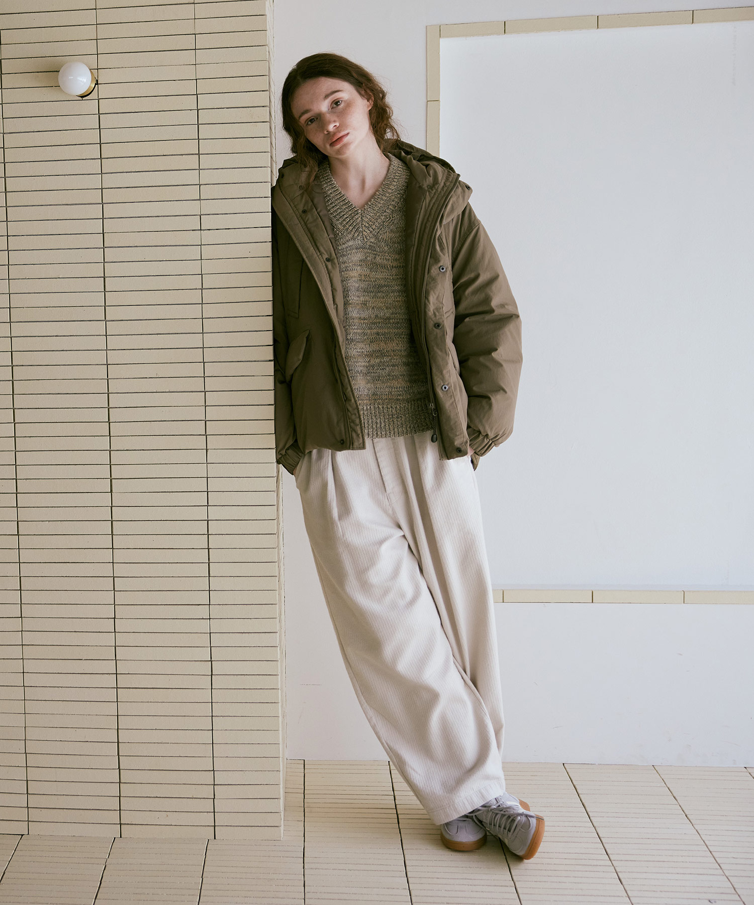 ボリュームのあるボトムスとも好相性で、裾からインナーをのぞかせるレイヤードスタイルもおすすめ。