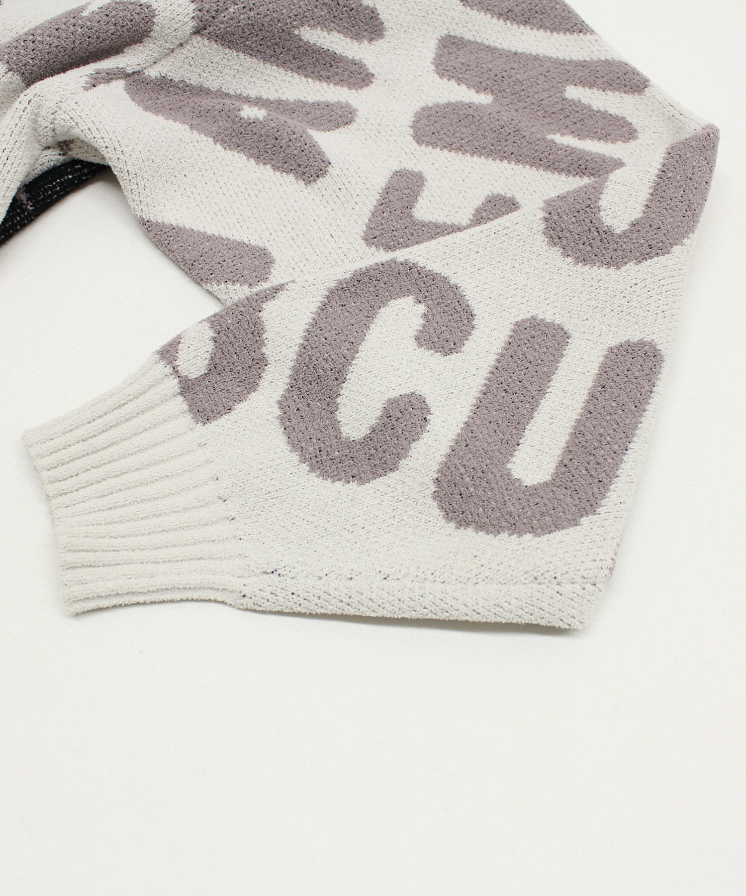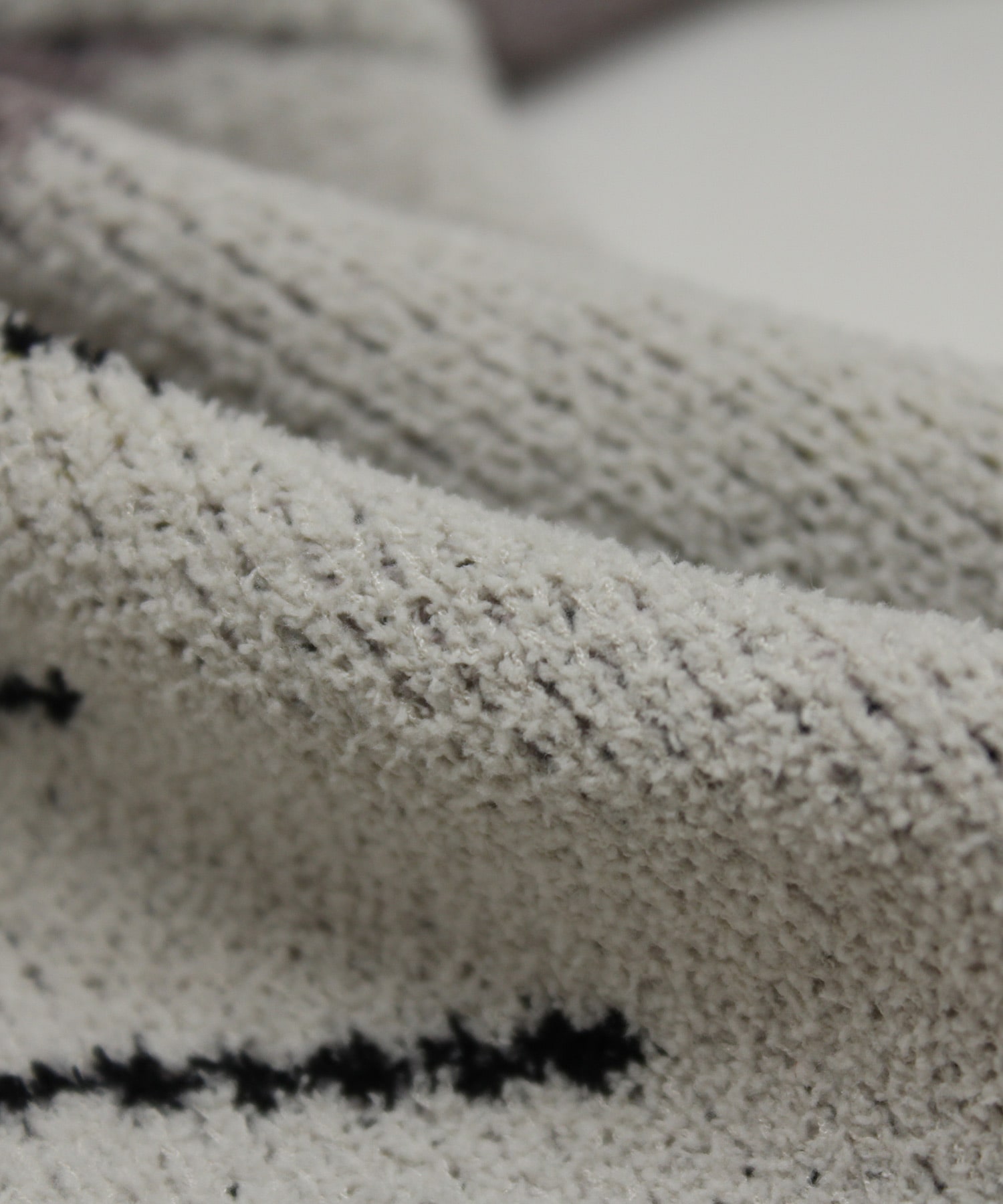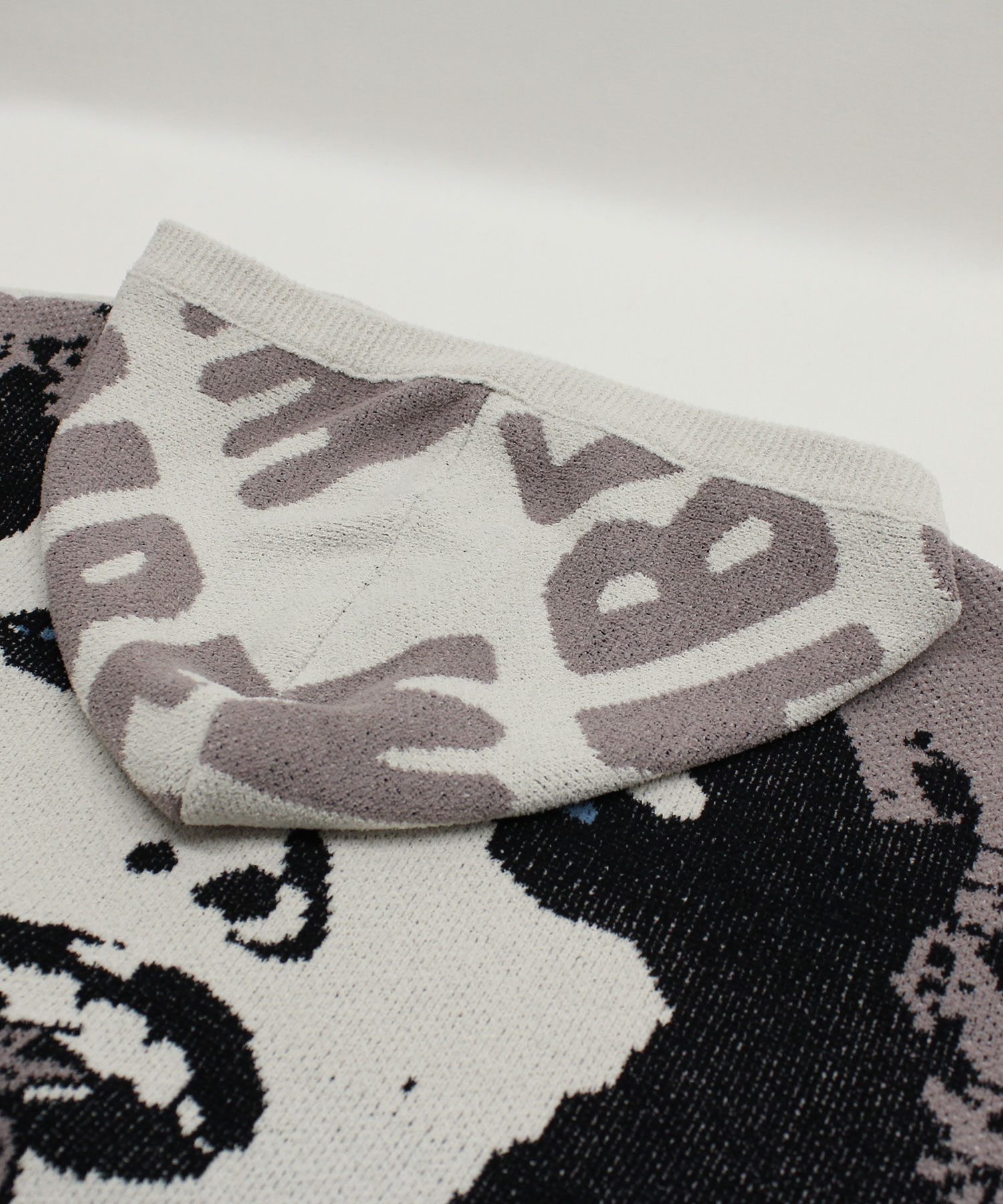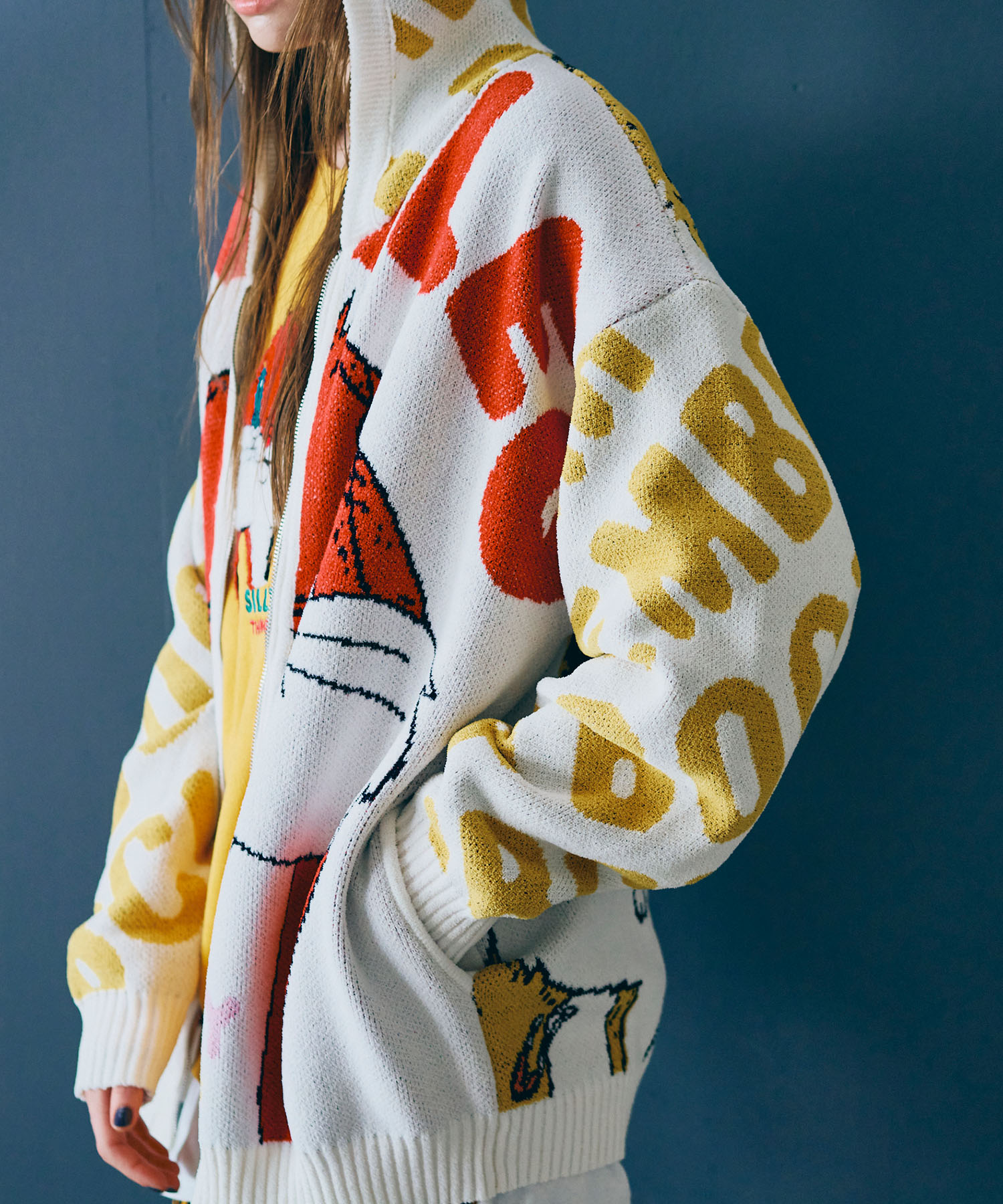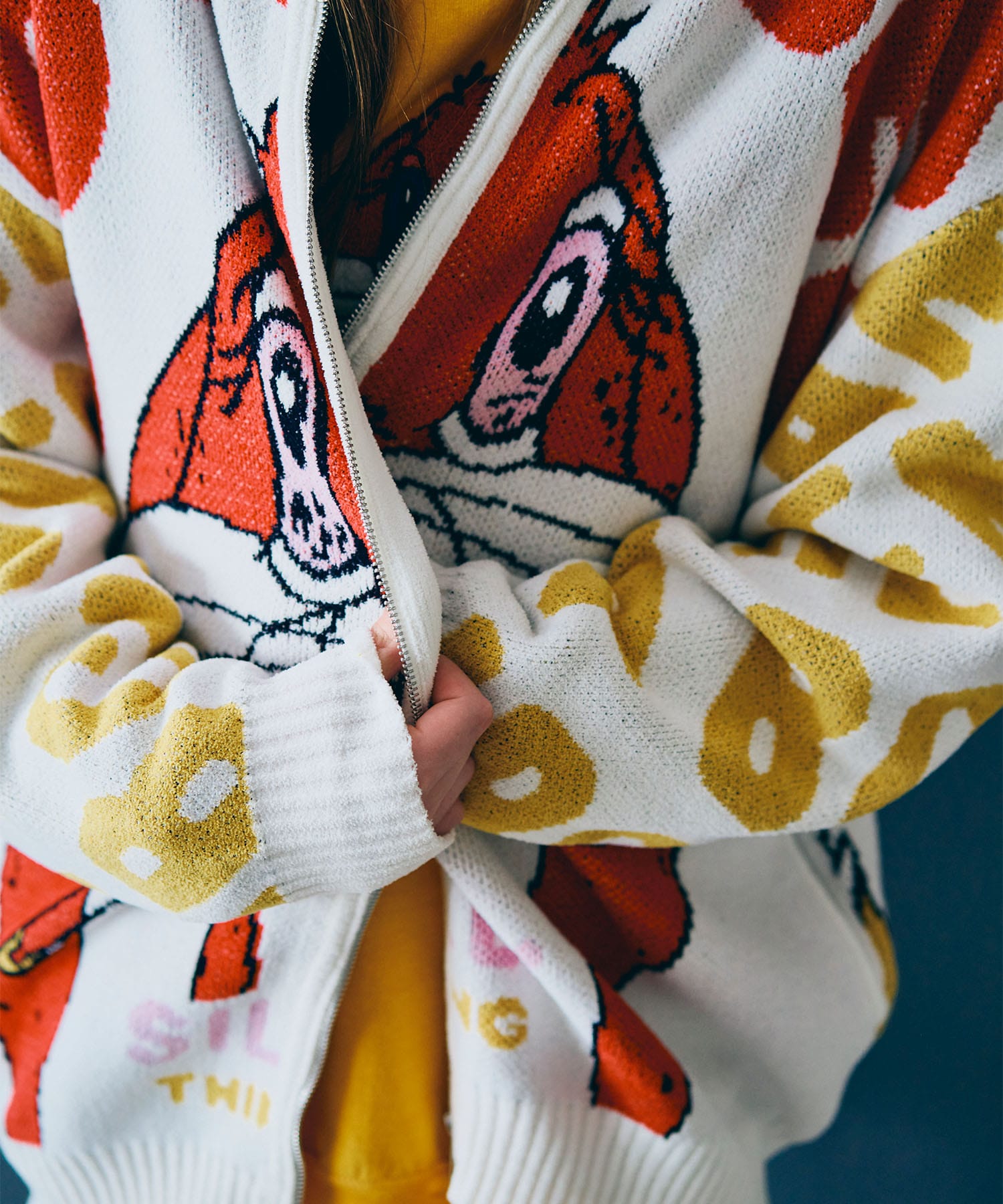 B級でキッチュなキャラをモールヤーン(短い毛足のある糸)で編み柄にしました。