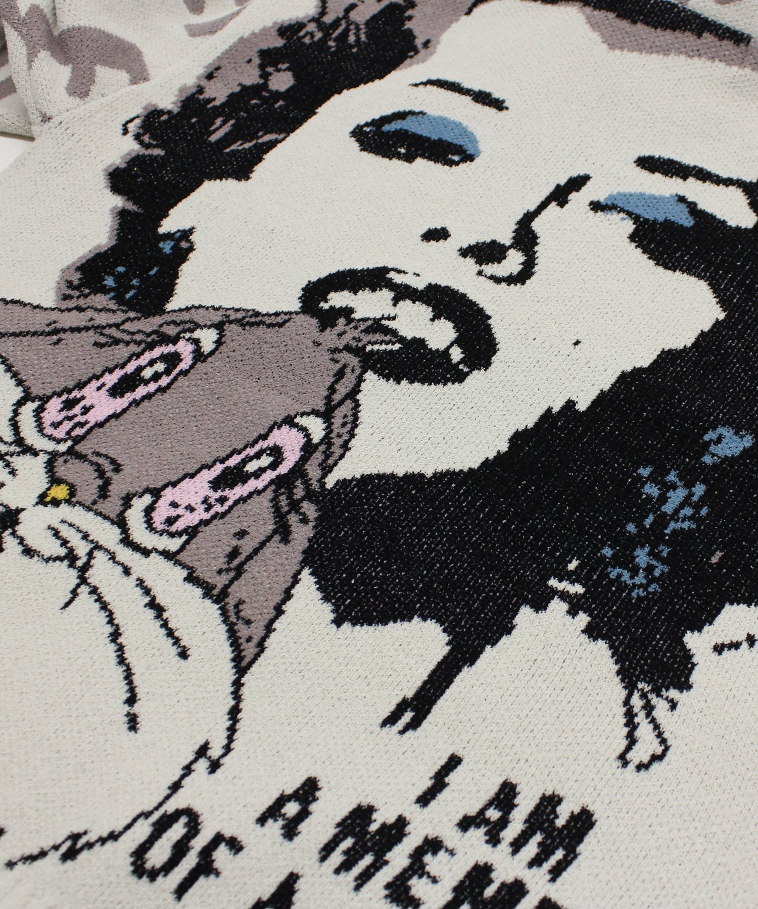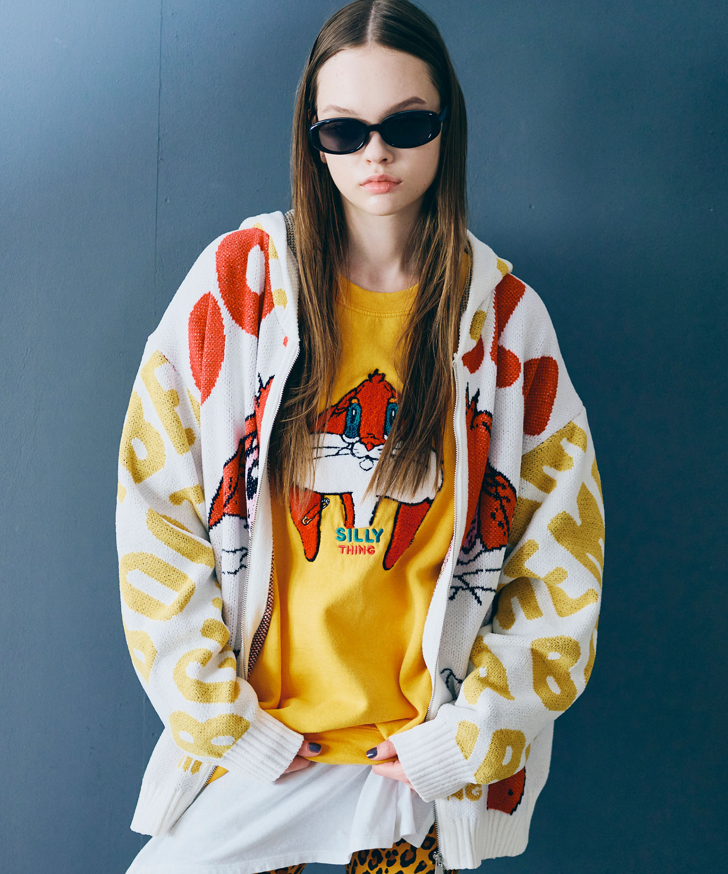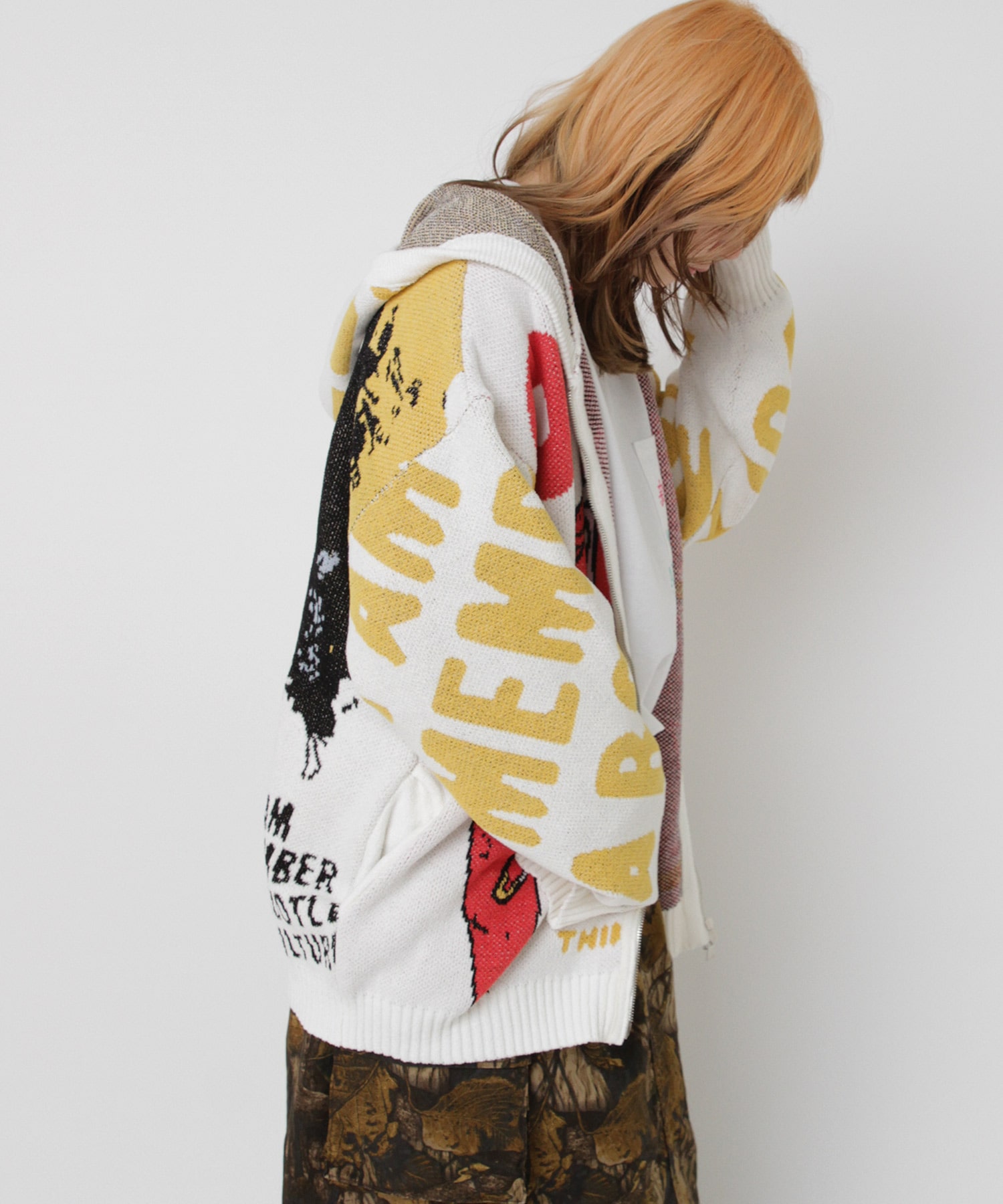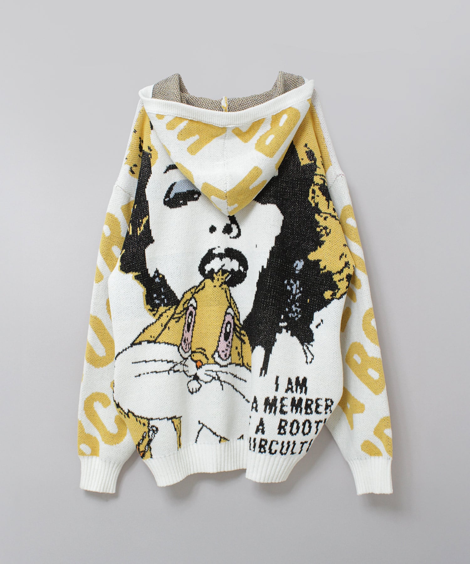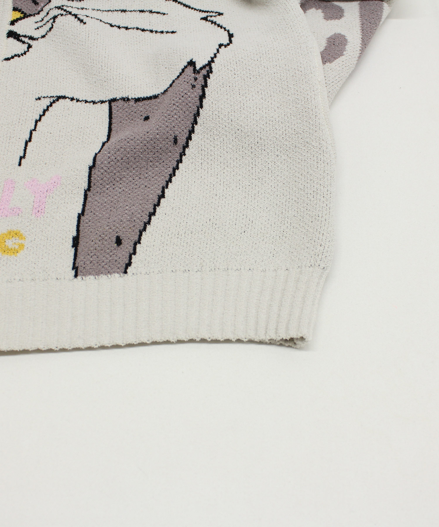 B級でキッチュなキャラをモールヤーン(短い毛足のある糸)で編み柄にしました。
