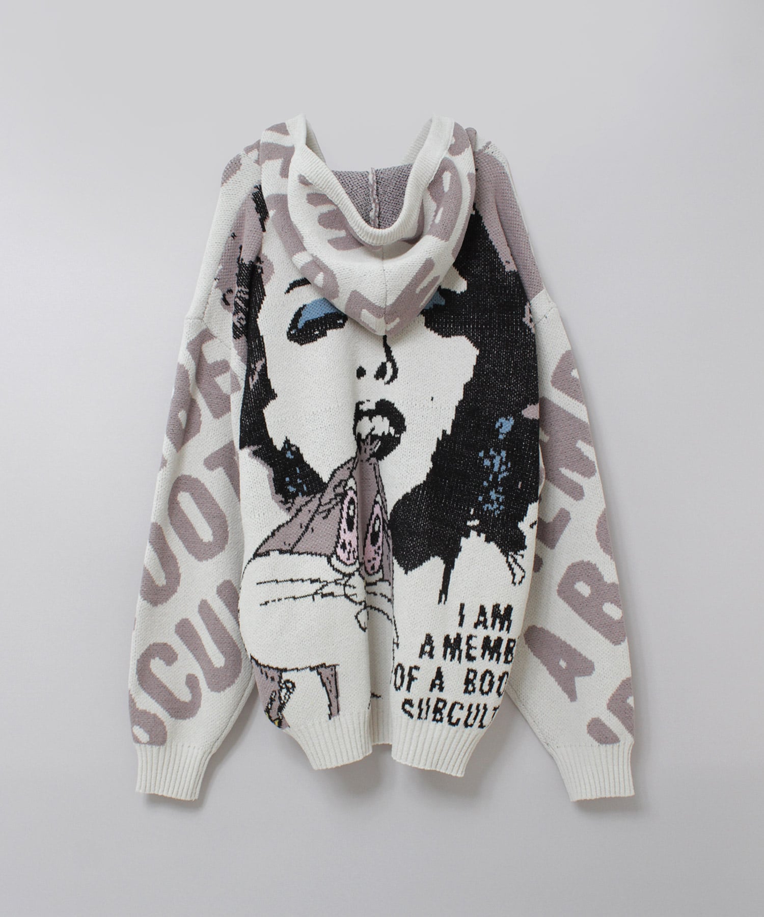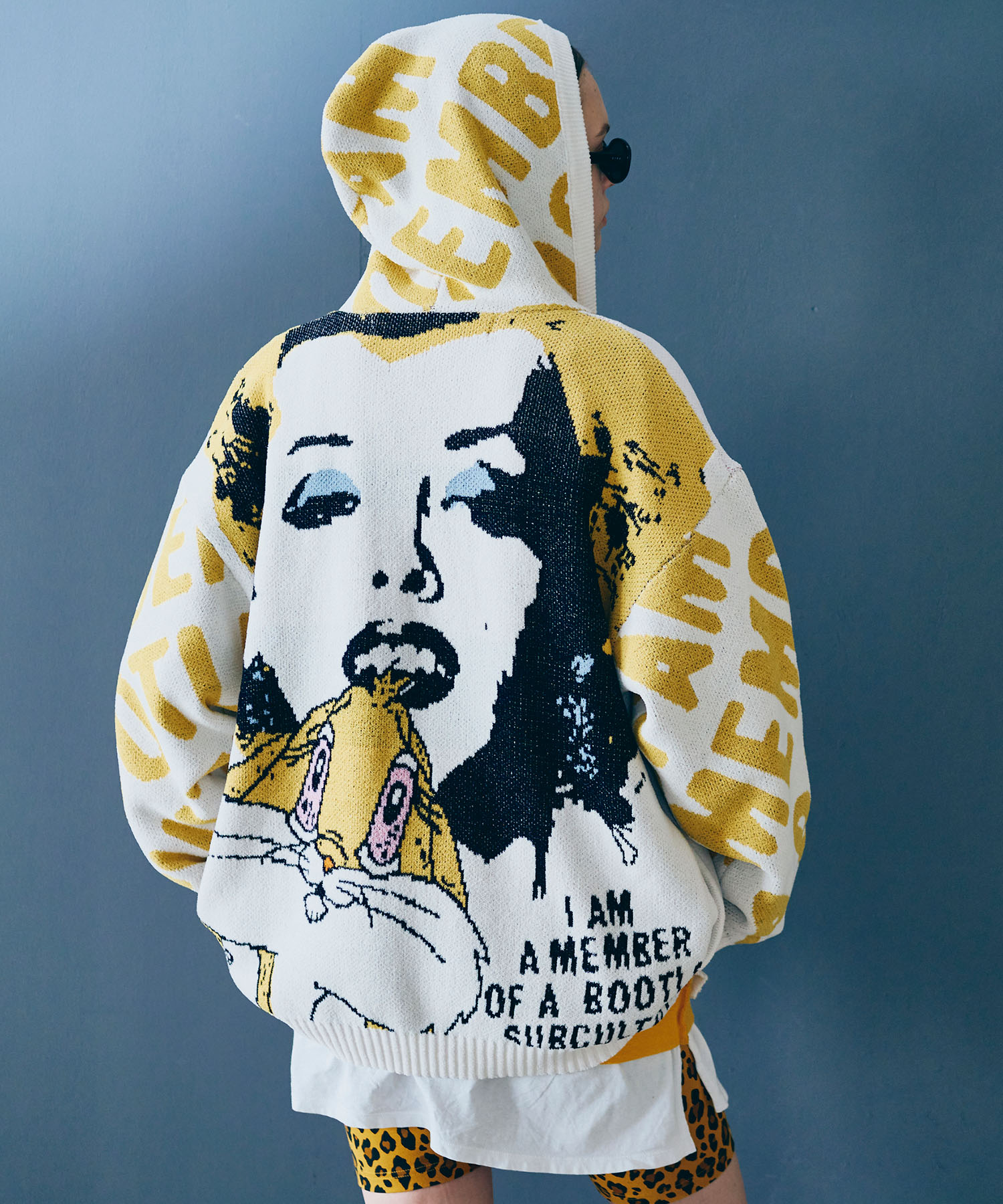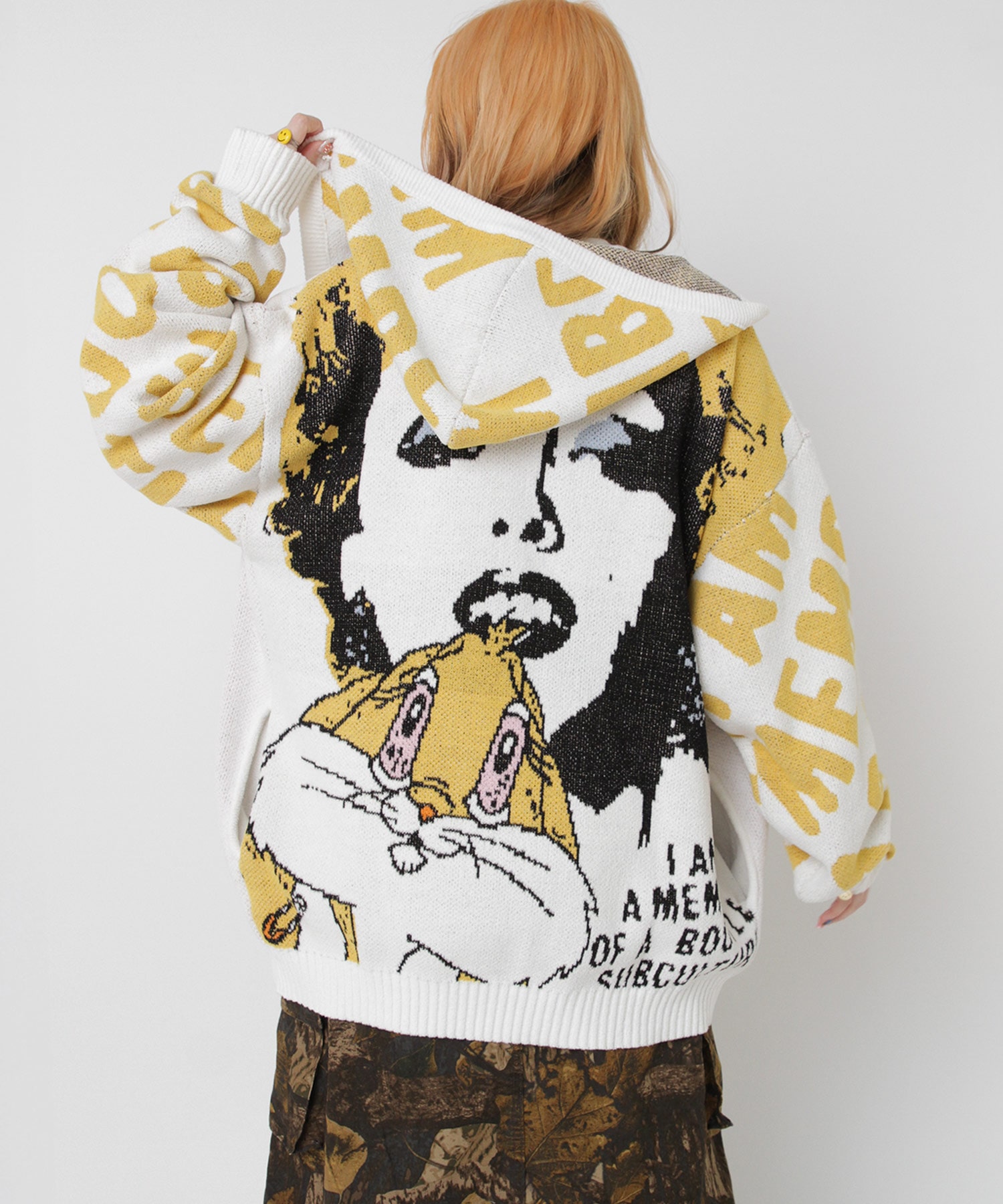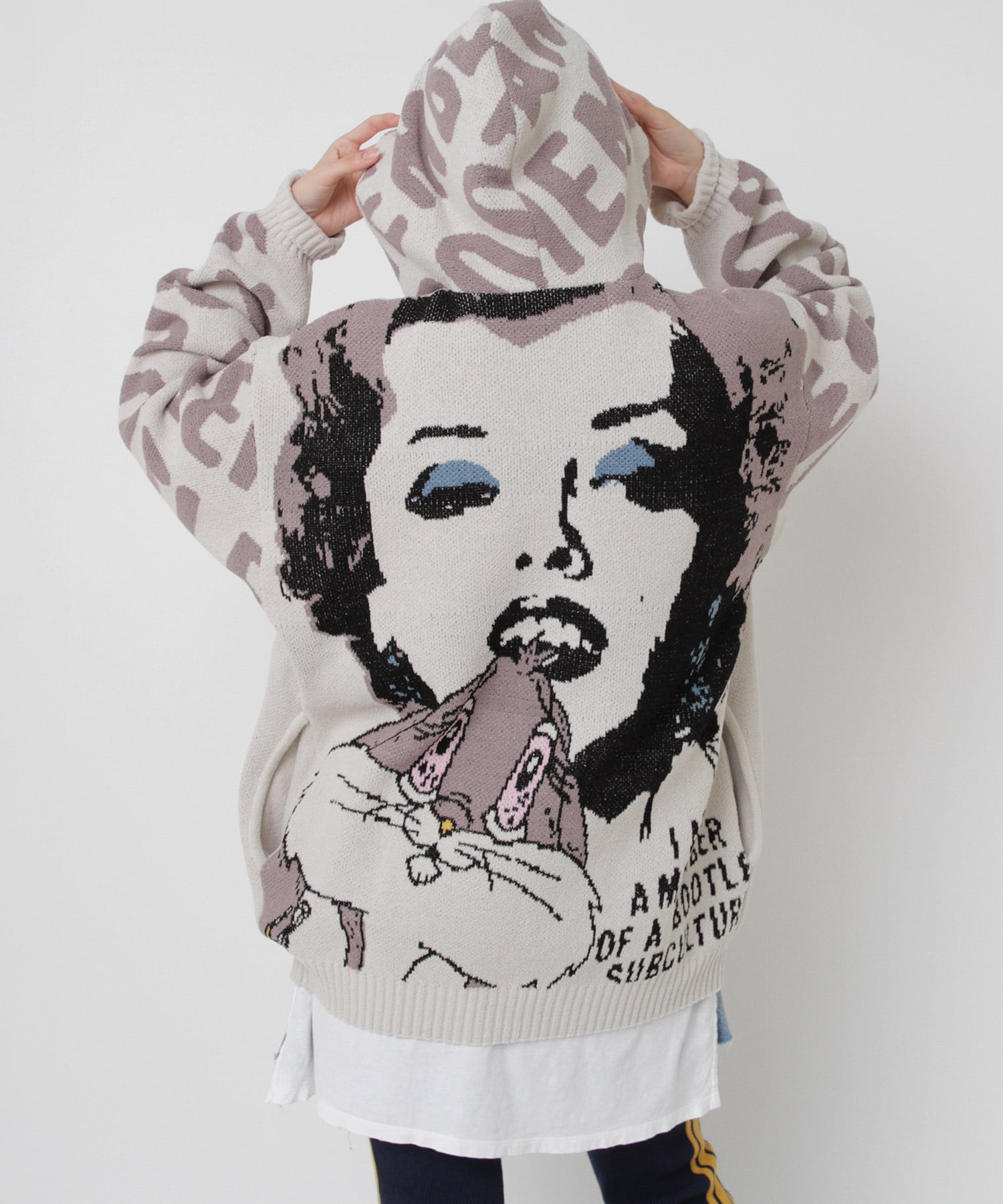 B級でキッチュなキャラをモールヤーン(短い毛足のある糸)で編み柄にしました。