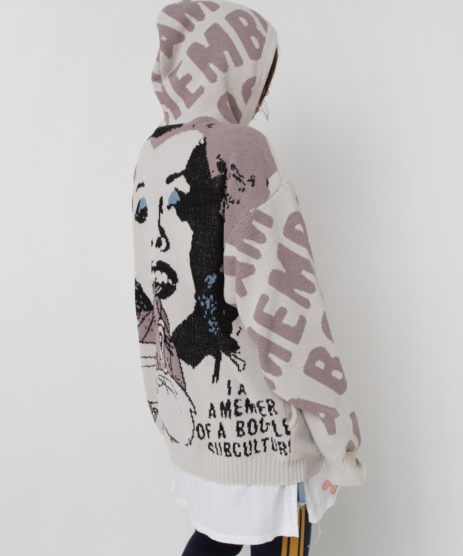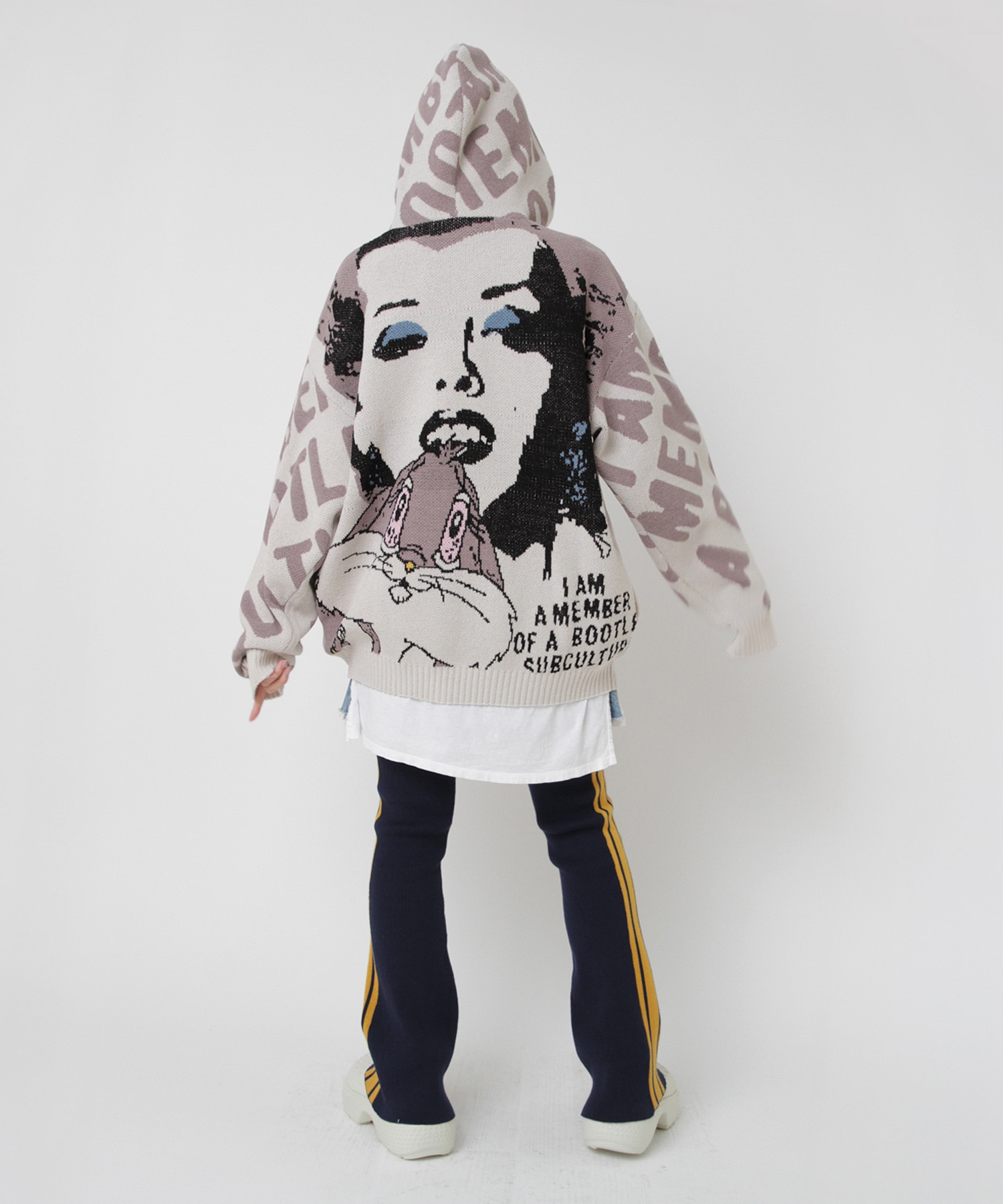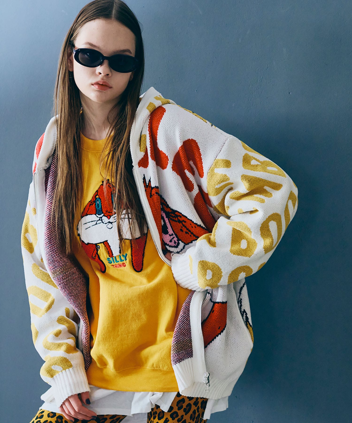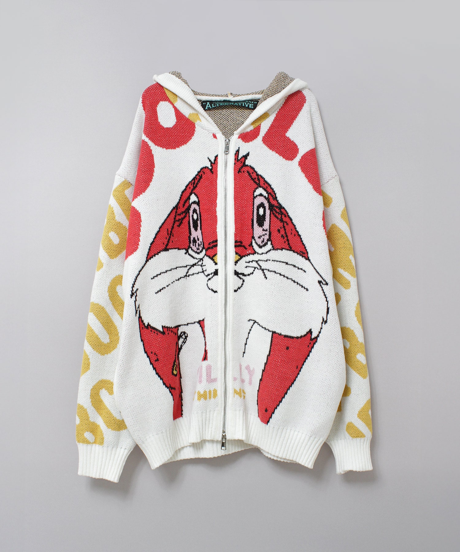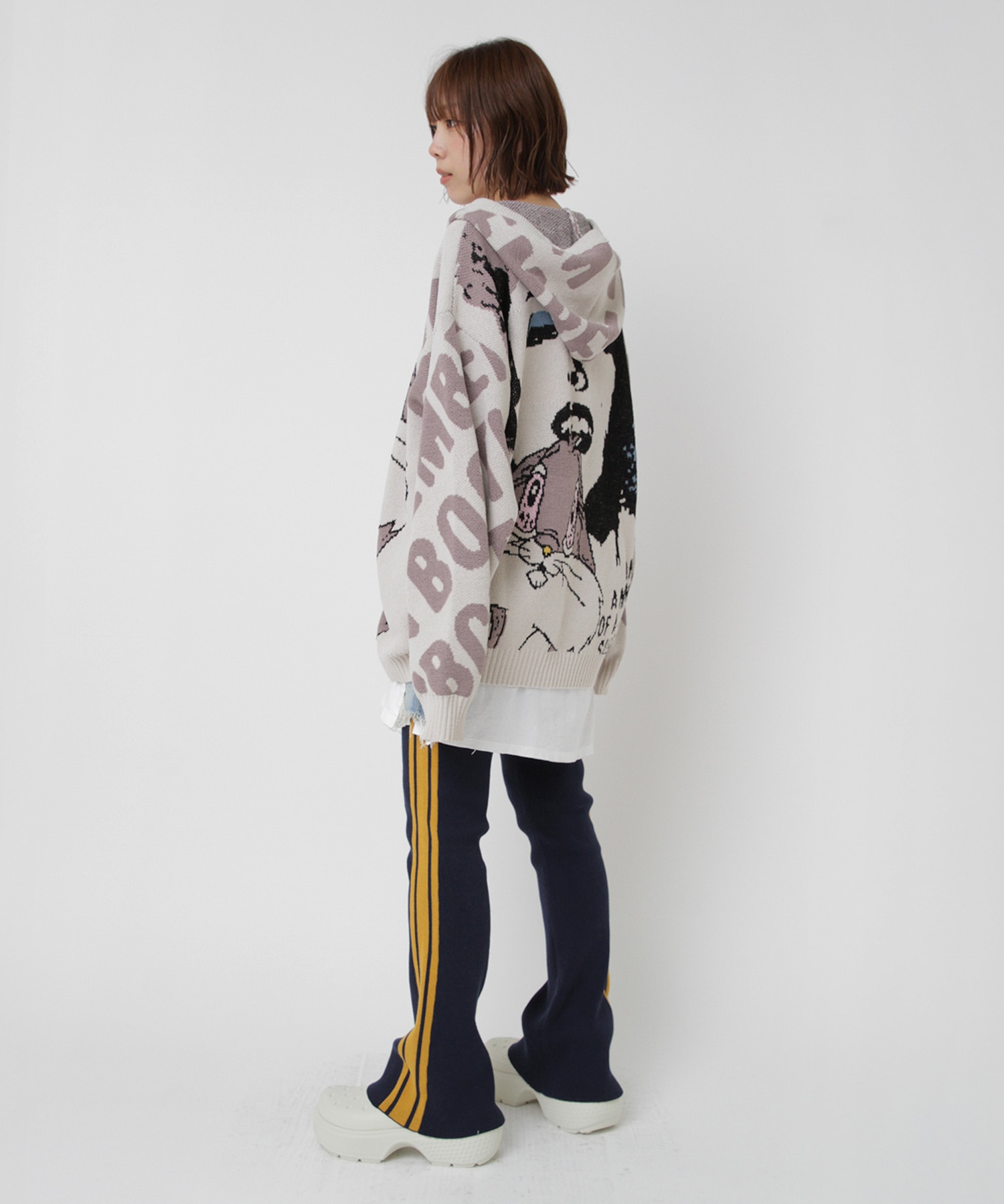 B級でキッチュなキャラをモールヤーン(短い毛足のある糸)で編み柄にしました。