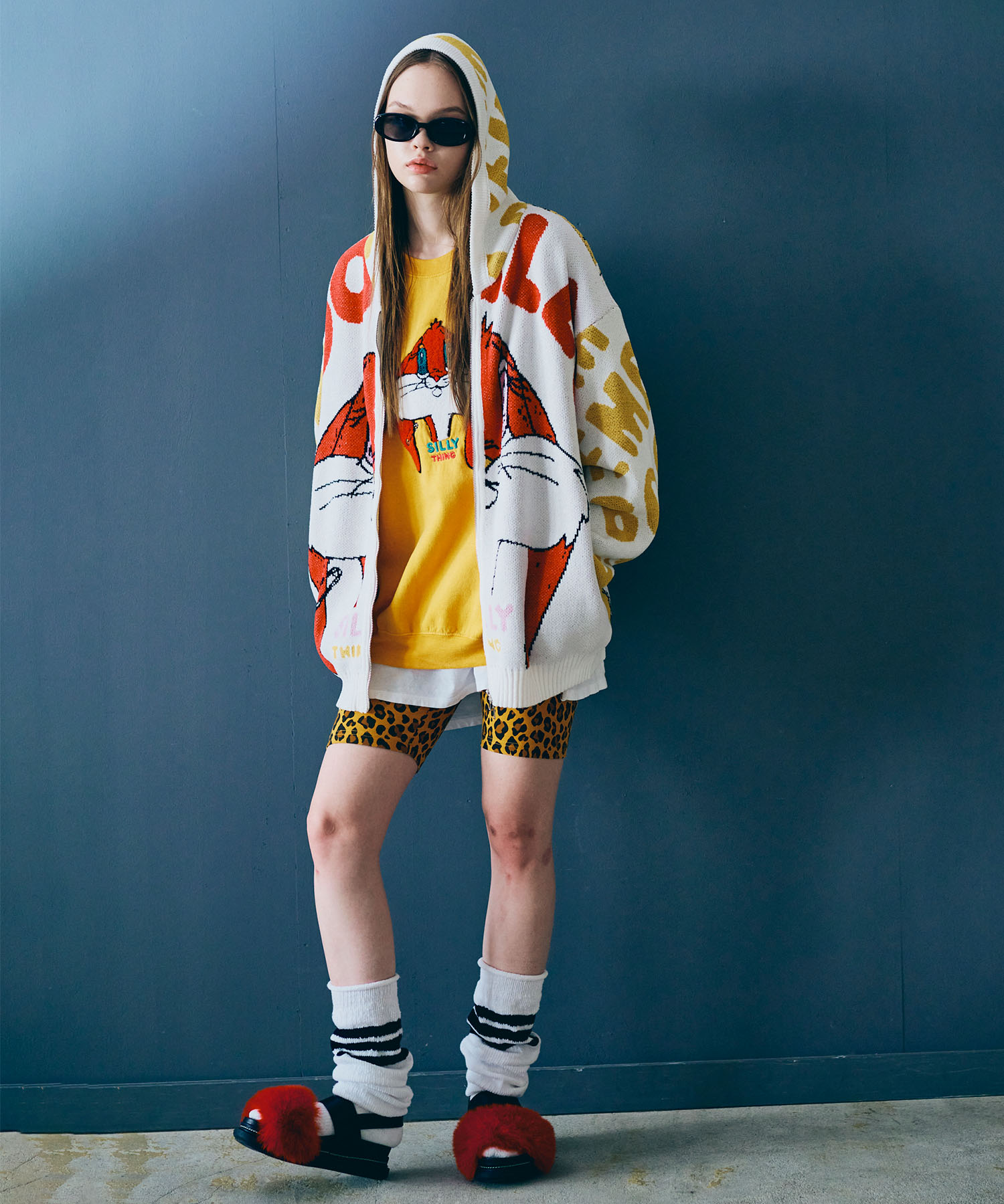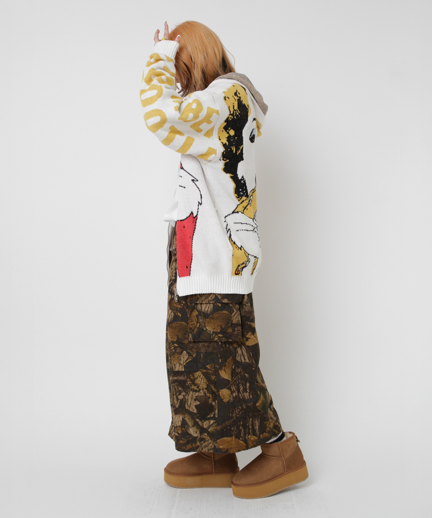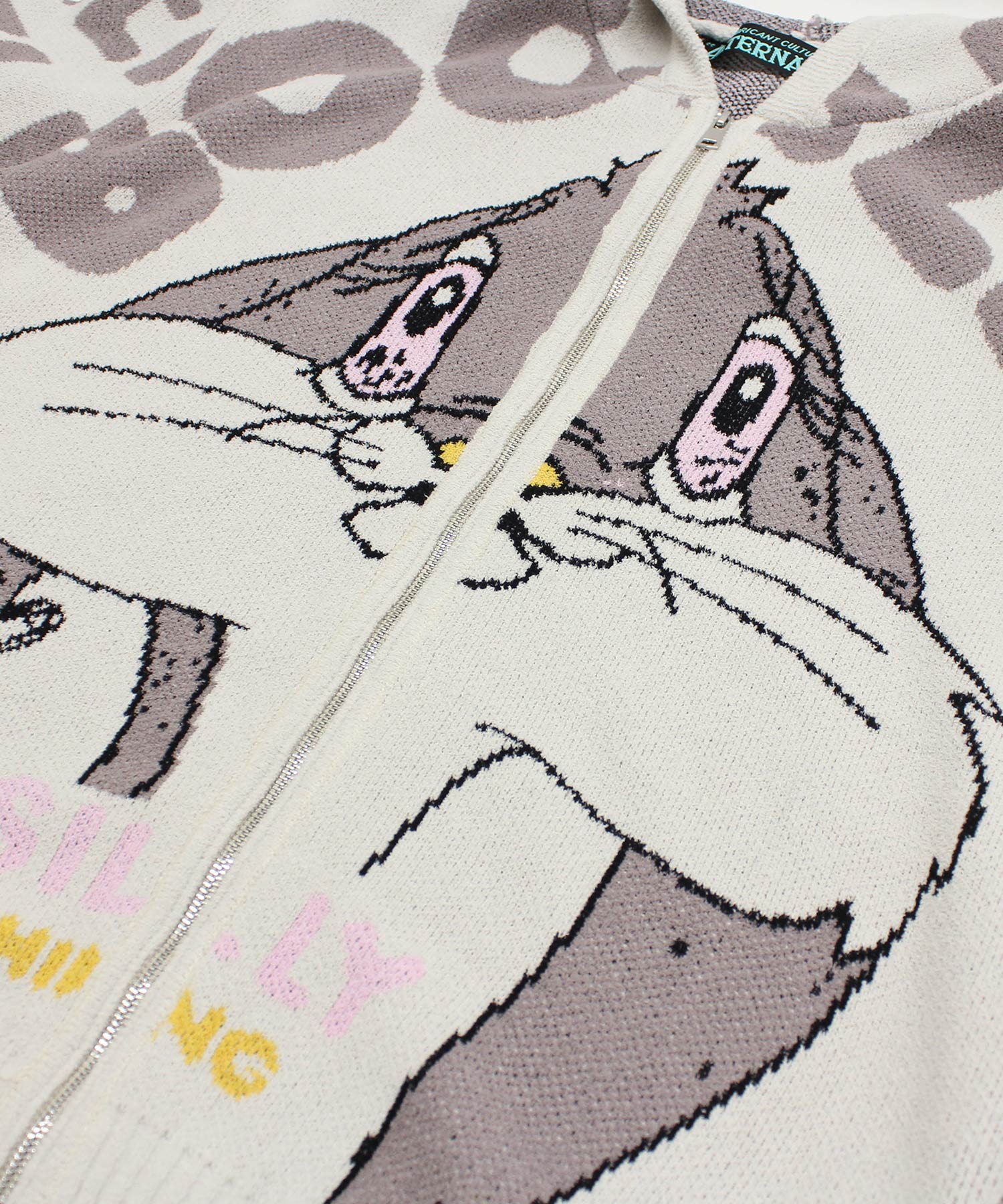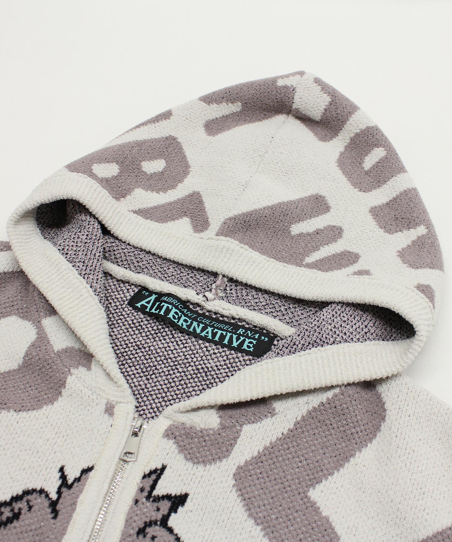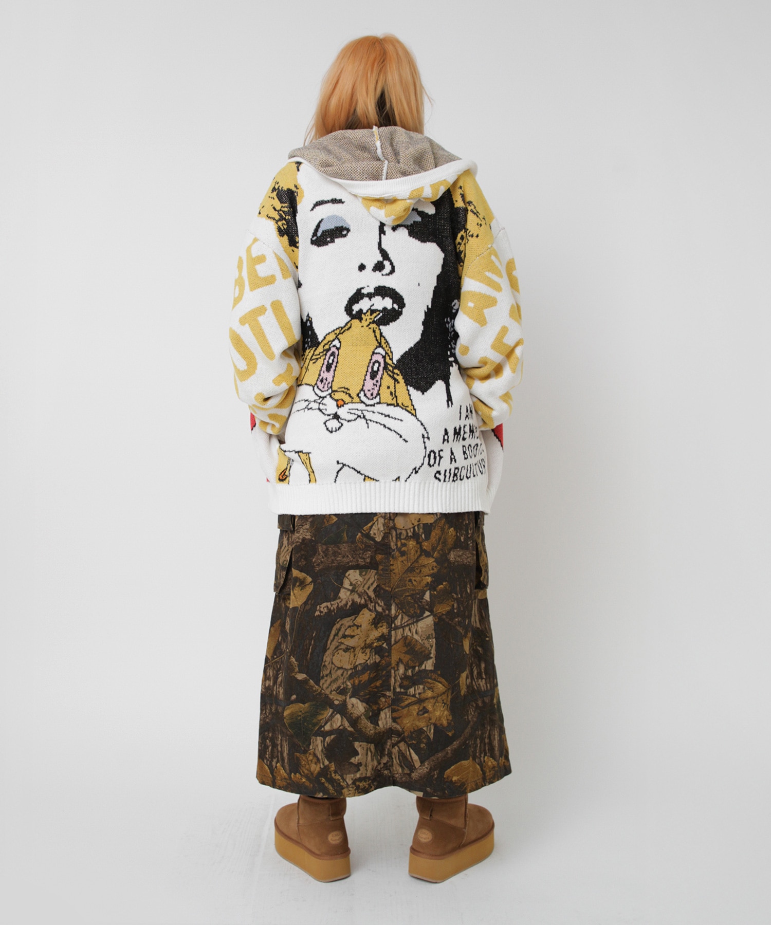B級でキッチュなキャラをモールヤーン(短い毛足のある糸)で編み柄にしました。