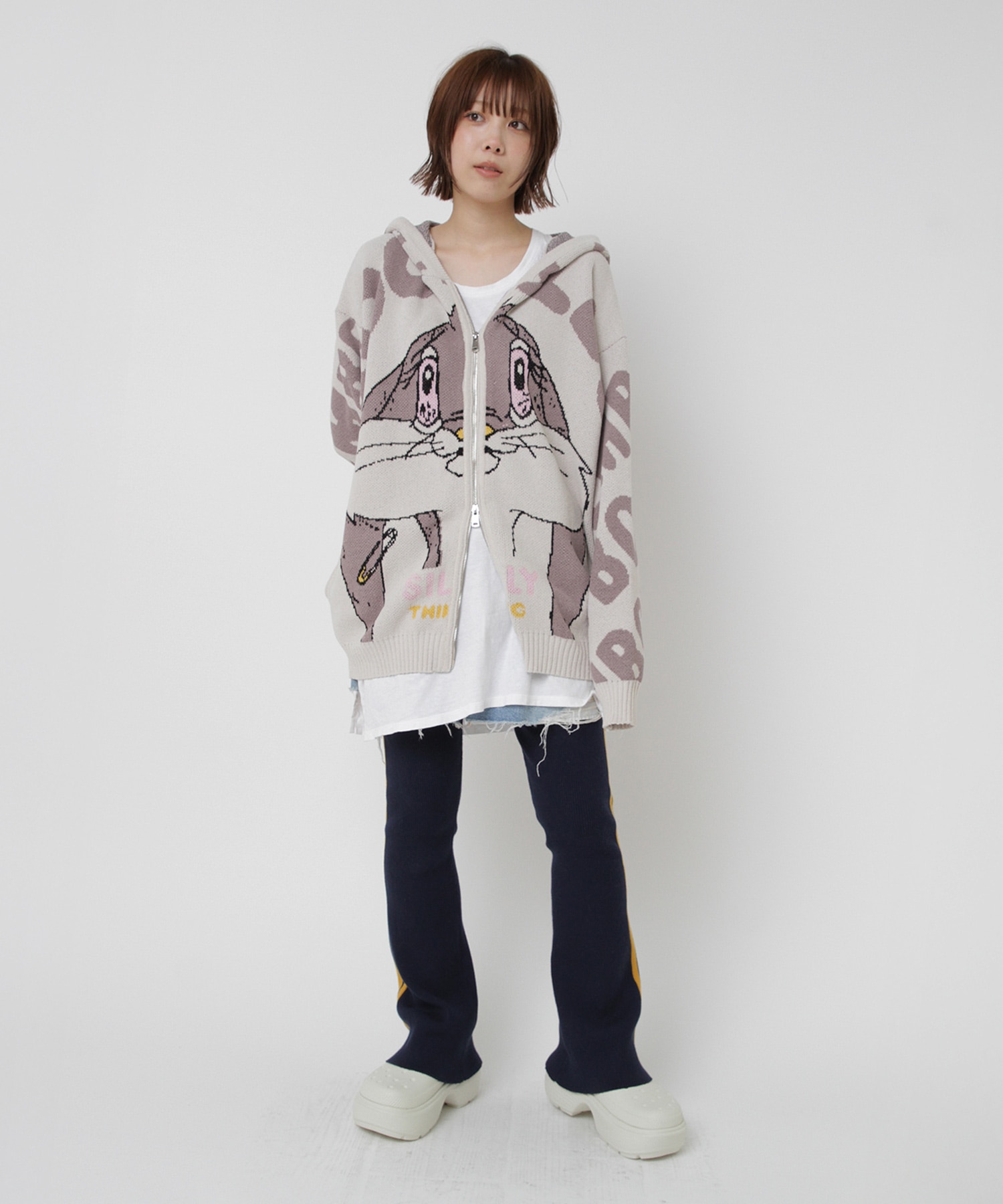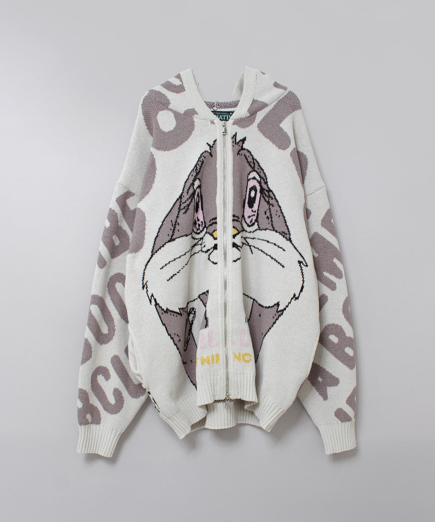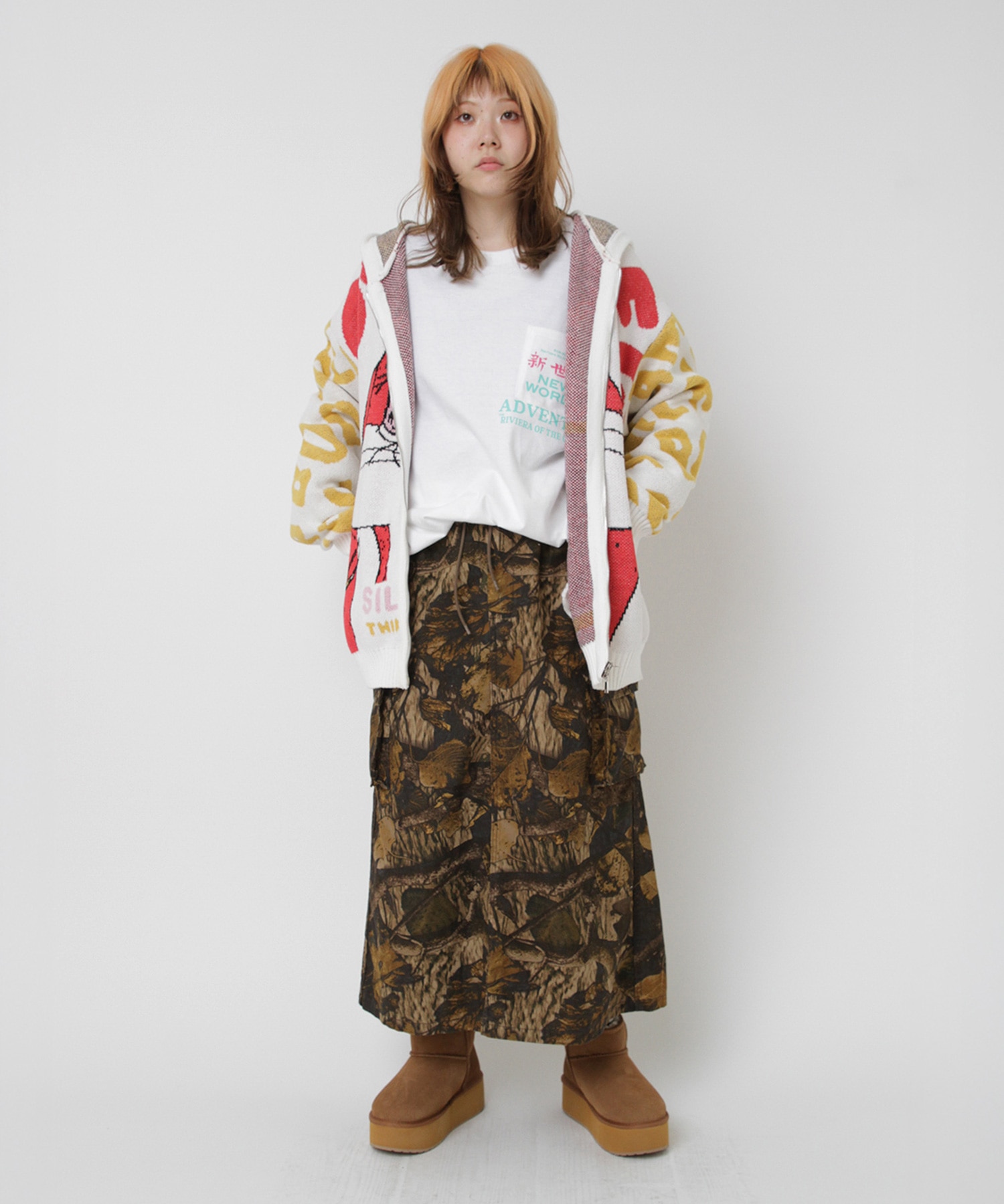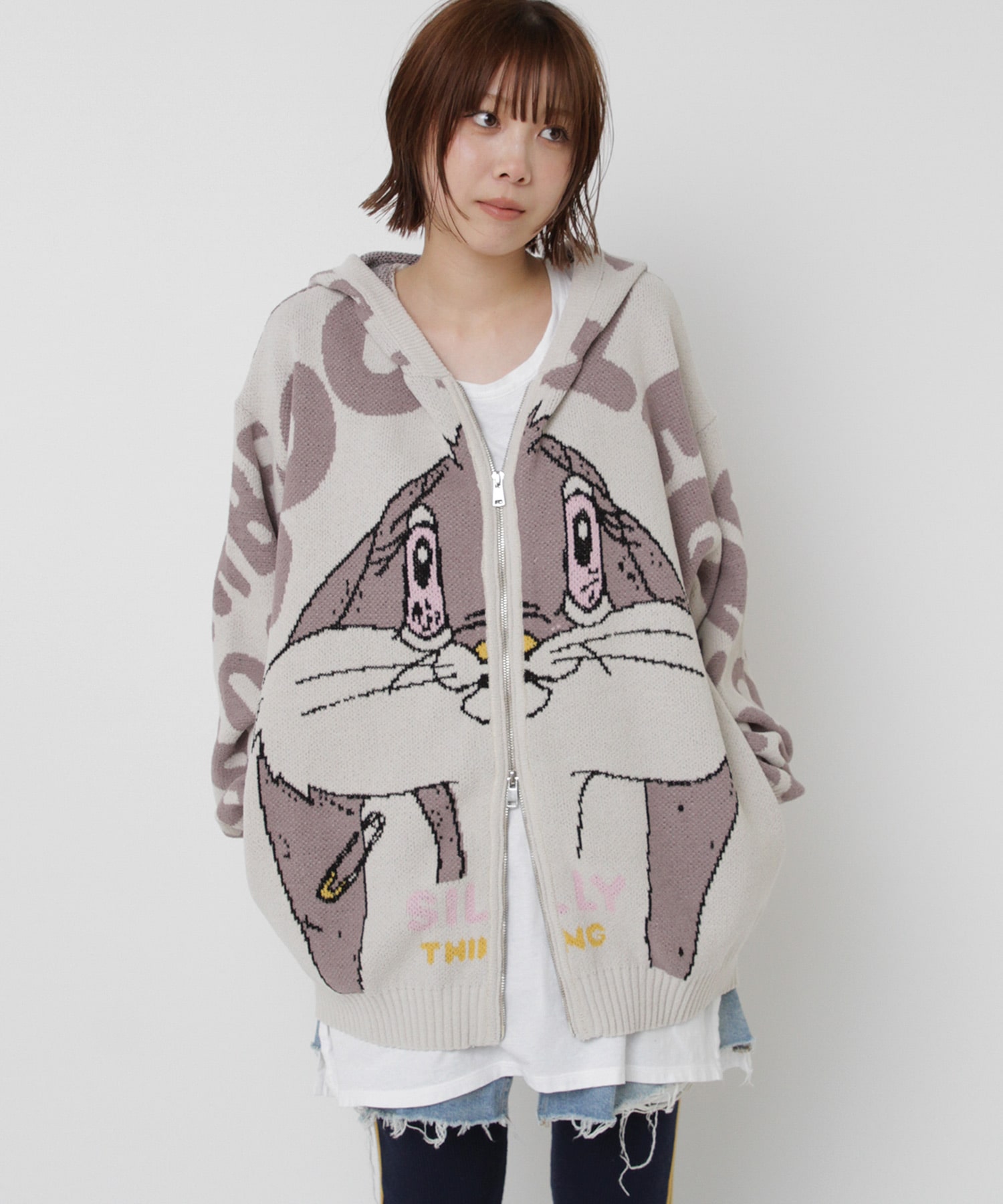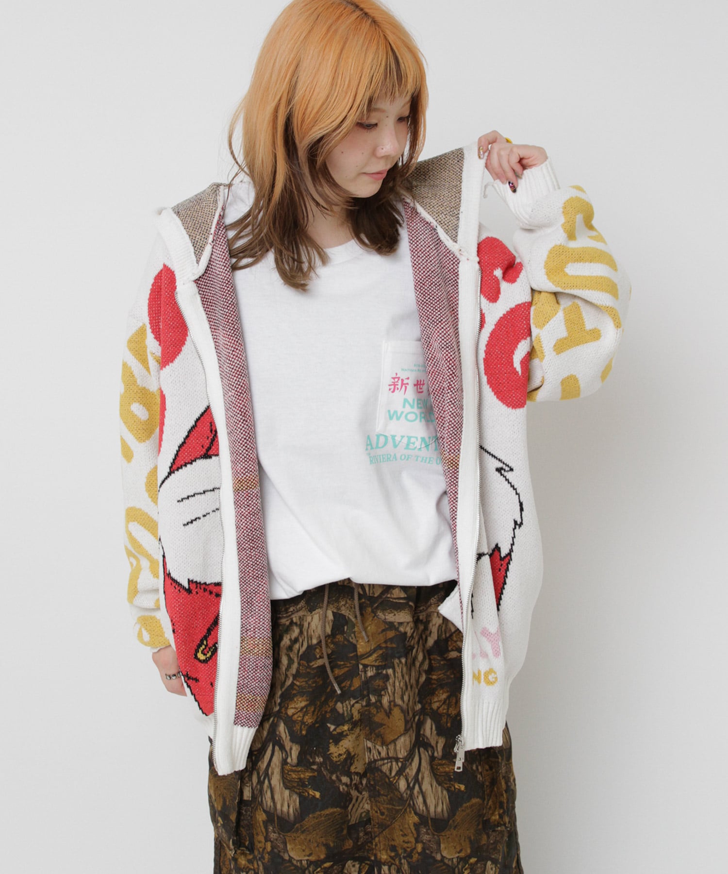 B級でキッチュなキャラをモールヤーン(短い毛足のある糸)で編み柄にしました。