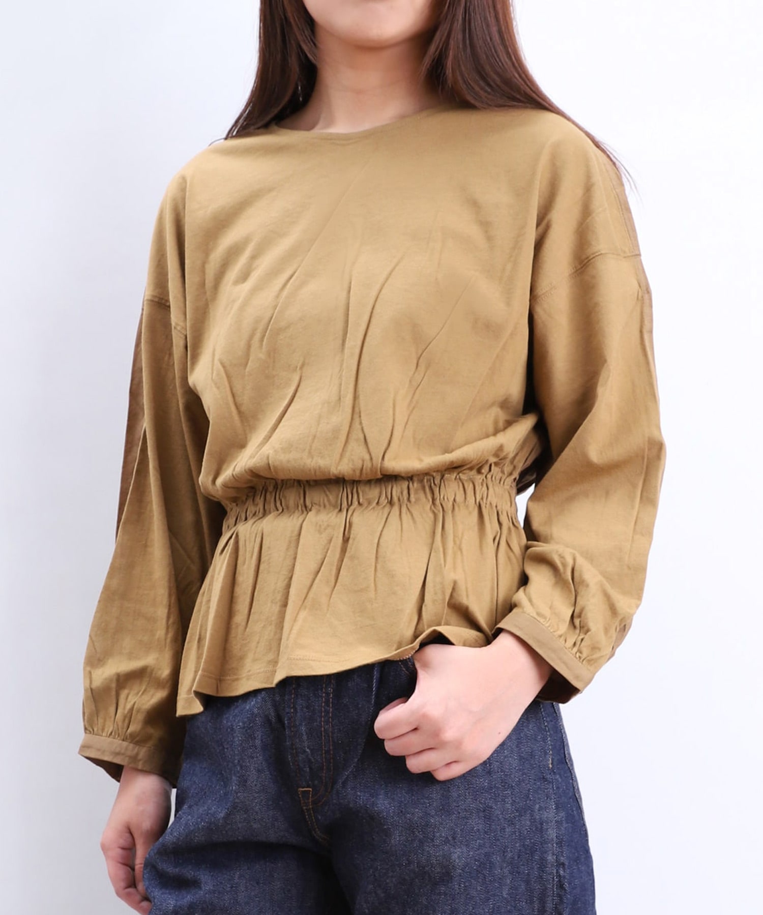 ふんわりとしたシルエットに、ウエストできゅっとメリハリをつけたデザインブラウス。