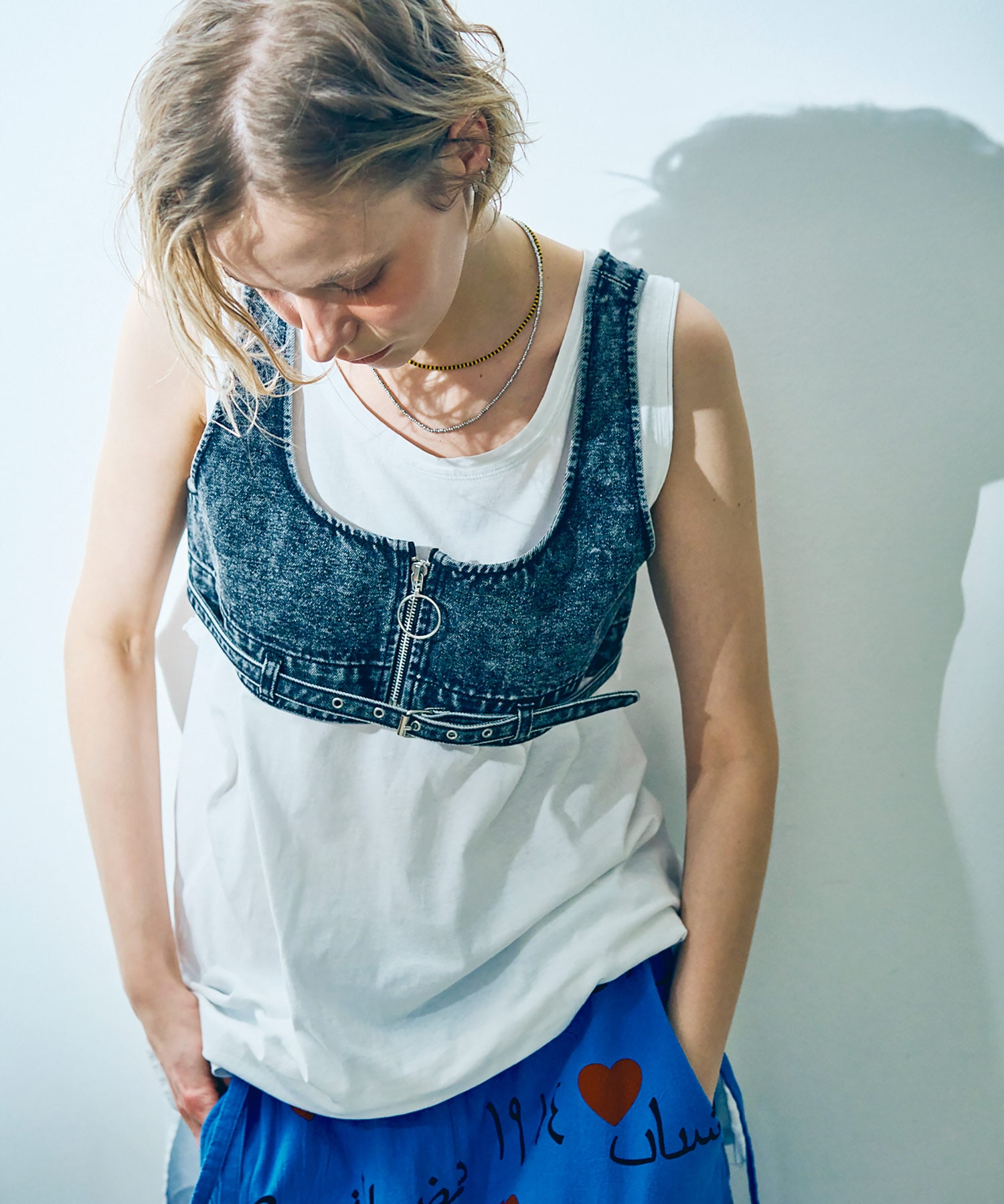衿ぐりやアームホールは裁ち切り仕様にデザインしているため、インナー使いはもちろん、タンクトップとして1枚での着こなしも決まります。生地感:柔らかな薄手の生地