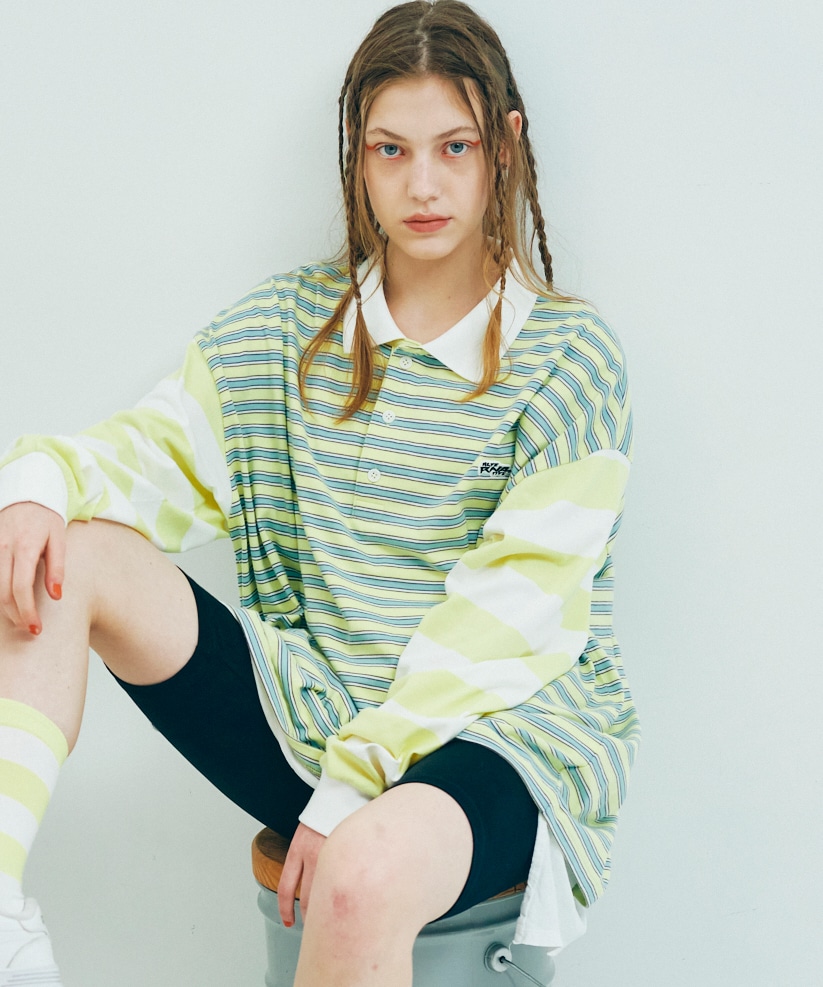 身頃と袖が別の柄のボーダーコンビポロロンT