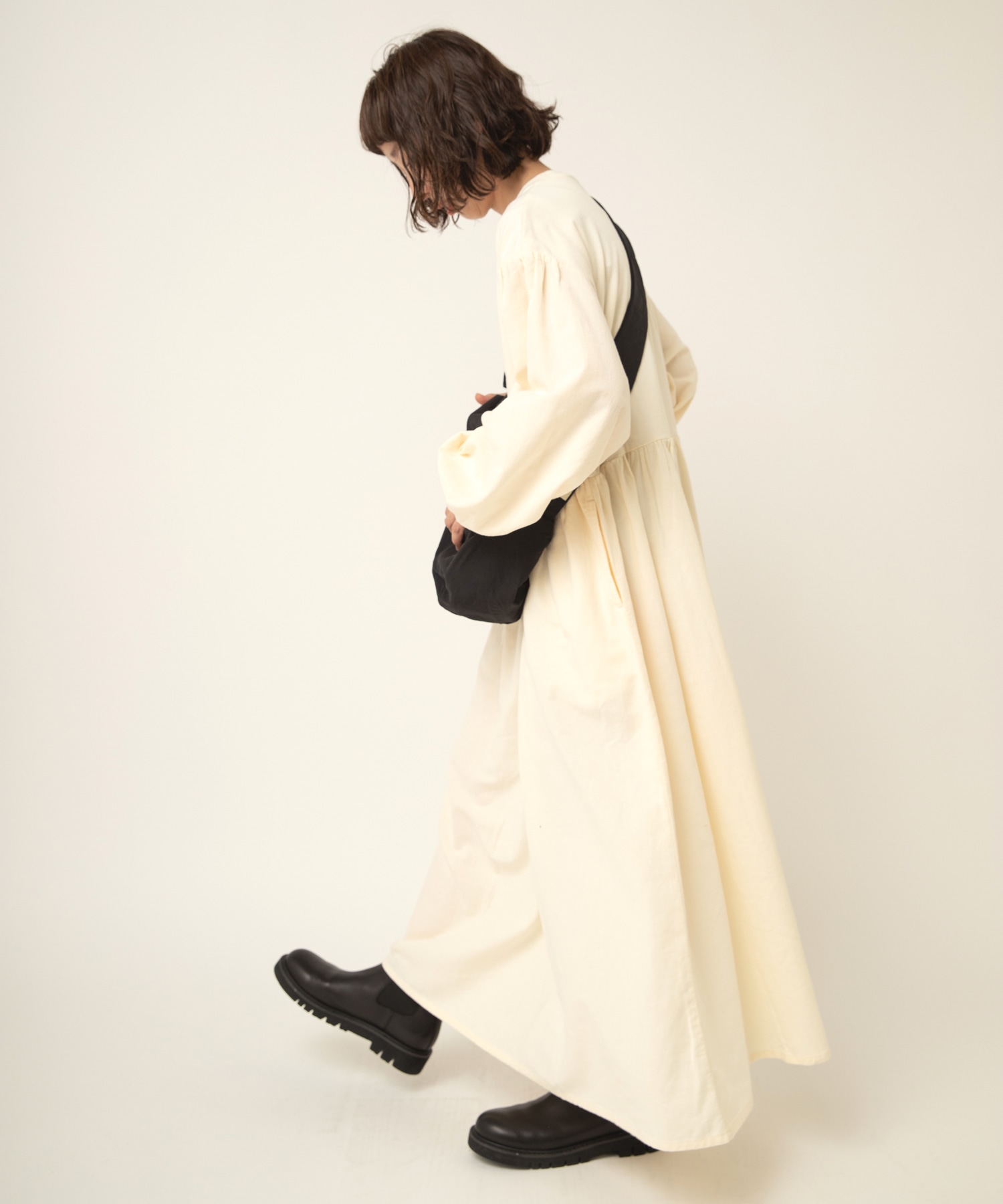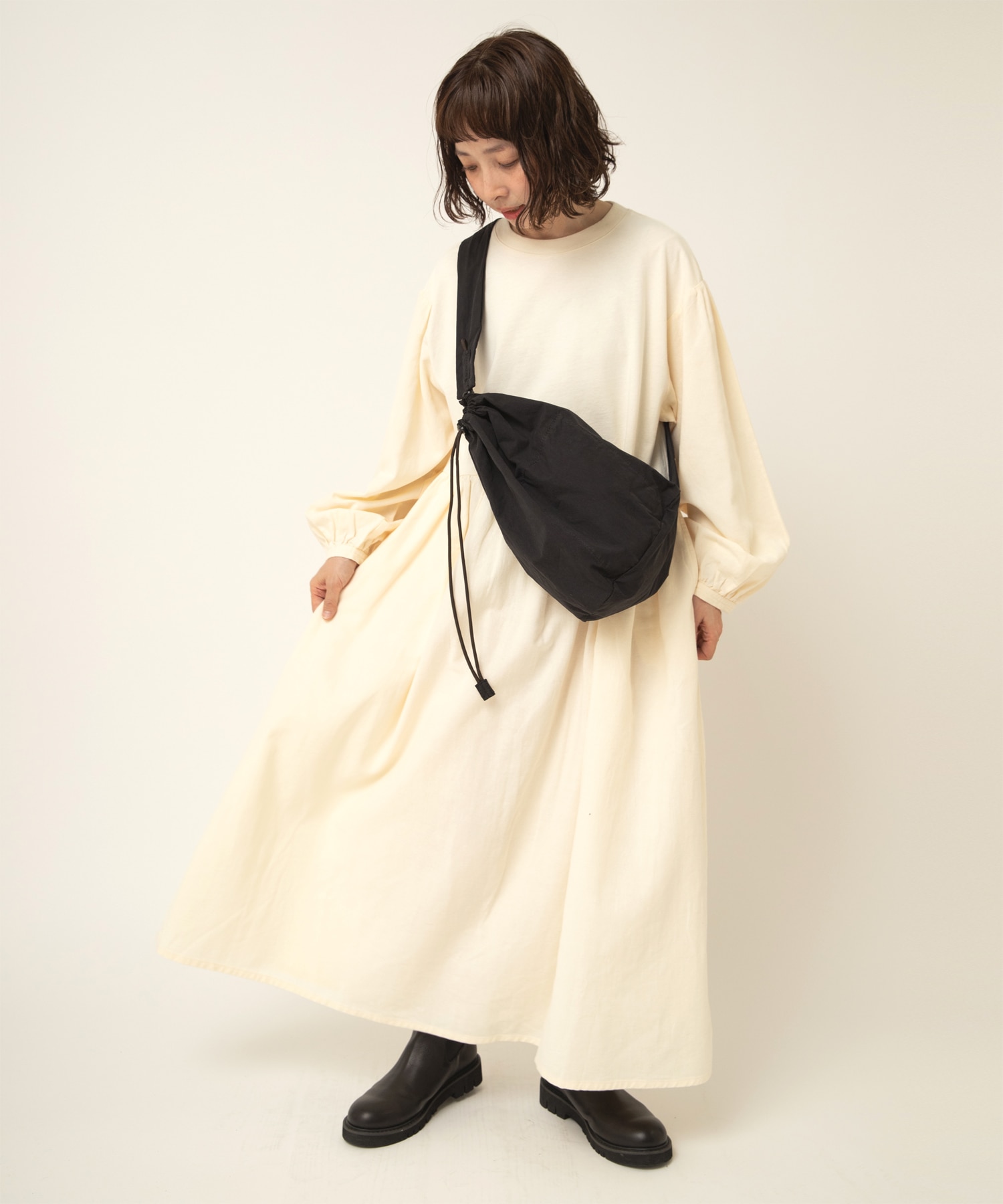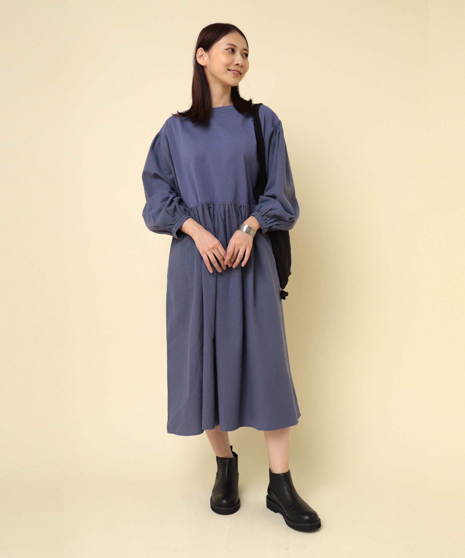 着丈はミドル丈なので、裾からボトムをのぞかせても、一枚で着用するのも、どちらにも対応できます。