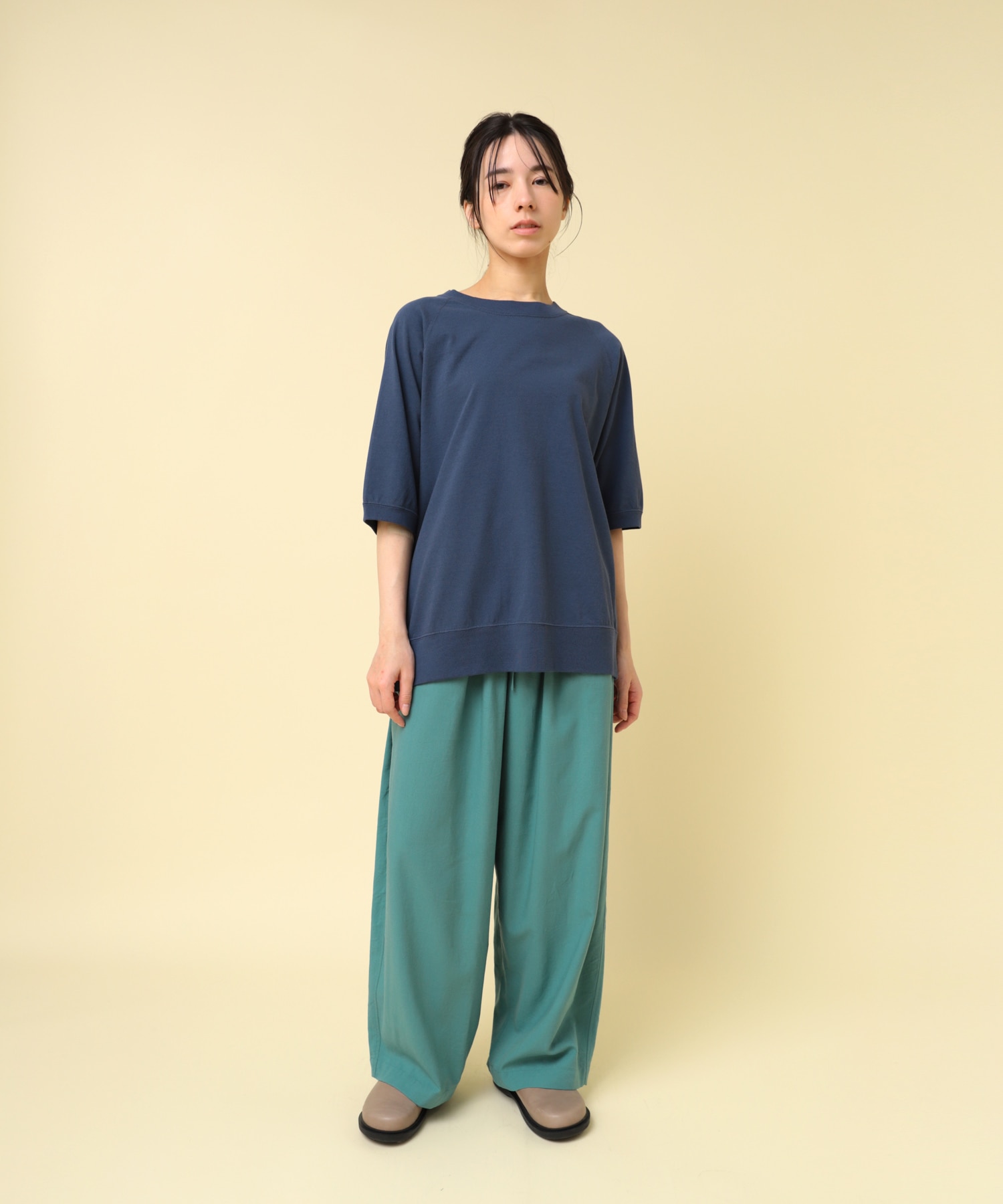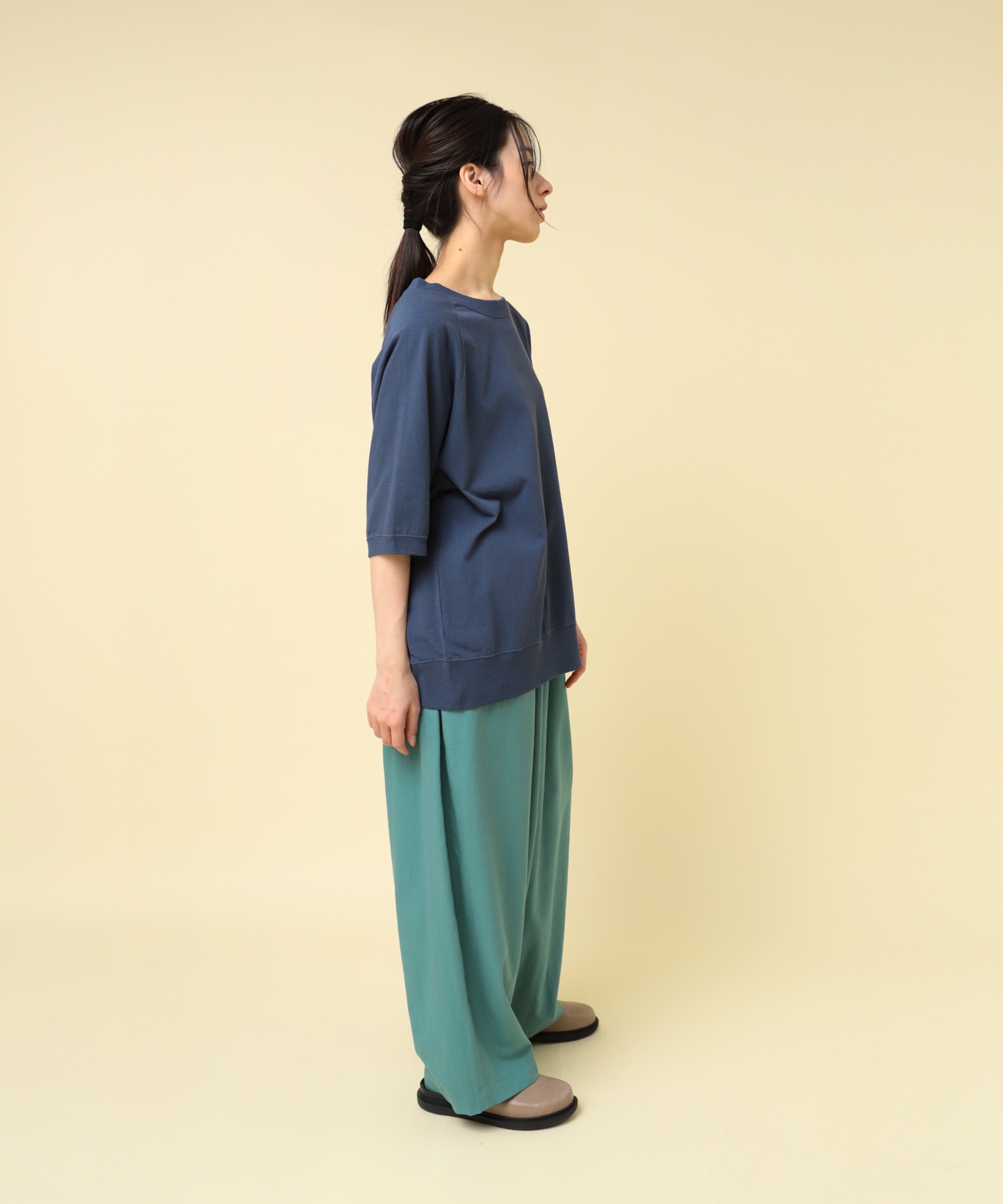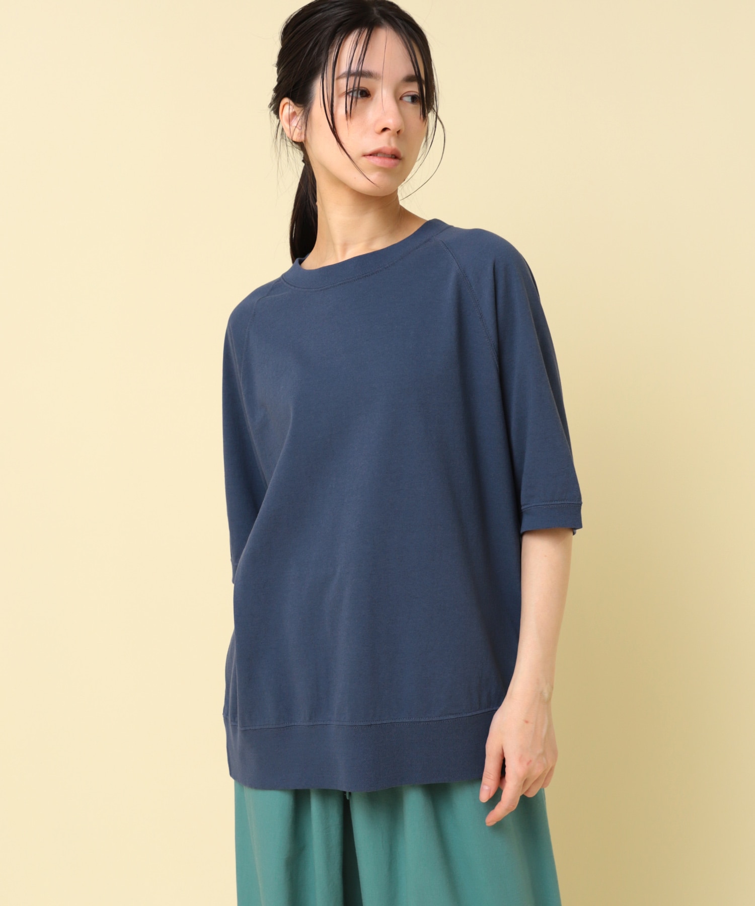 少し長めの着丈と締め付け過ぎない裾リブがとても着やすい一枚。