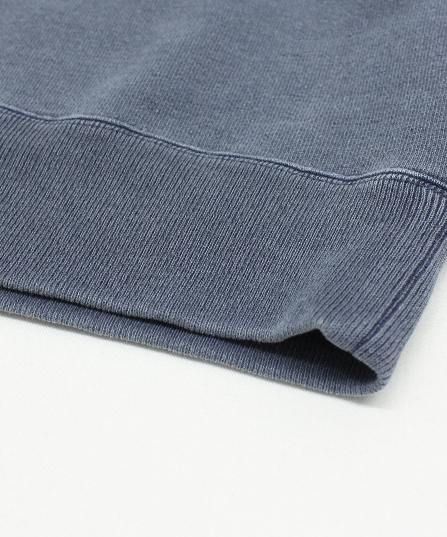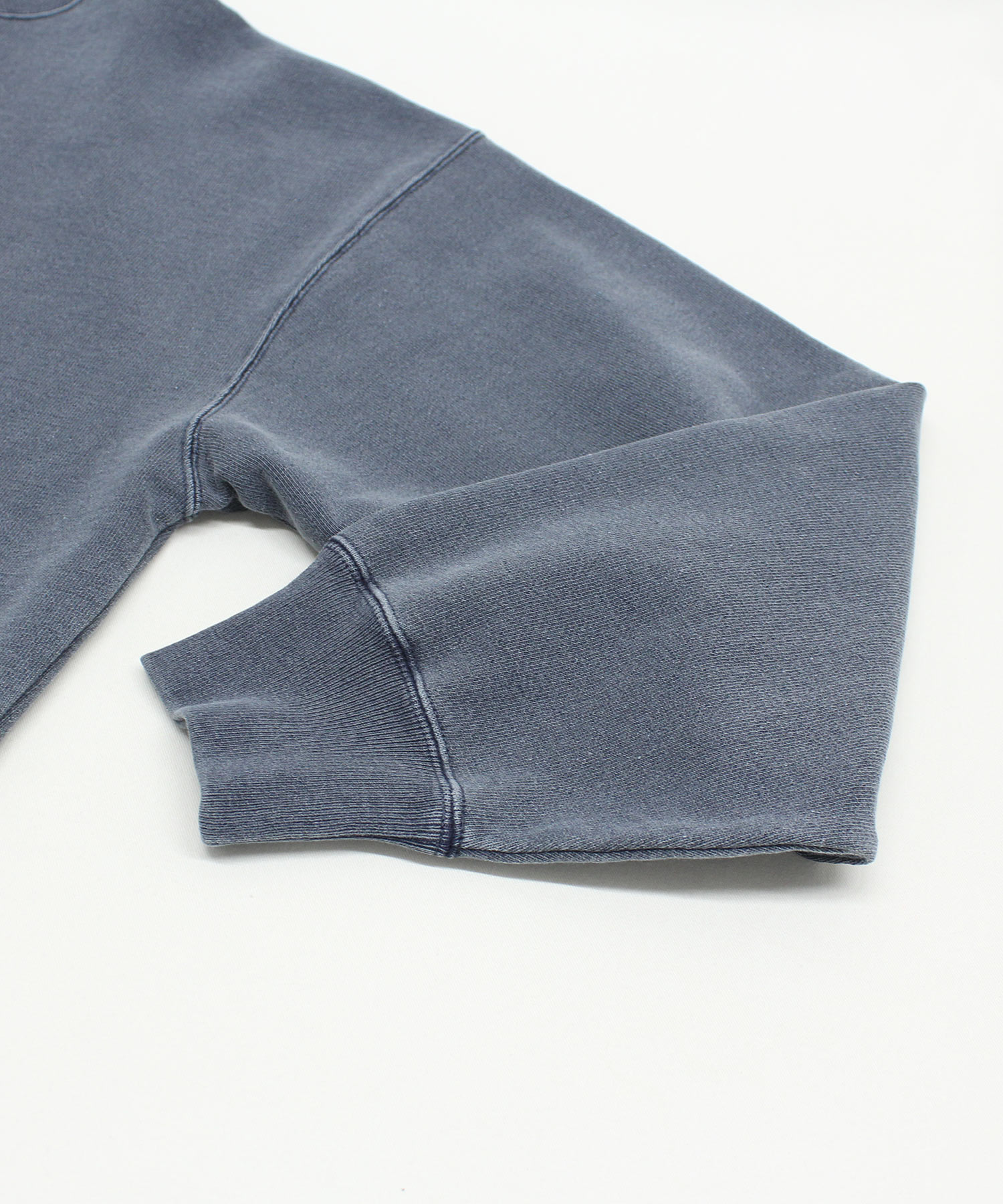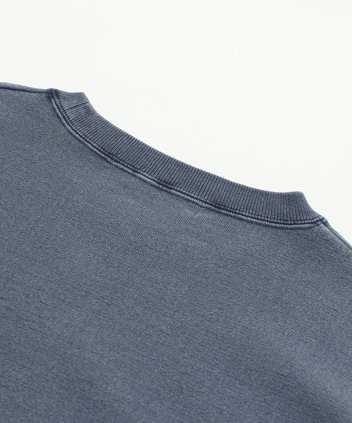 太番手のオープンエンド糸特有のうねりがピグメントの色落ちと色溜まりを際立たせより古着ライクな仕上がりになっています。