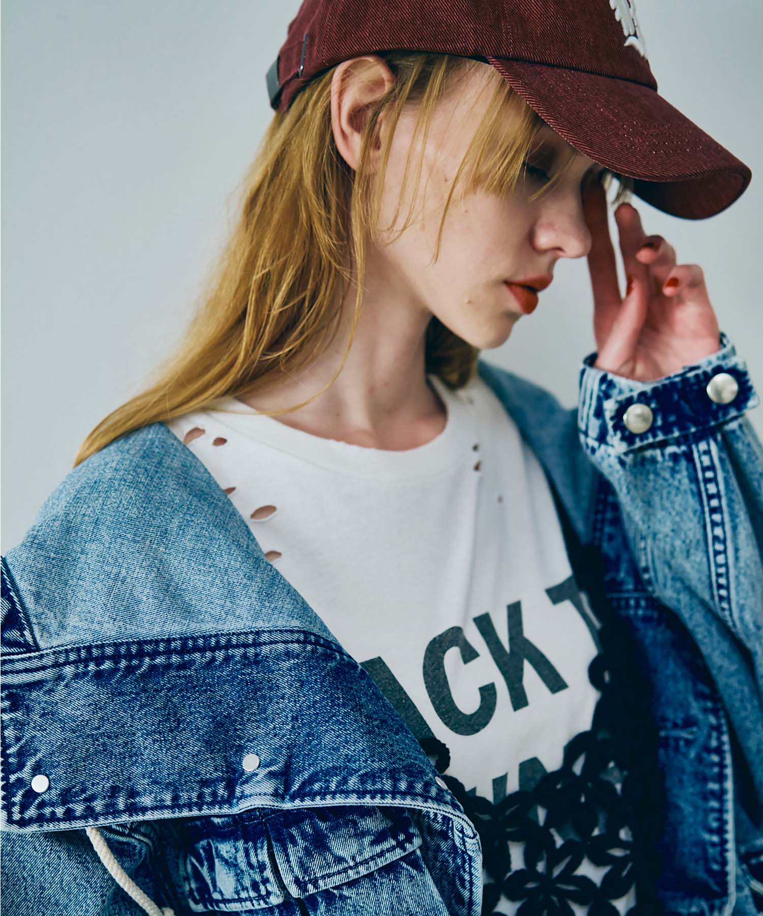 リメイクやダメージを肩の力が抜けたようなラフな雰囲気を出すために、柔らかい風合いのリサイクル天竺を使用しています。
