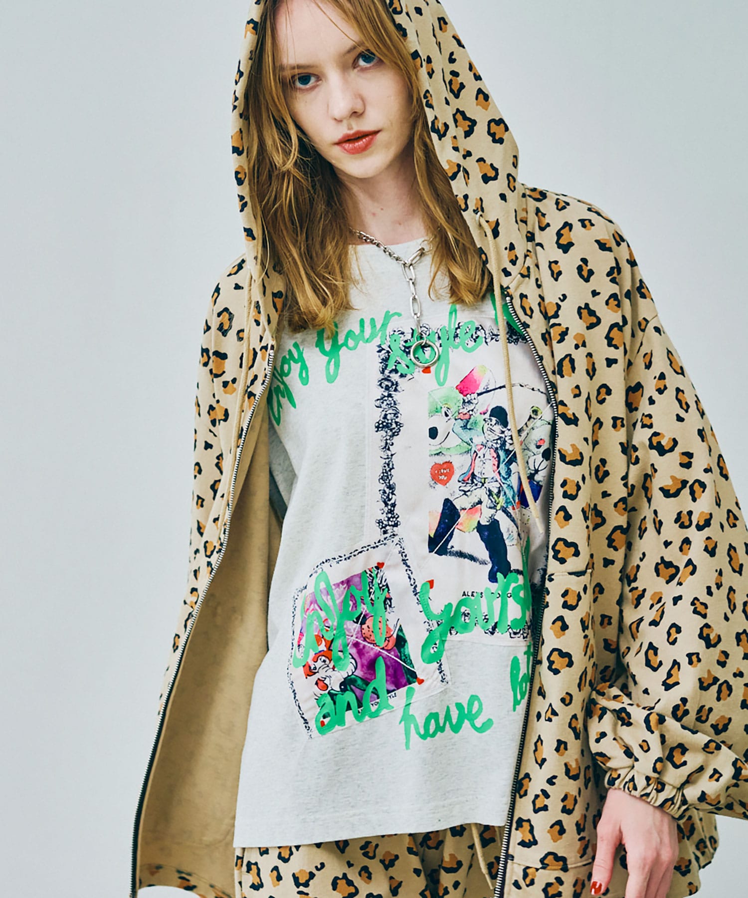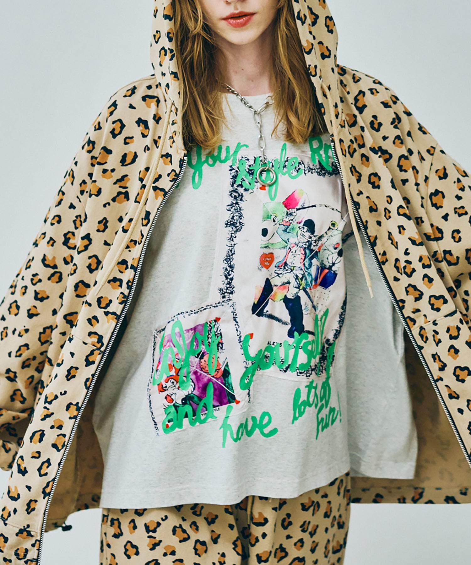 フロントには光沢感のある大きなパッチを大胆にあしらい、その上からシルクスクリーンプリントでアクセントを加えています。