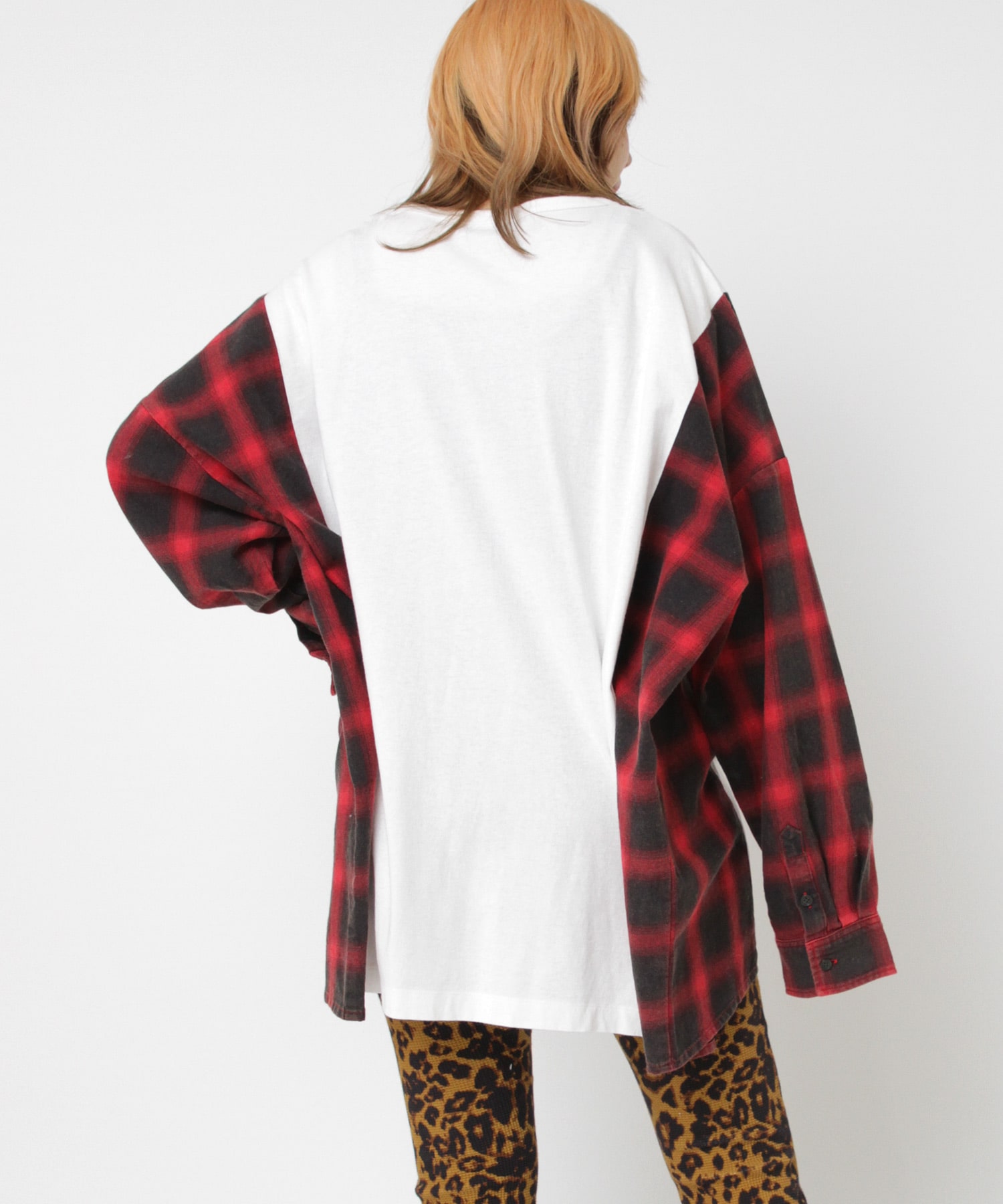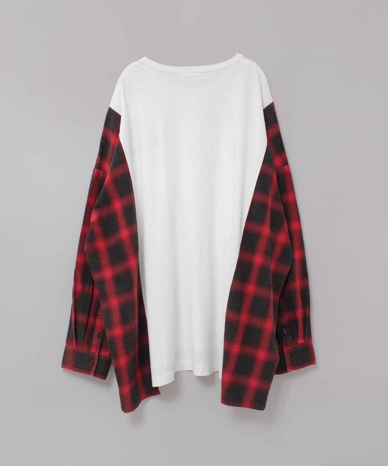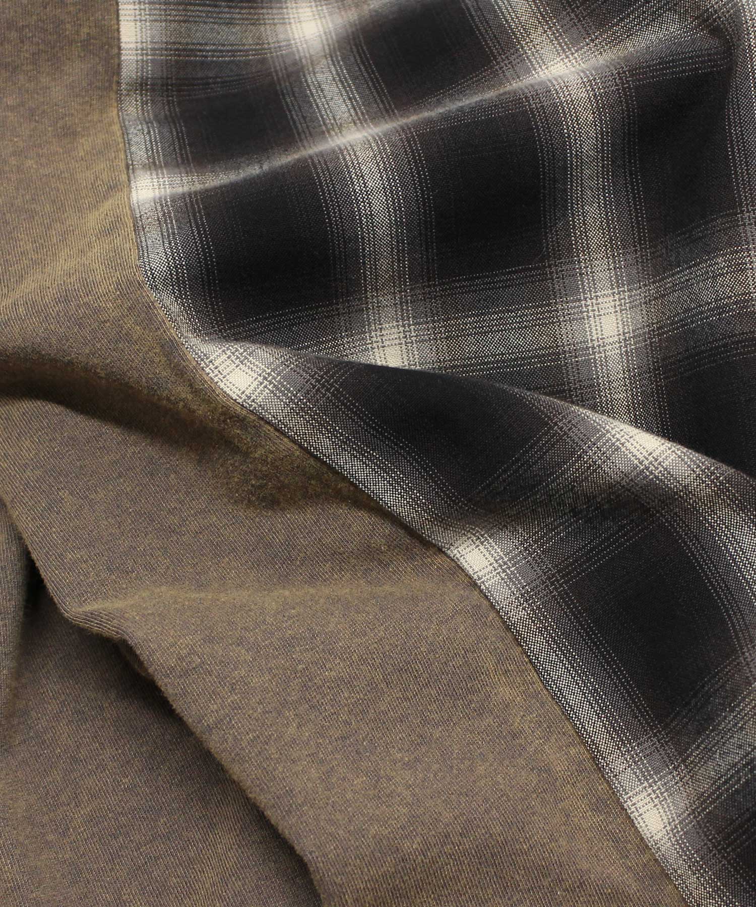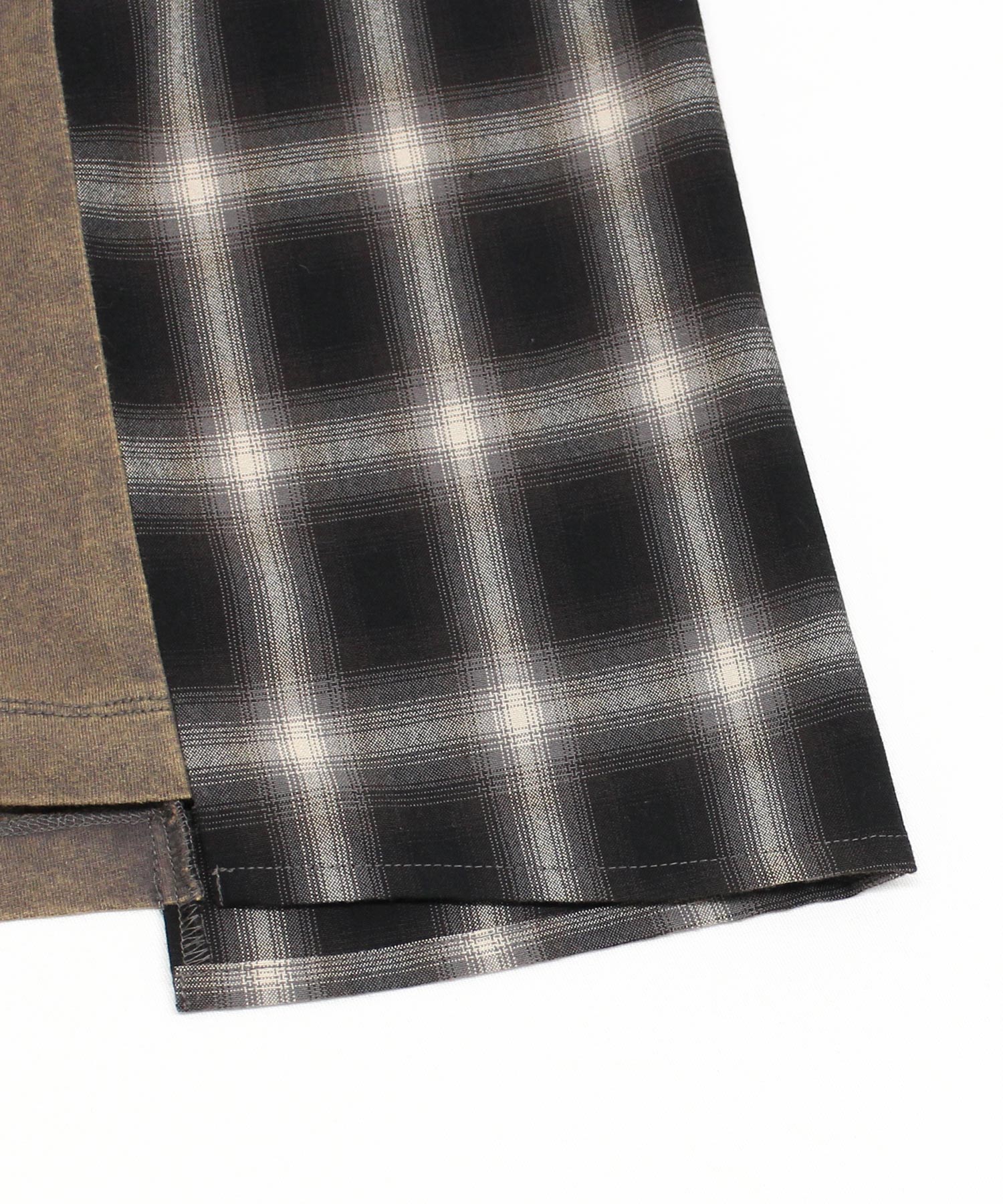 Tシャツベースチェックシャツを切り替えて、縫い合わせたようなデザインが一枚で着映えのするアイテム。