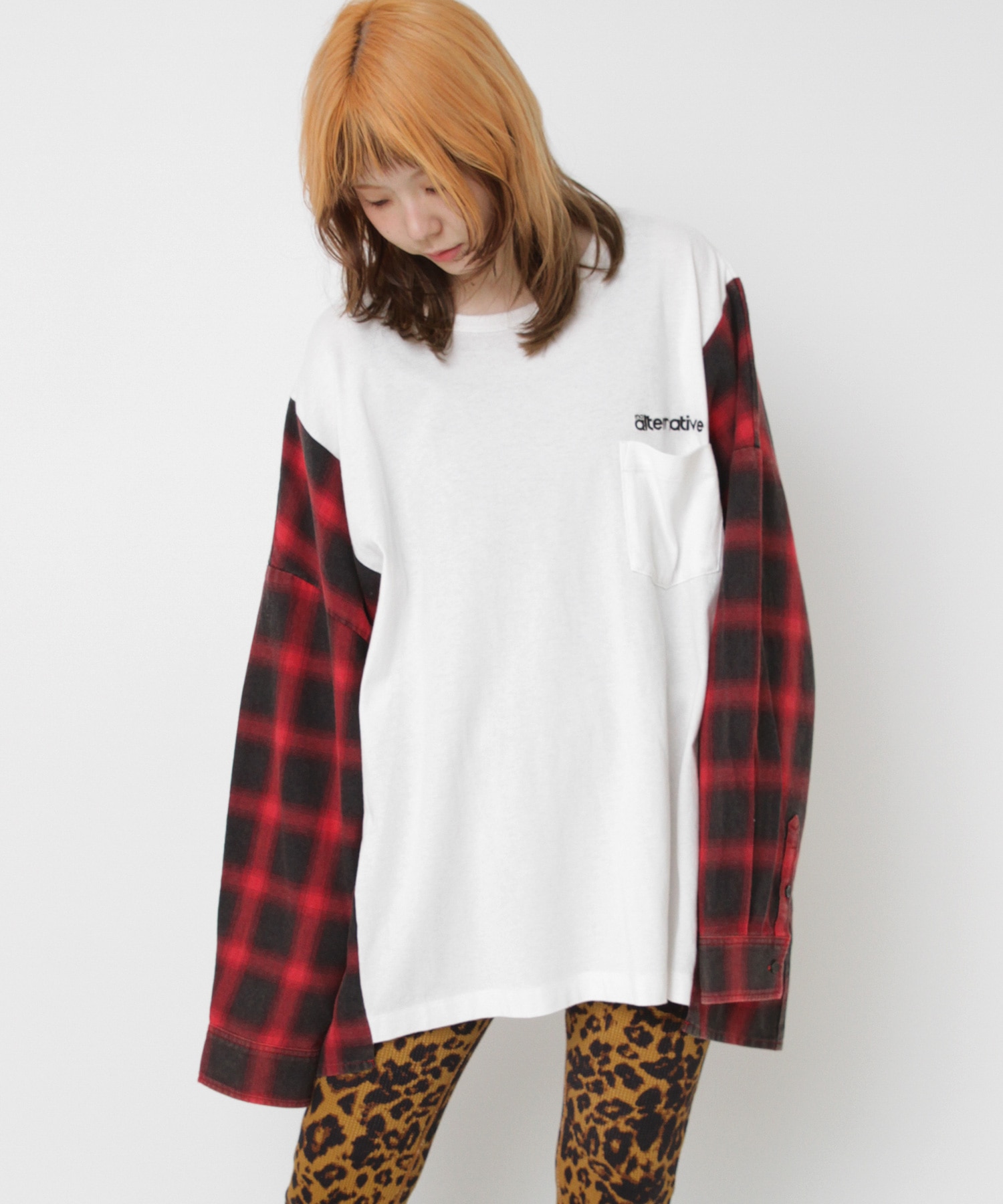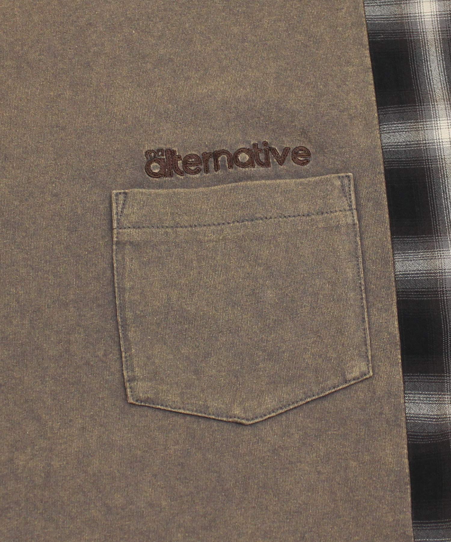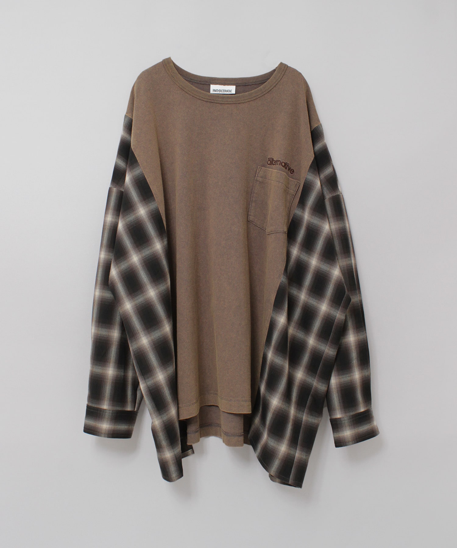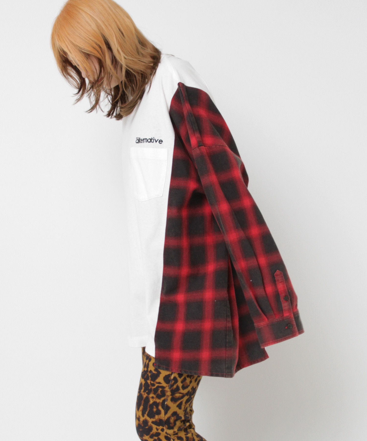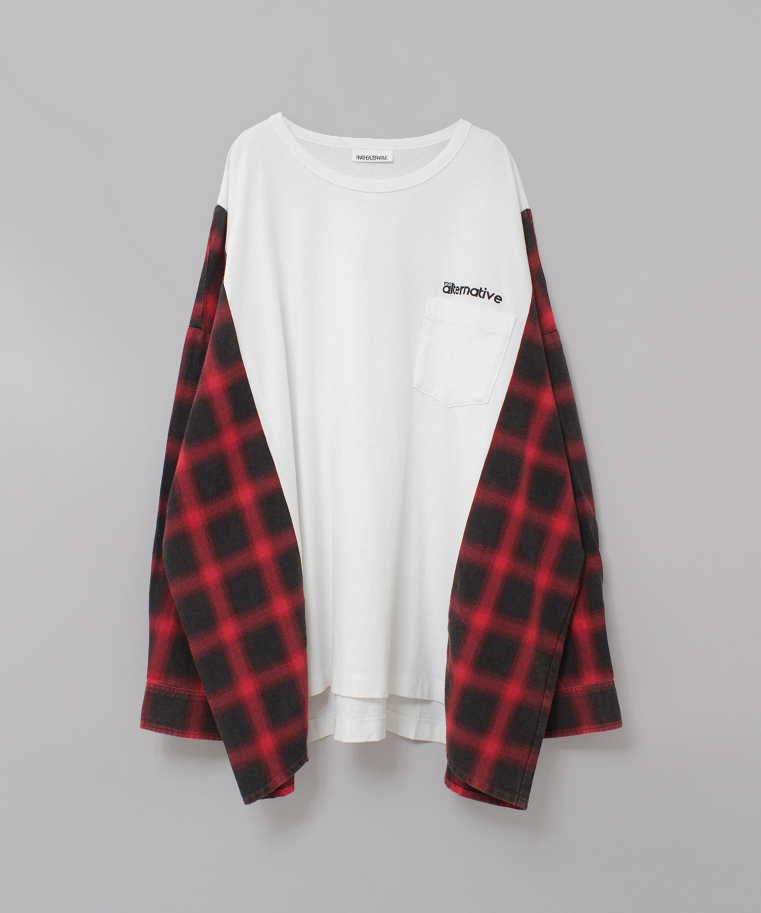 Tシャツベースチェックシャツを切り替えて、縫い合わせたようなデザインが一枚で着映えのするアイテム。