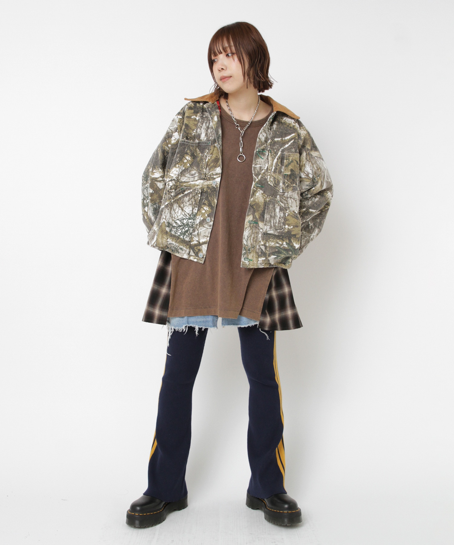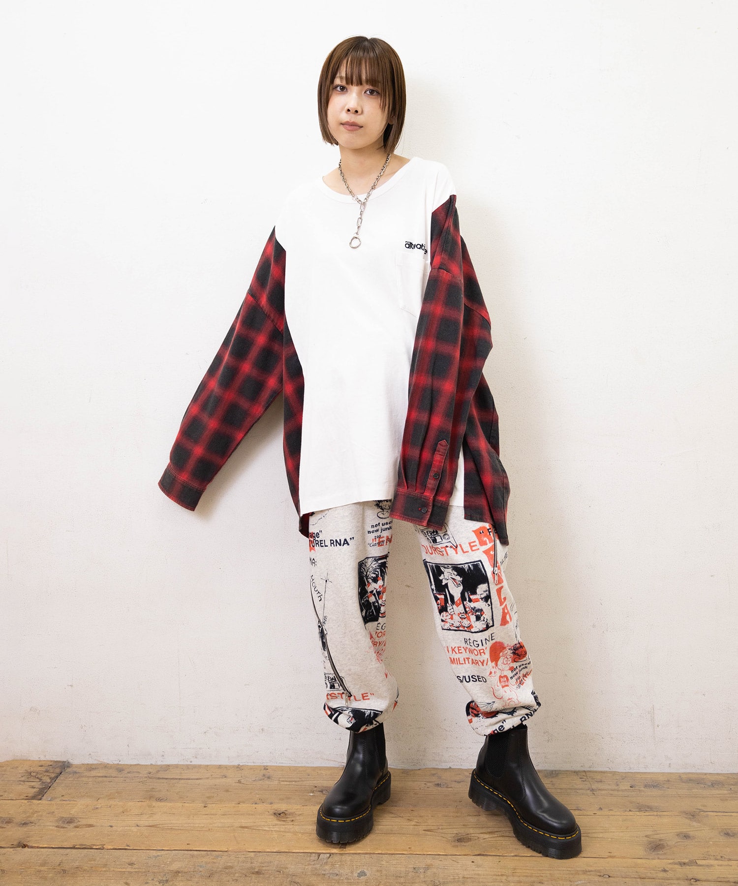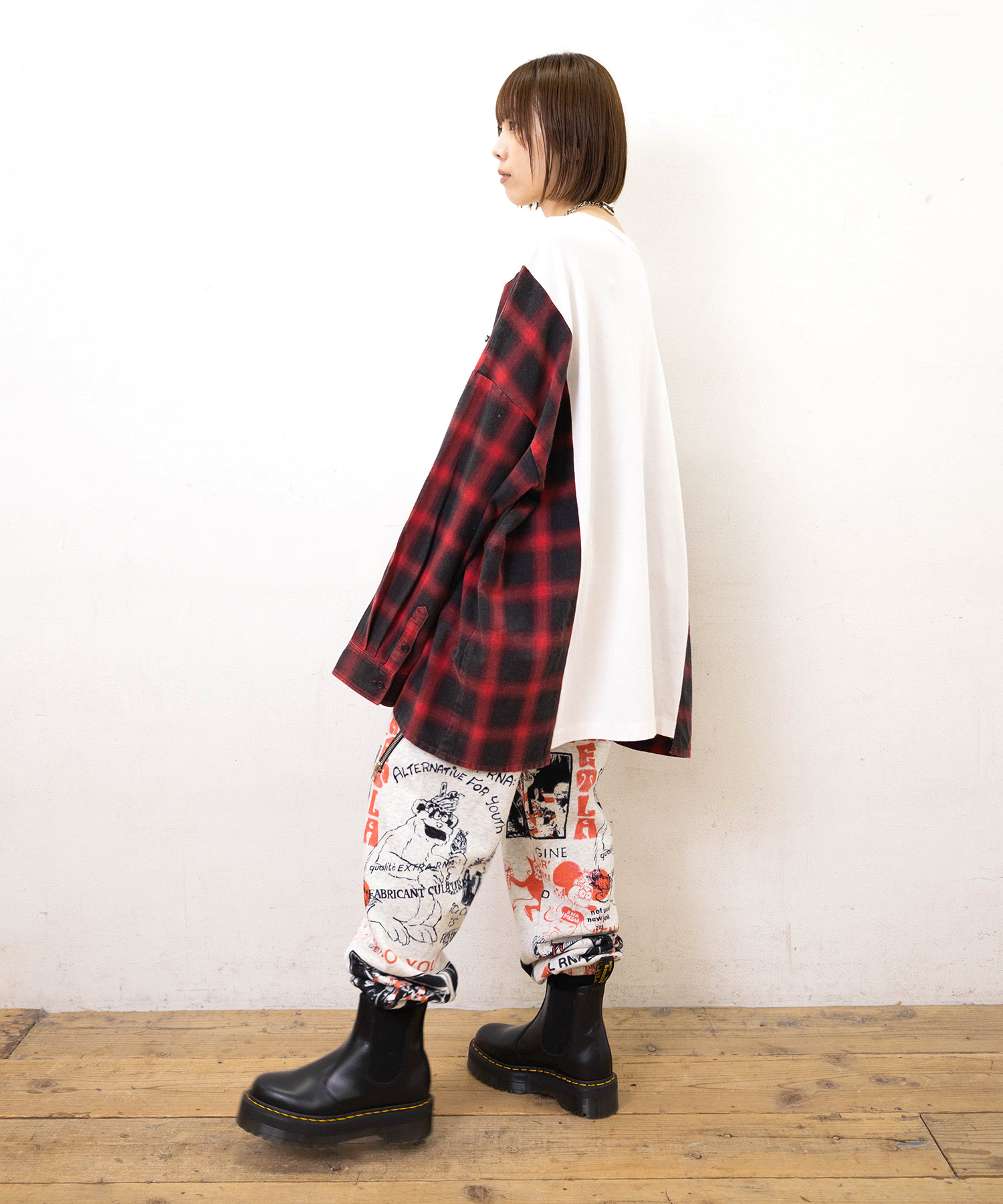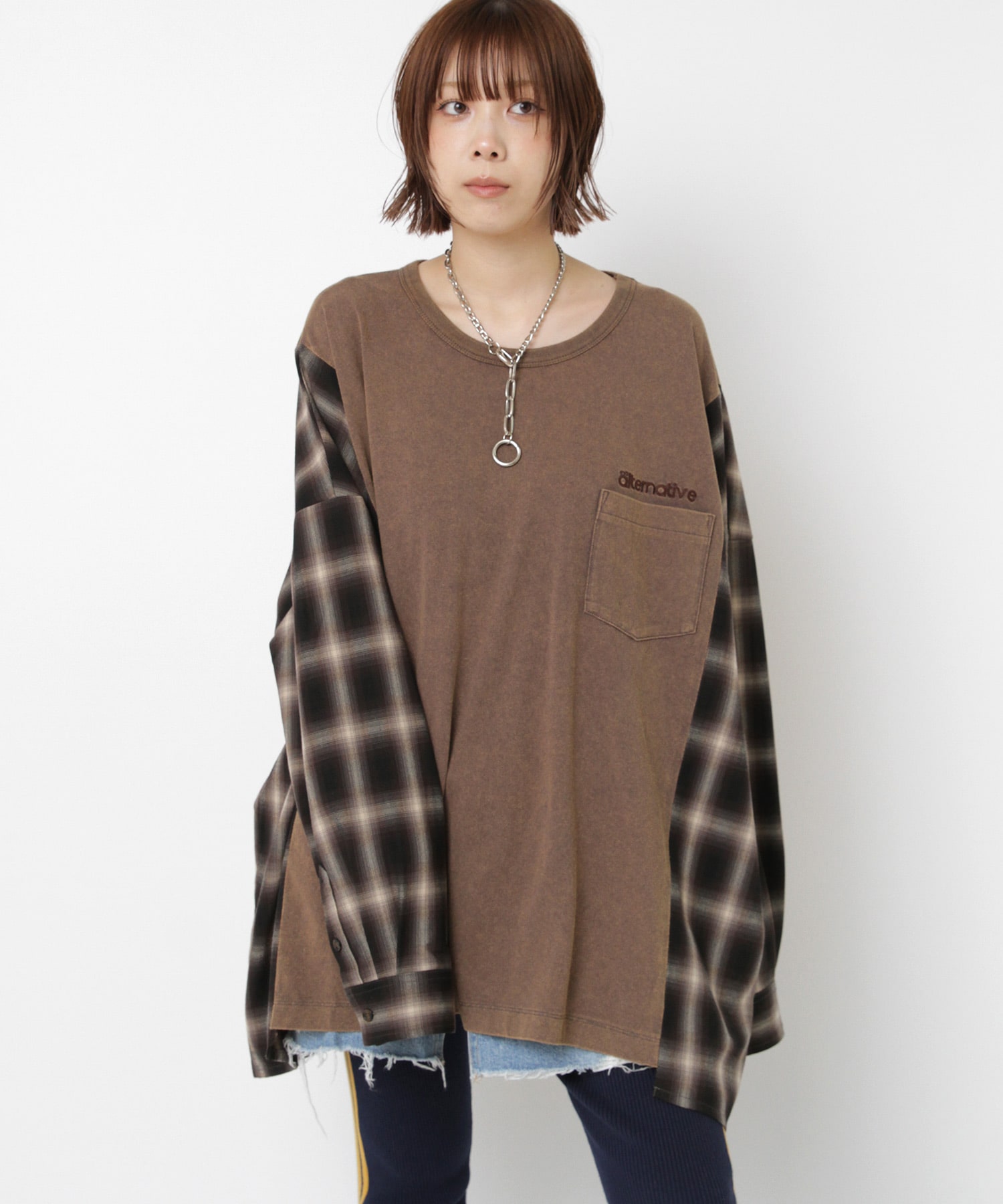 Tシャツベースチェックシャツを切り替えて、縫い合わせたようなデザインが一枚で着映えのするアイテム。