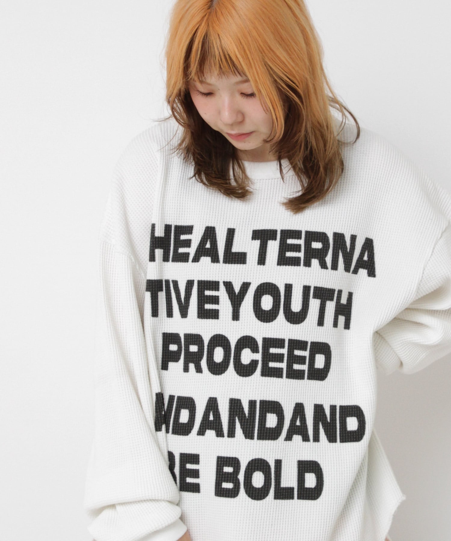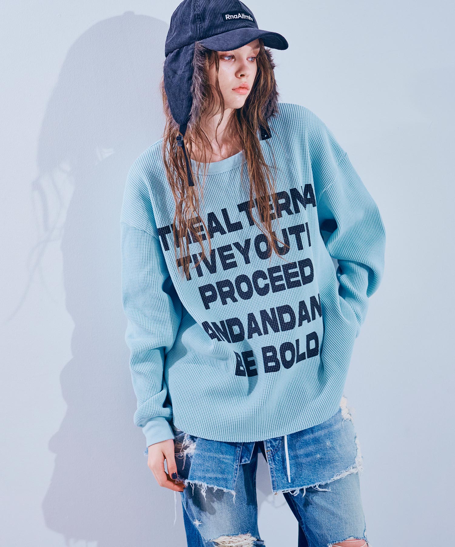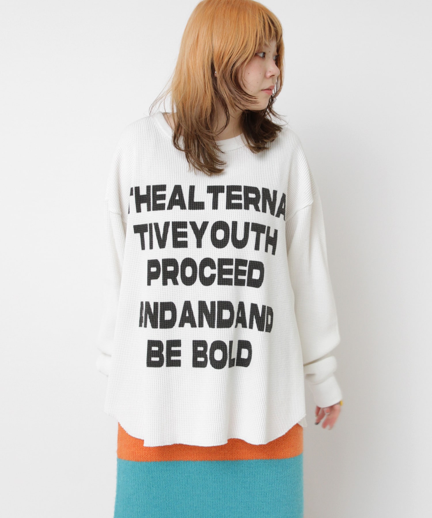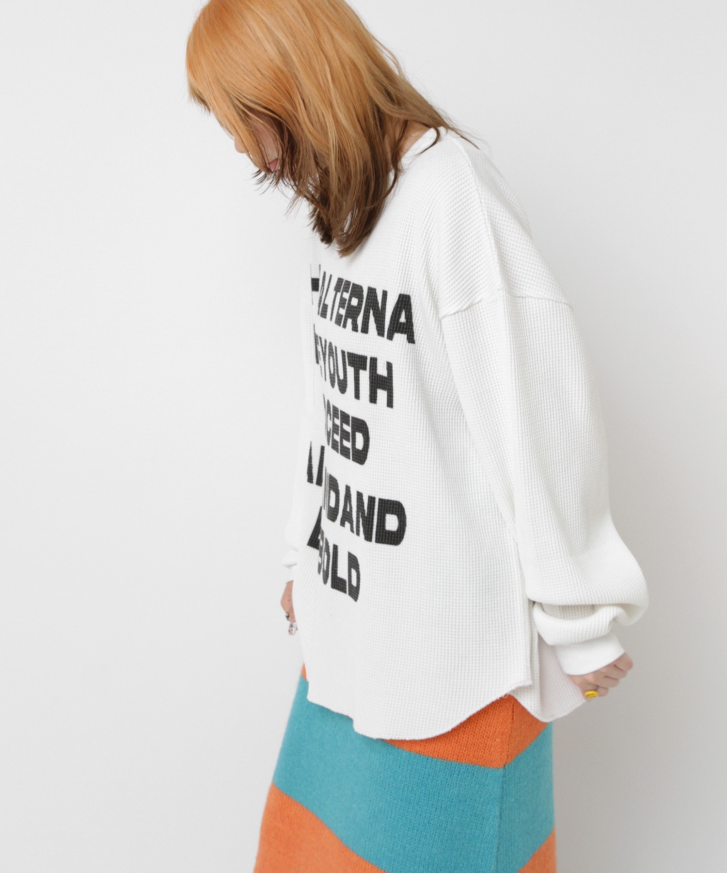 大胆にプリントされたかすれ感のあるロゴがよりインパクトのあるアイテムです。