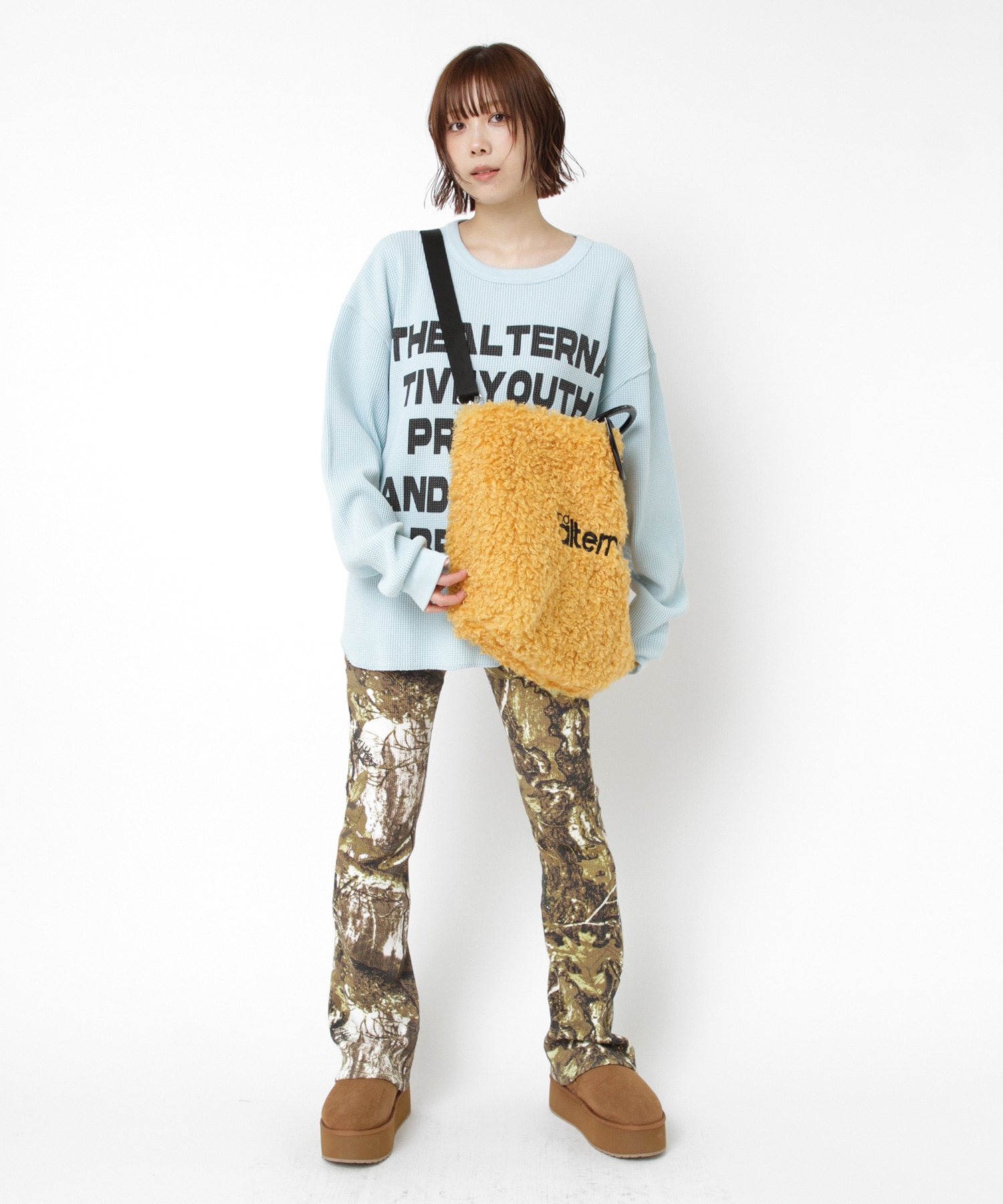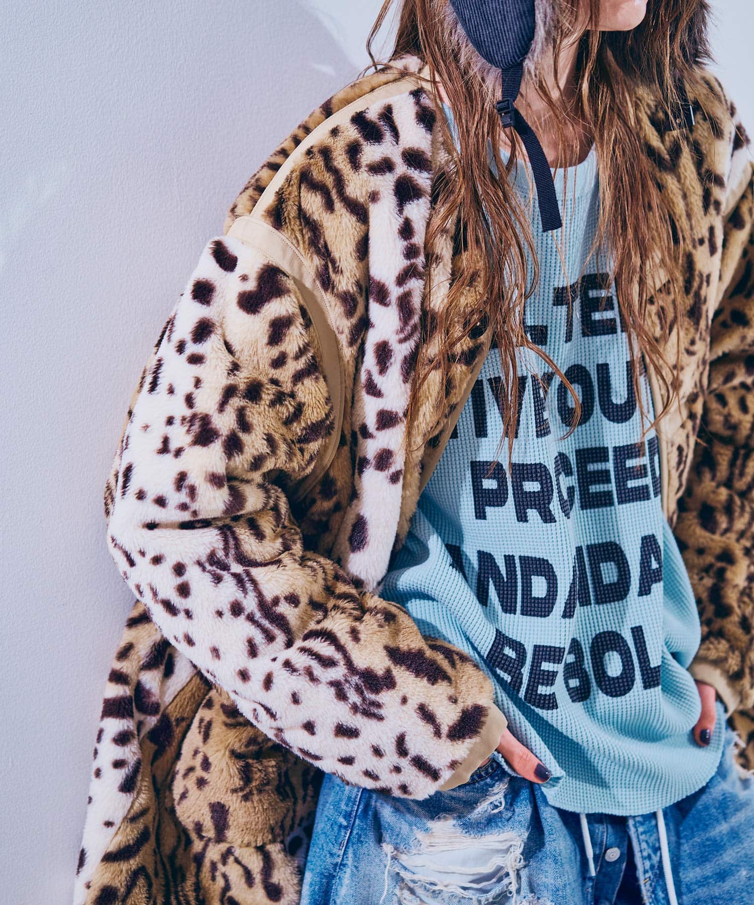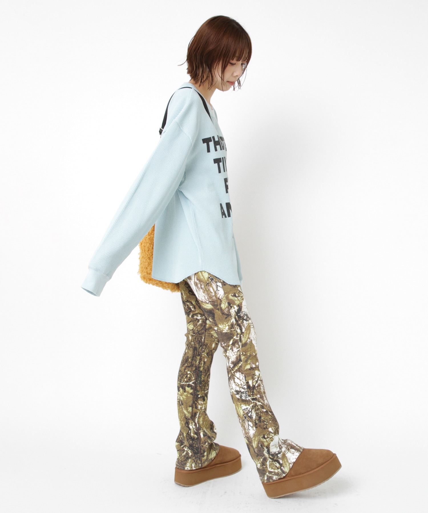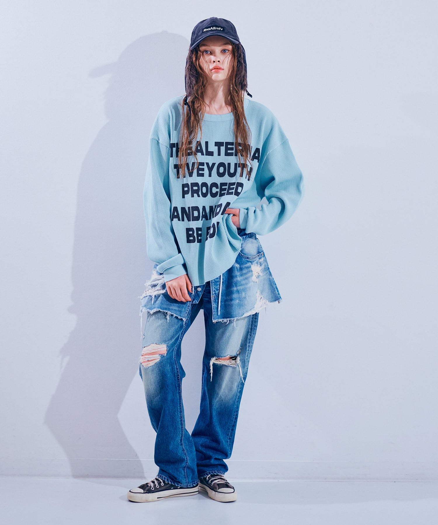 大胆にプリントされたかすれ感のあるロゴがよりインパクトのあるアイテムです。