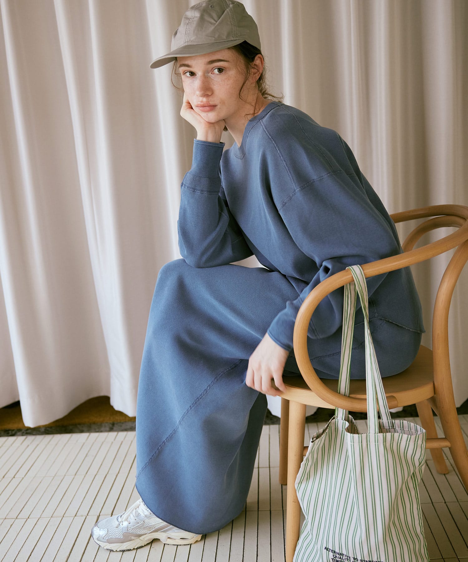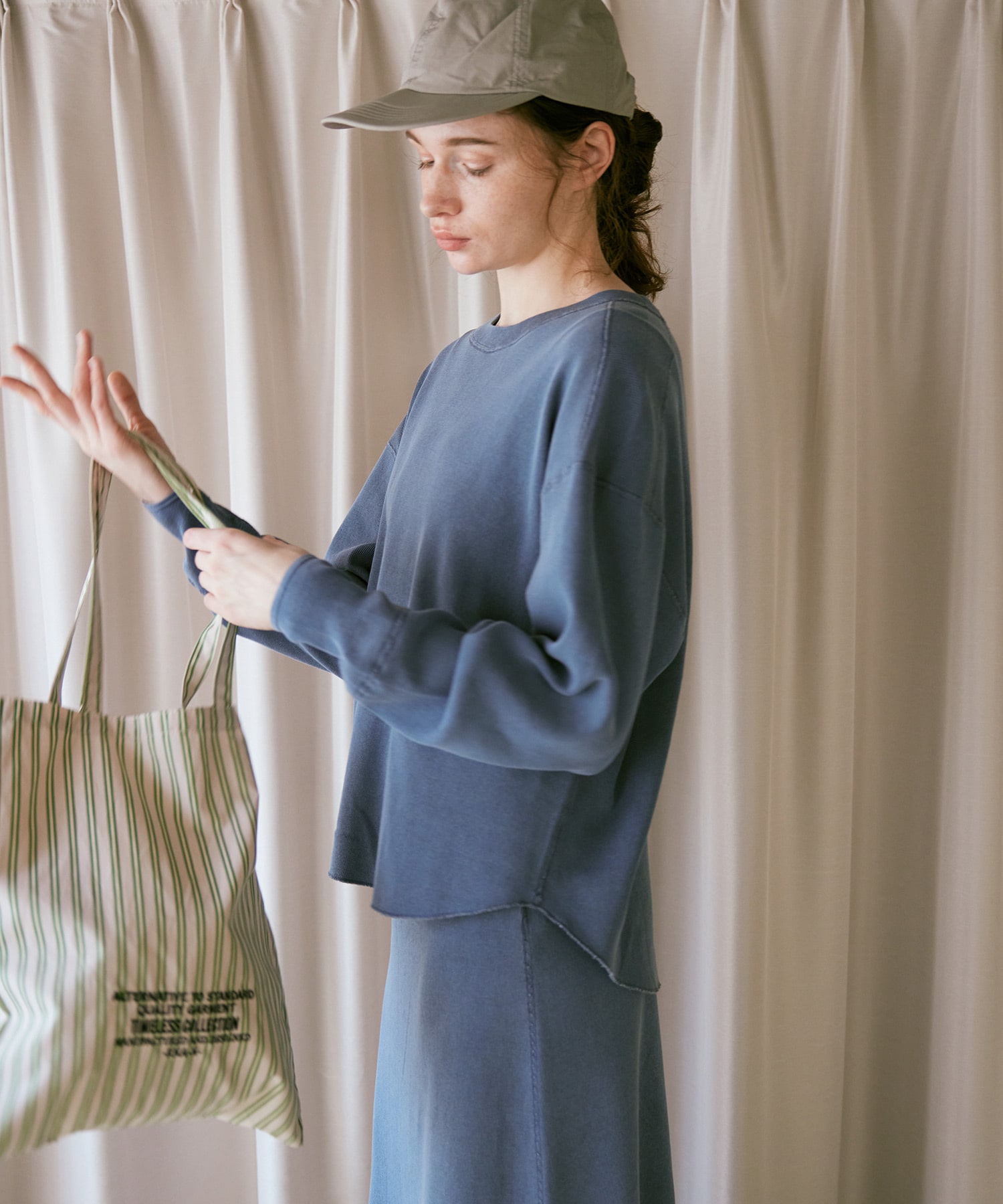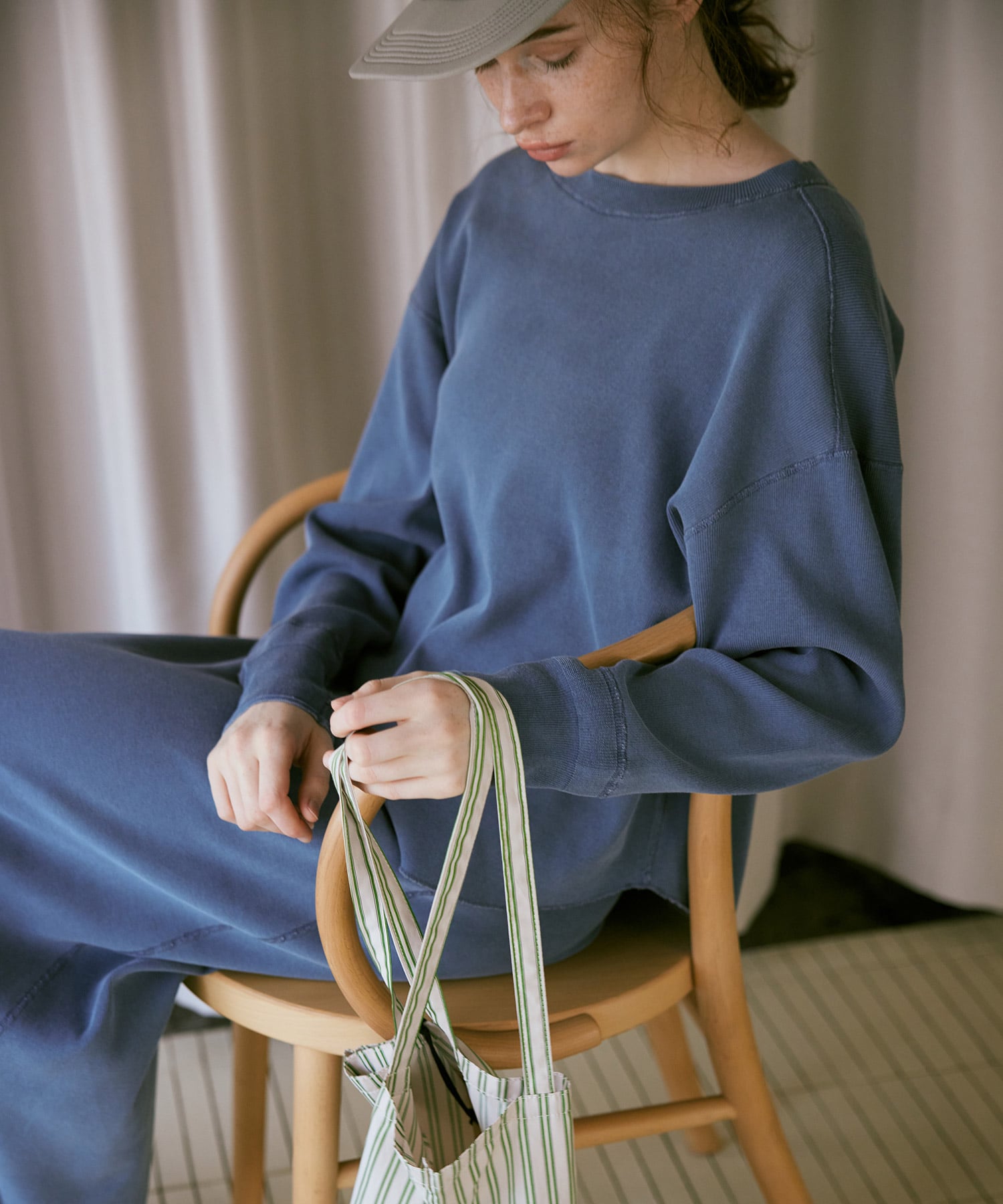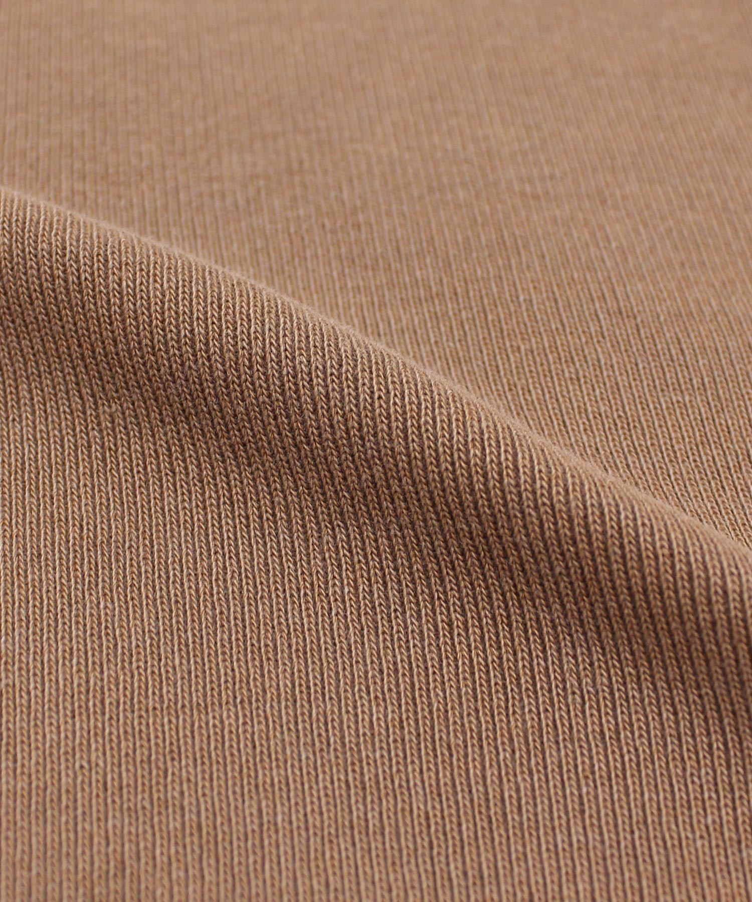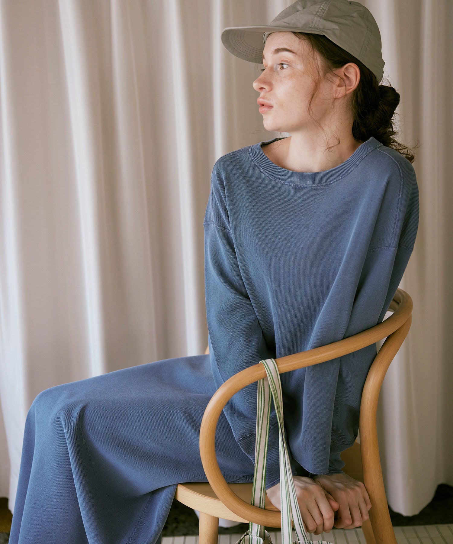顔料染めで仕上げたコットンフライス生地は、柔らかく肌に寄り添いながらも、表面にはざっくりとした凹凸が特徴。