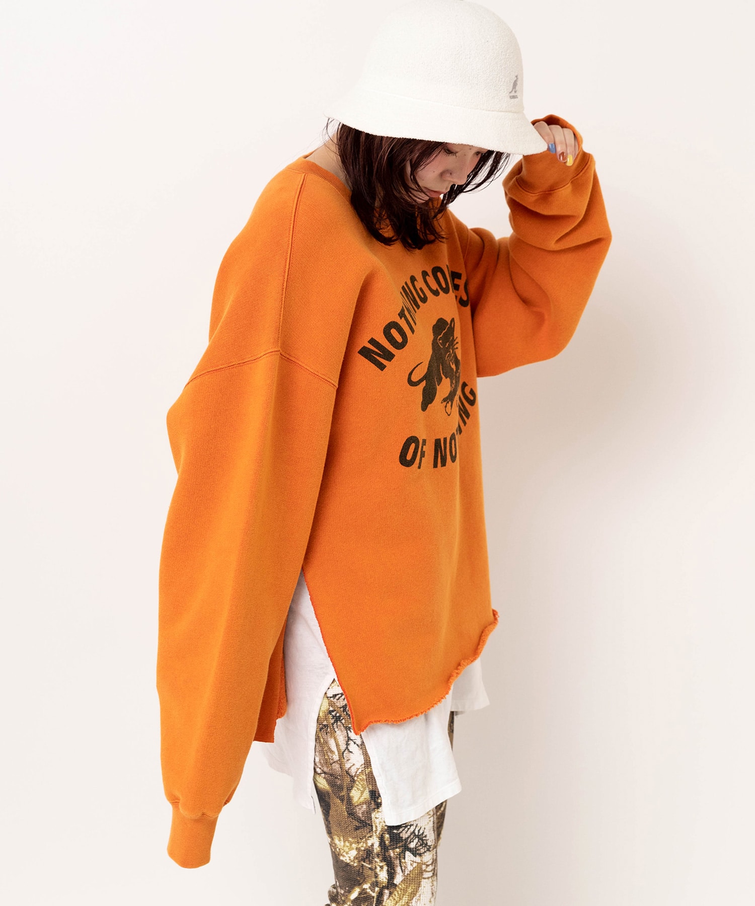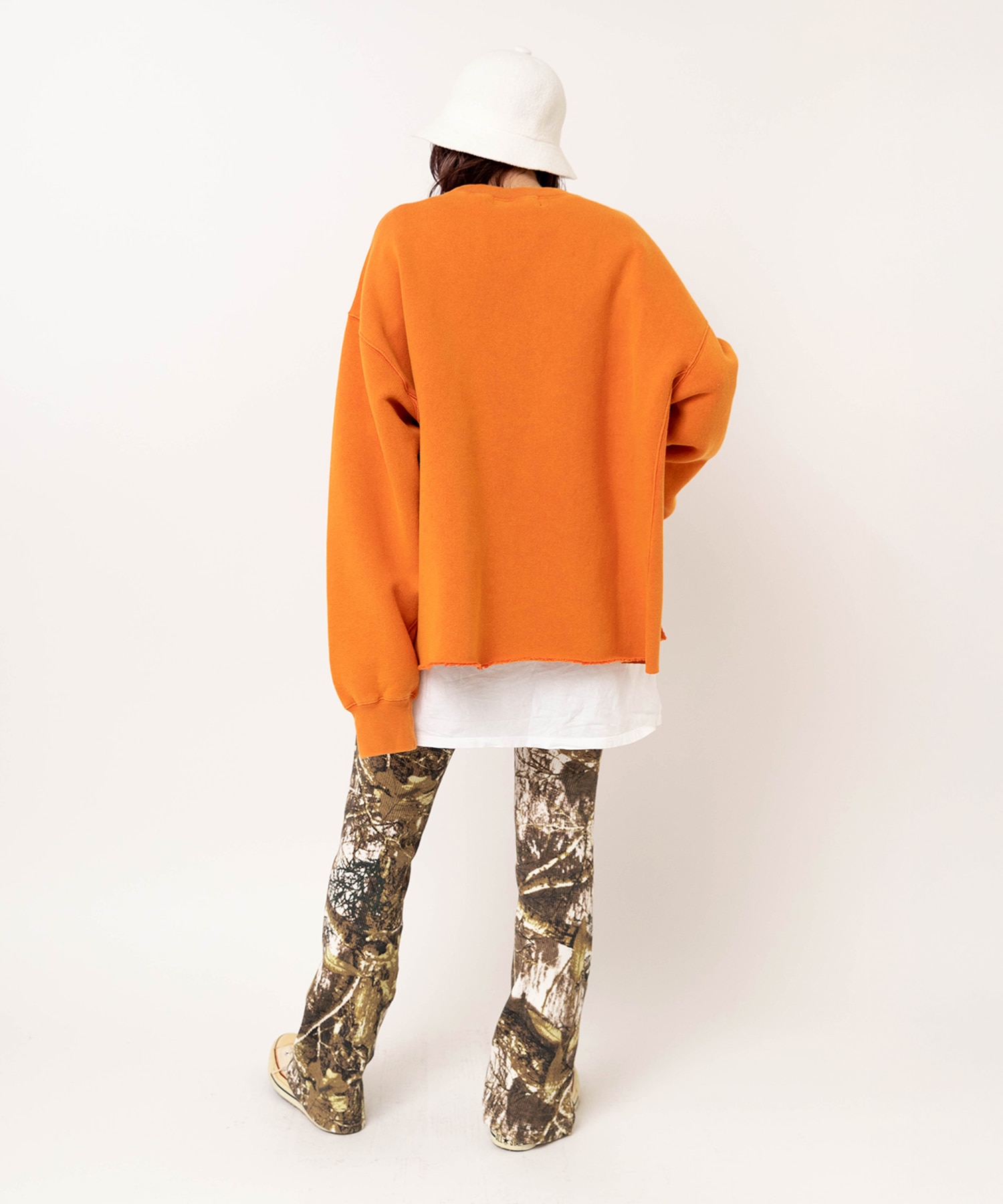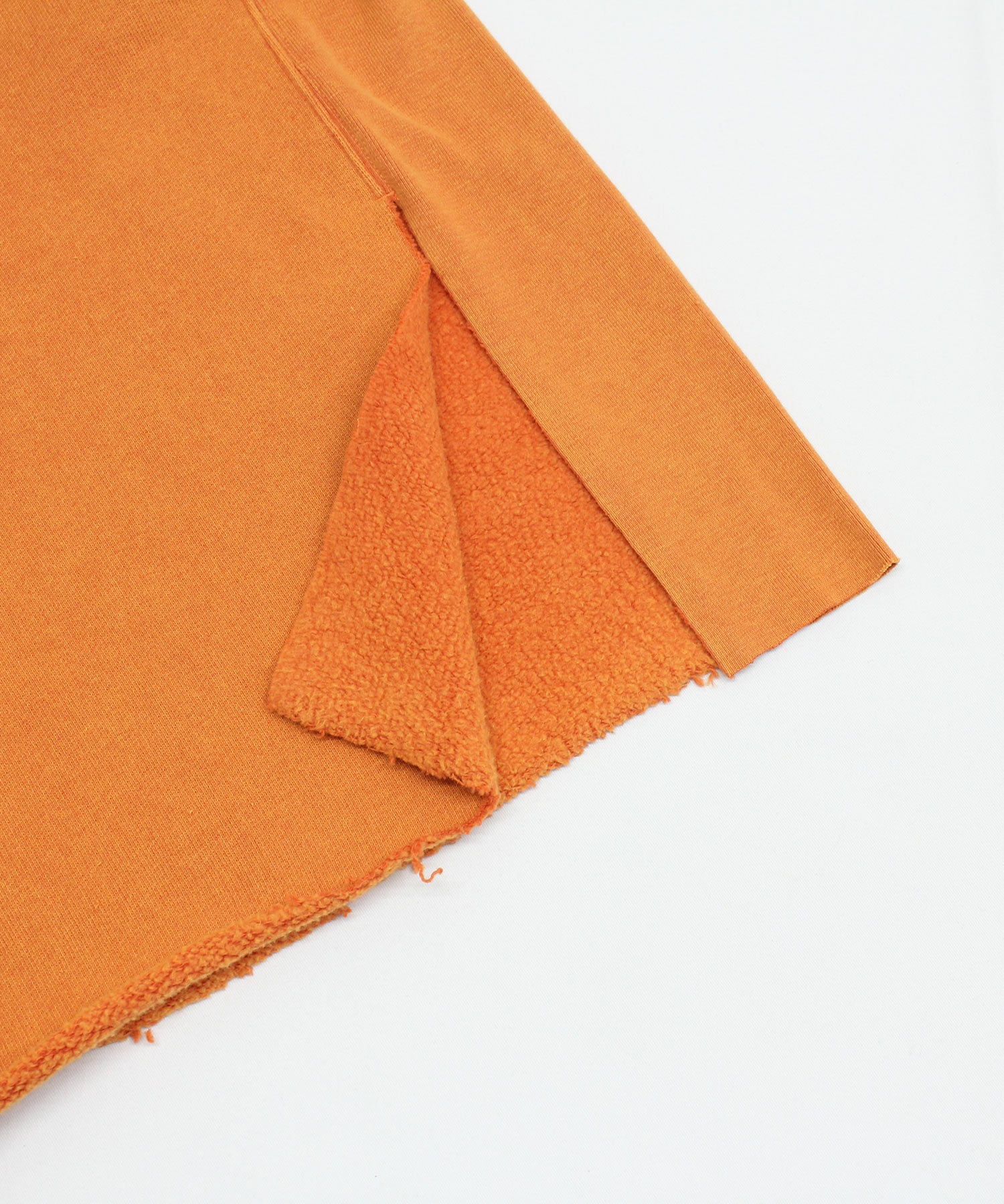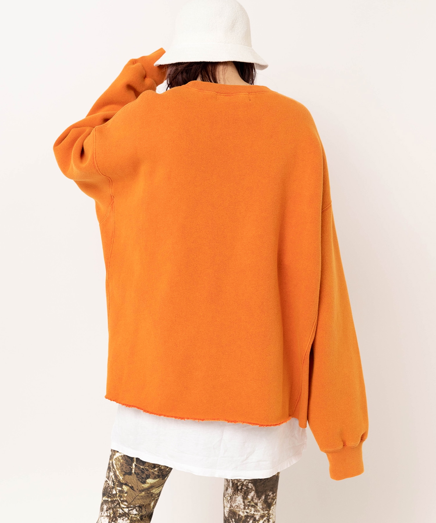 裾とサイドのシームをカットオフしたディテールで、古着を自分でカットしてリメイクしたイメージのトレーナーです。