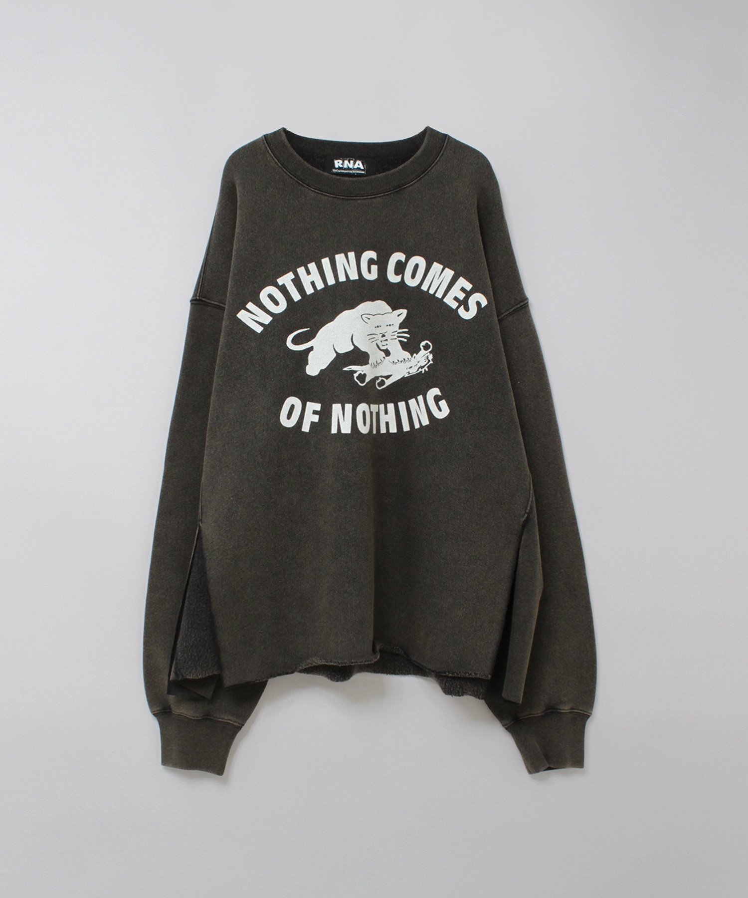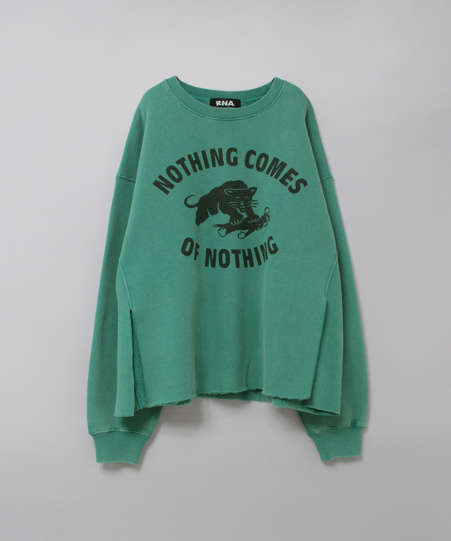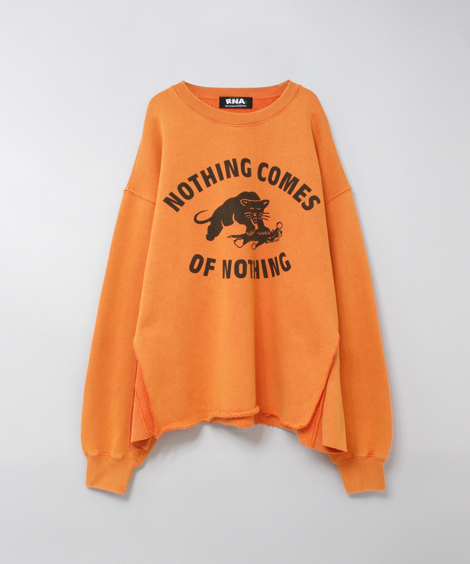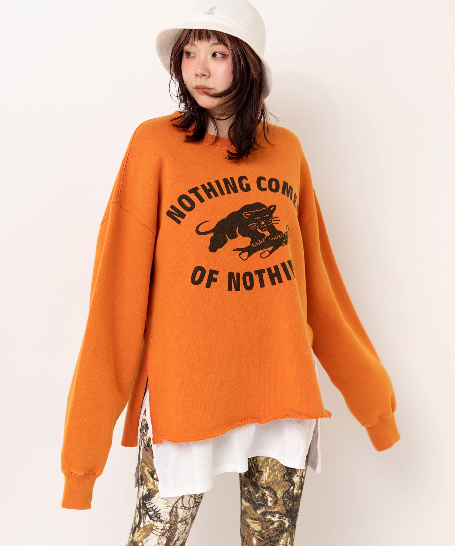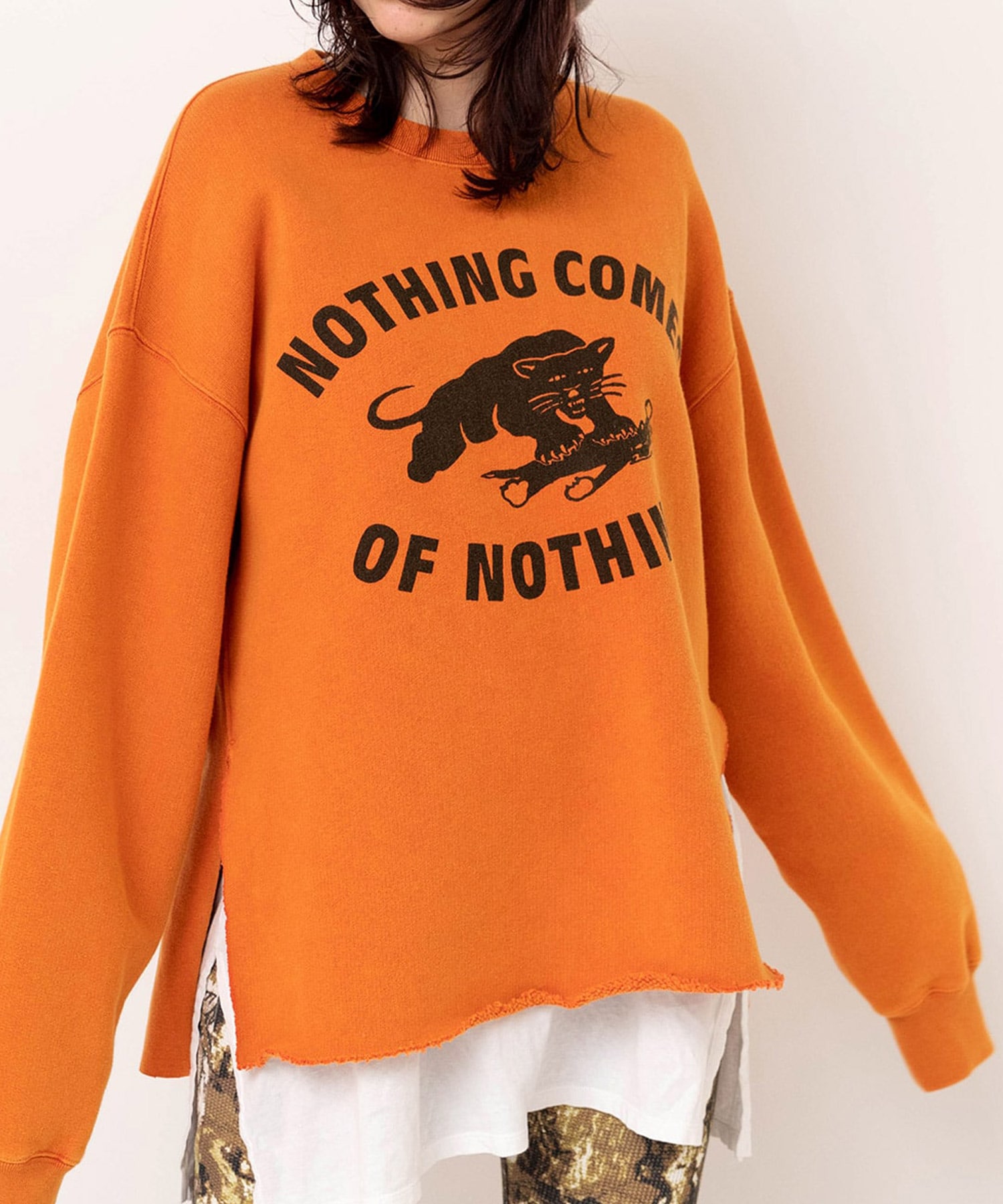 裾とサイドのシームをカットオフしたディテールで、古着を自分でカットしてリメイクしたイメージのトレーナーです。