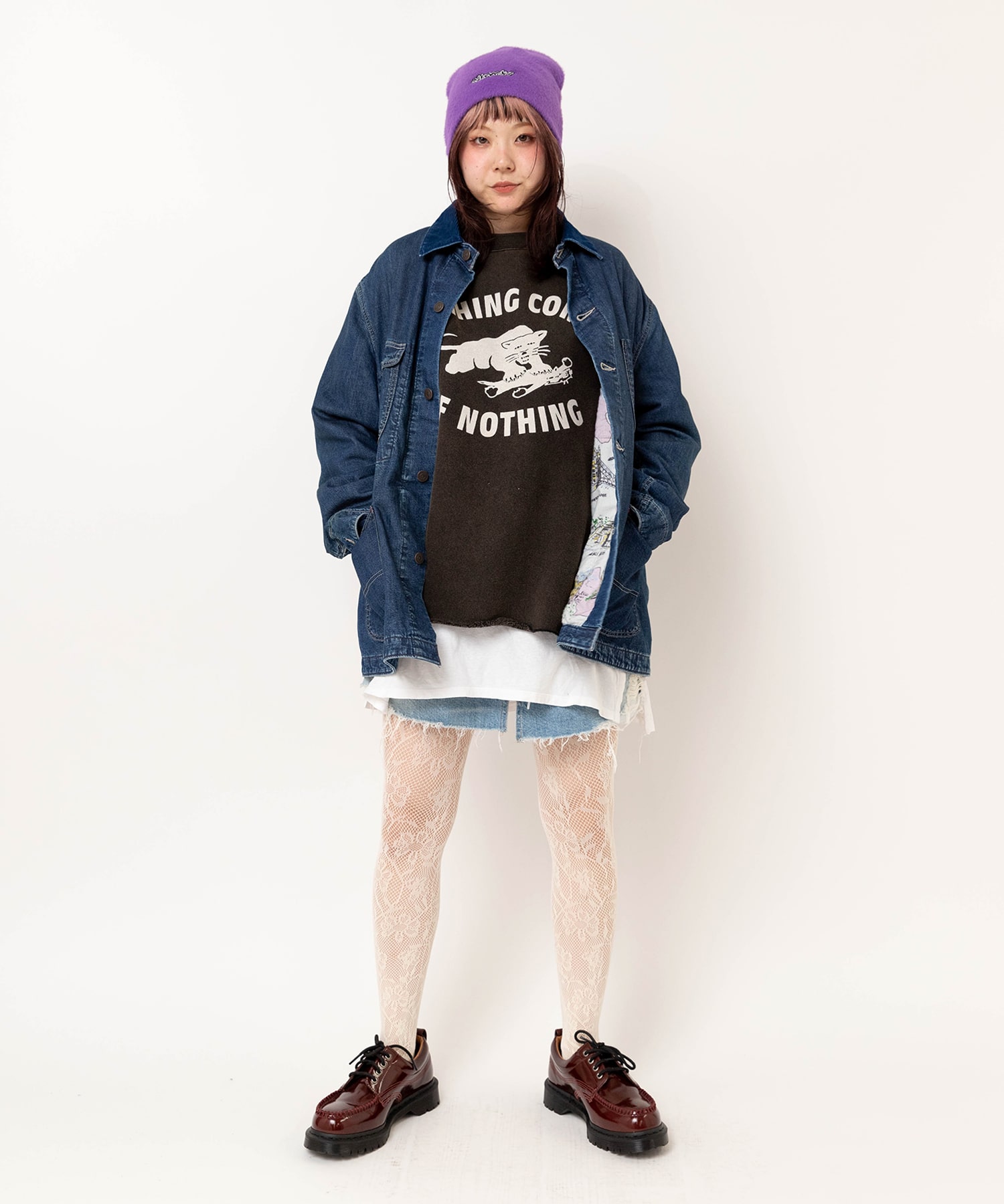 加工は、パウダーケミカル加工をして、USEDっぽい色褪せて着古した雰囲気が出るように加工しています。