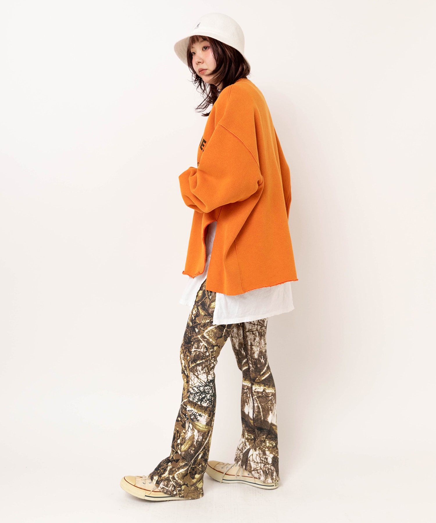 カットオフディテールのアメカジ風グラフィックトレーナー