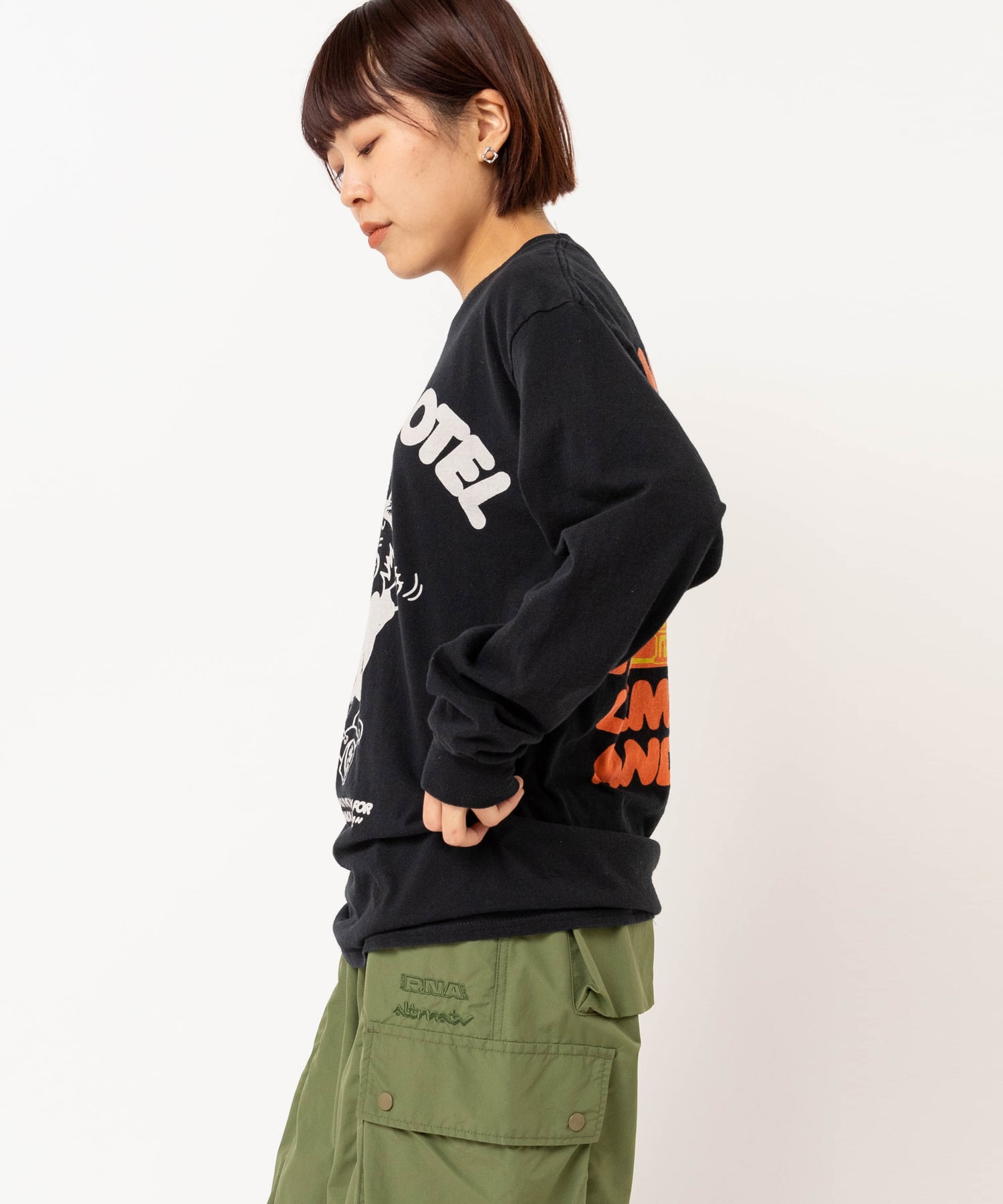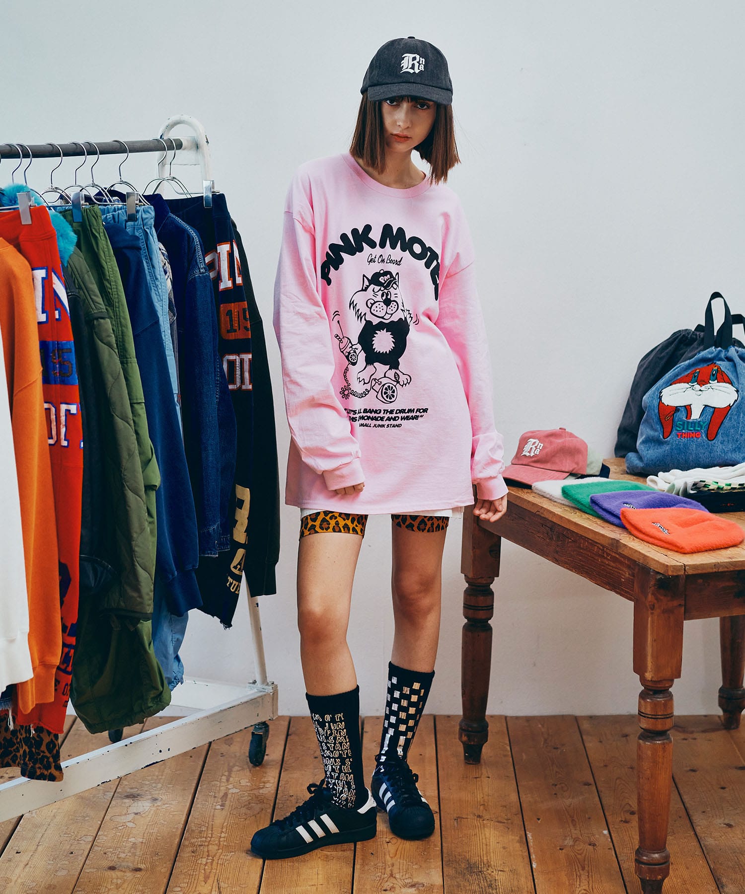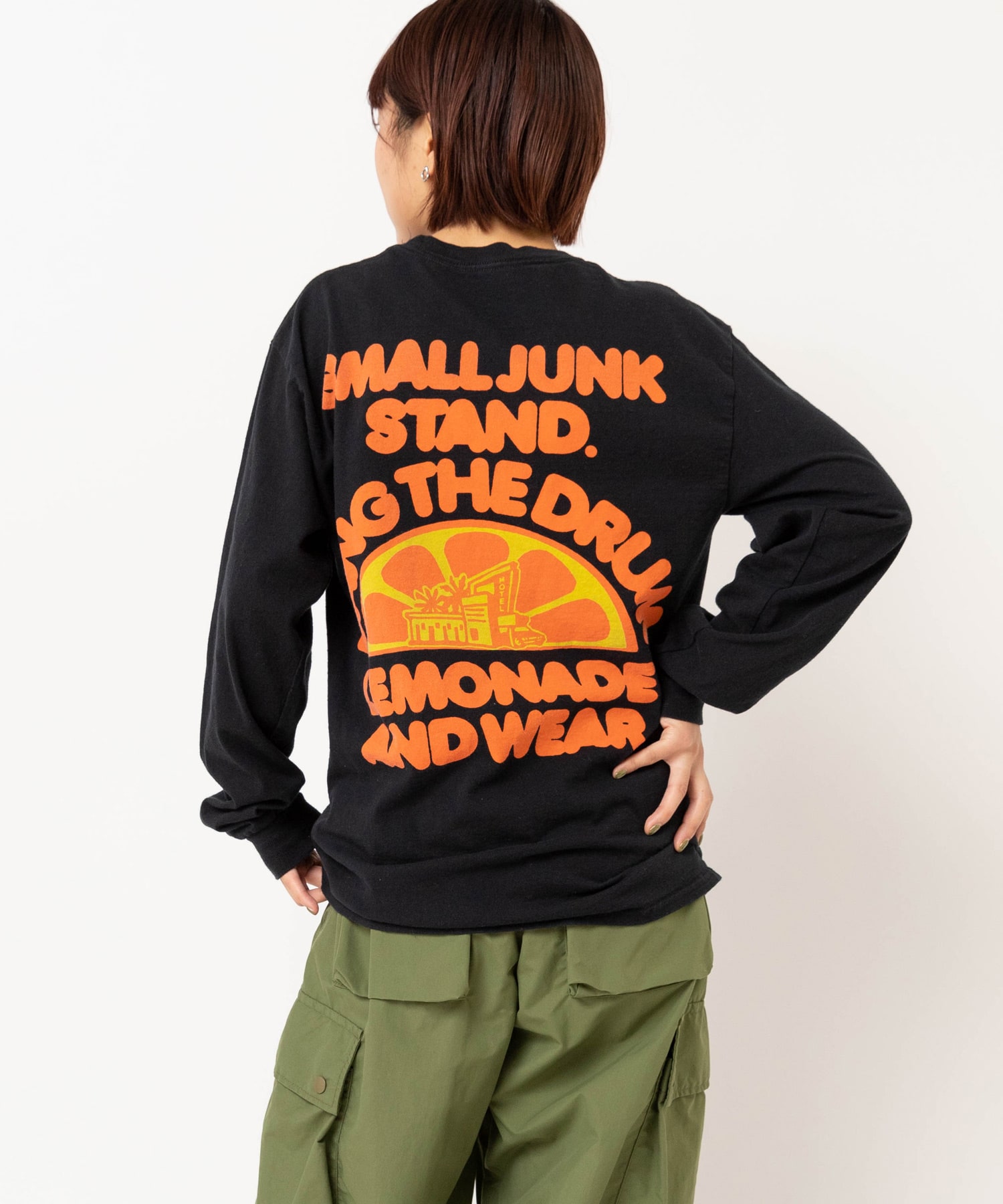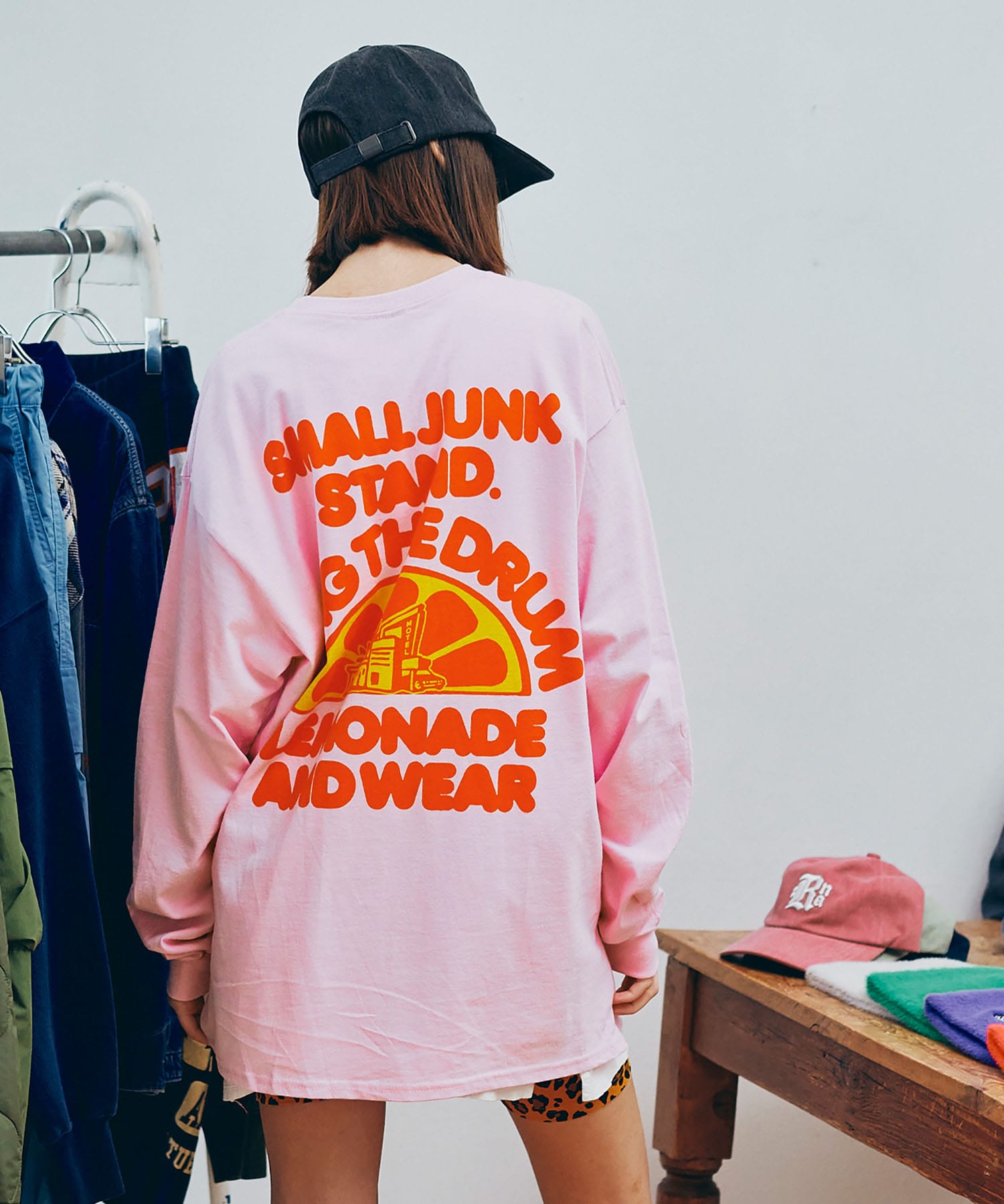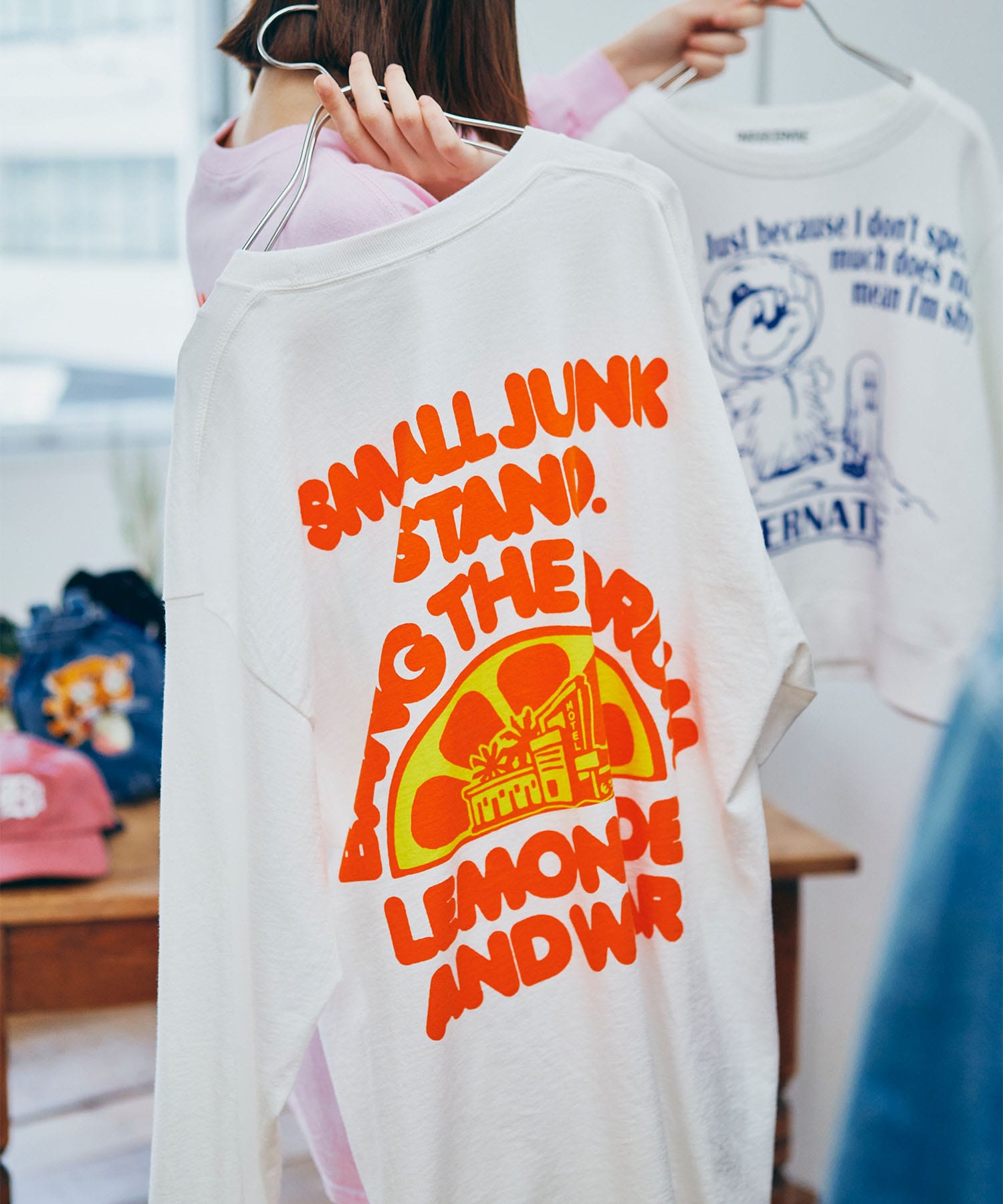 このロンTは、RNAとPINK MOTELの合同コレクションテーマ“SMALL JUNK STAND”(小さな屋台のユーズドショップ)を象徴するイメージアイテムです。ベーシックながらしっかりとした6ozのロンTをベースに、デザインにはイベントへの熱狂的なメッセージを込めました。