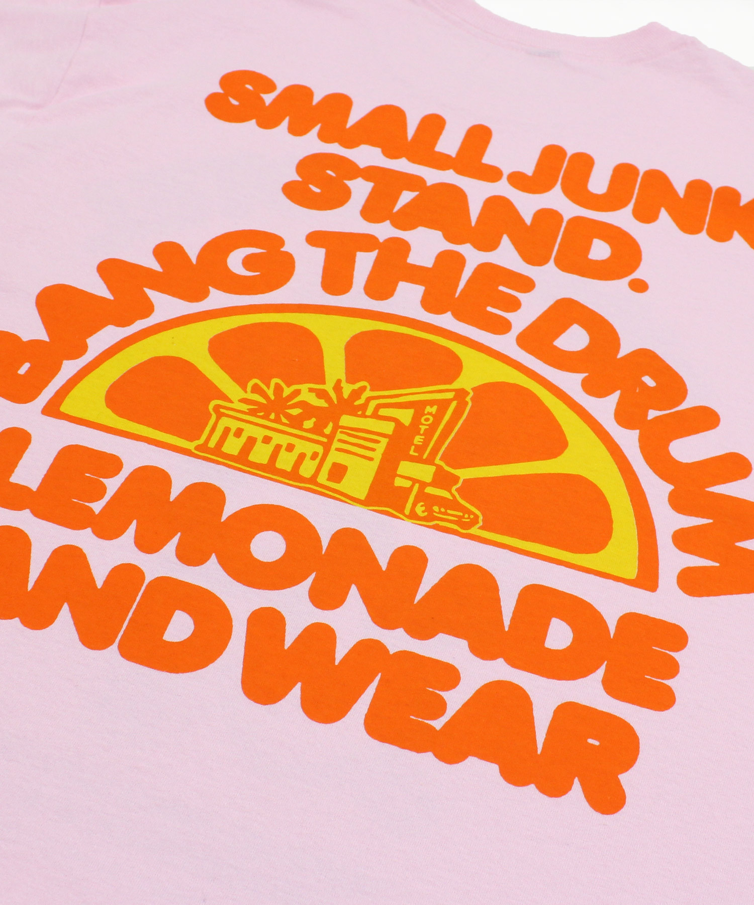 屋台の名物であるレモネードのイメージや、熱狂を煽るメッセージと共に、PMベアー(PINK MOTELベアー)を大胆にプリントしています。