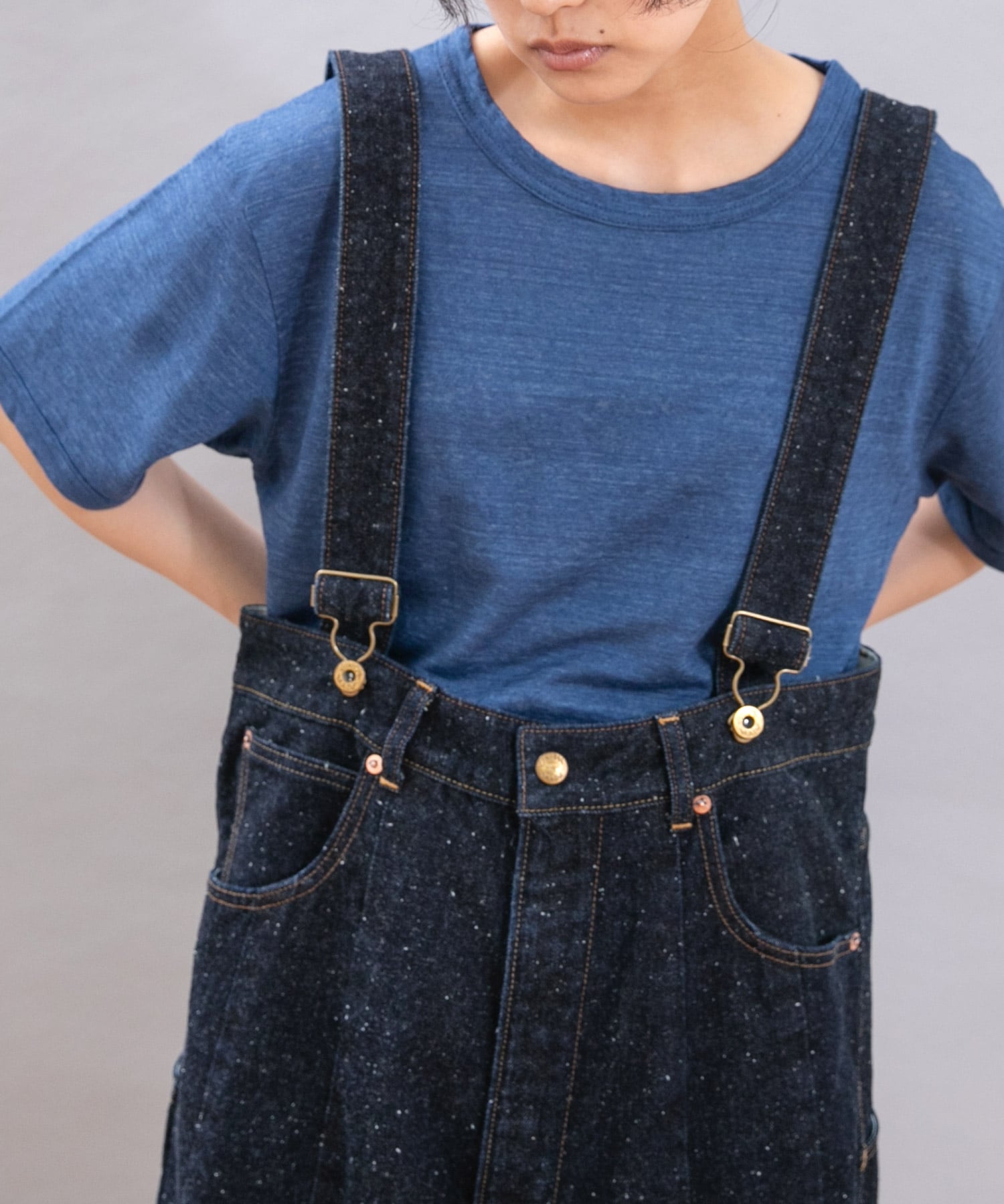 メンズサイズのパンツを肩ひもで吊り、胸下あたりの高めの位置でラフに着こなすスタイルをイメージしています。