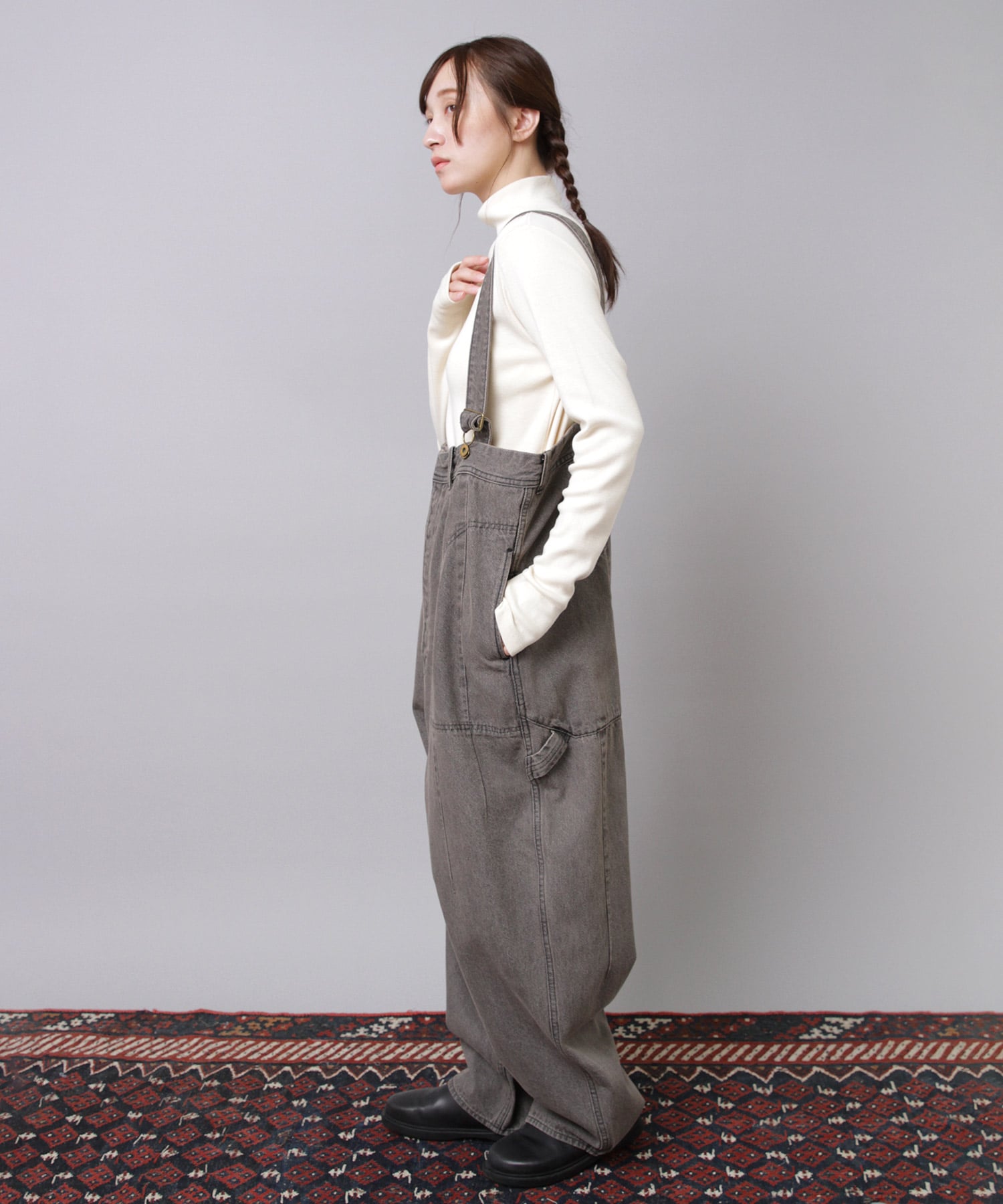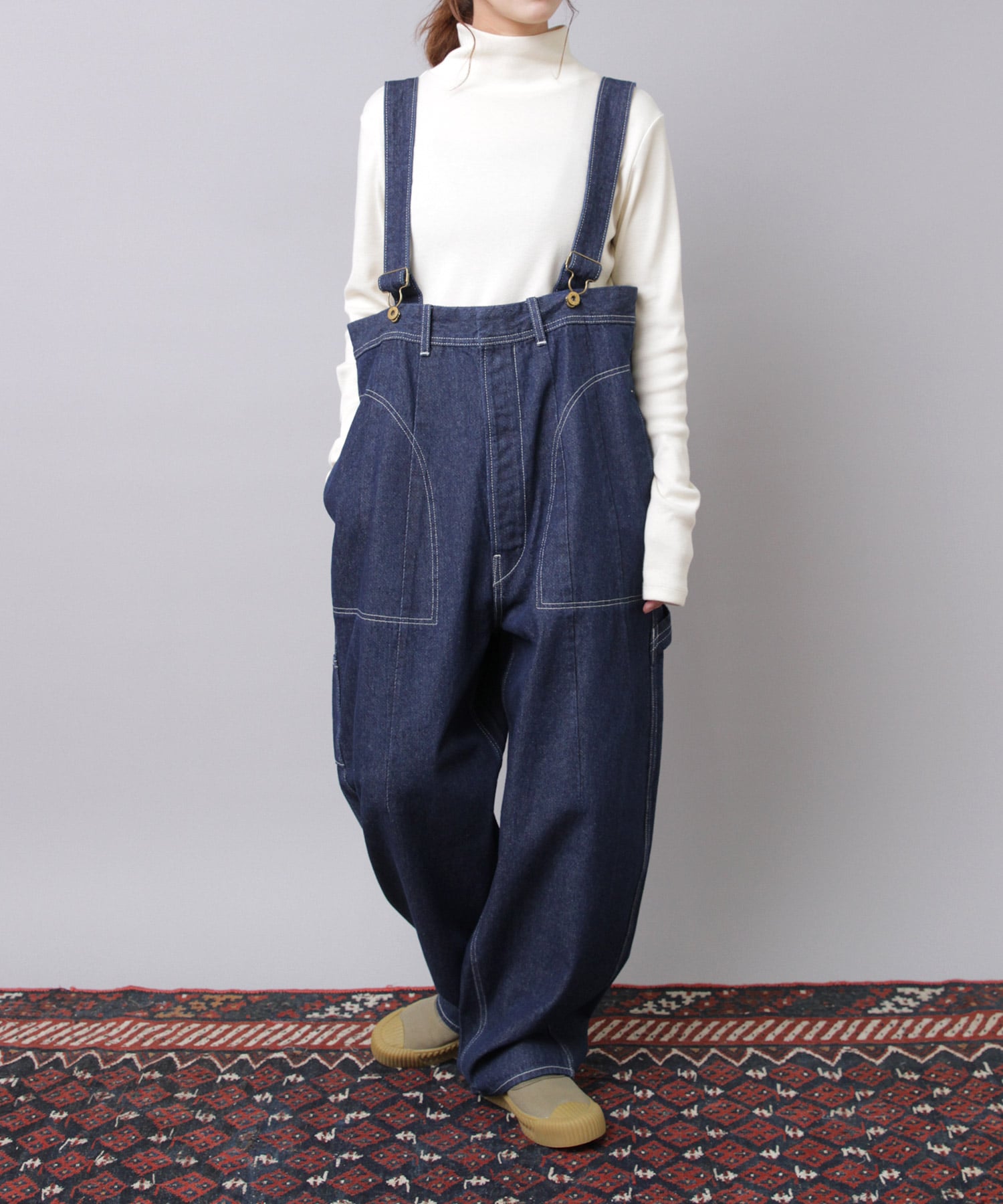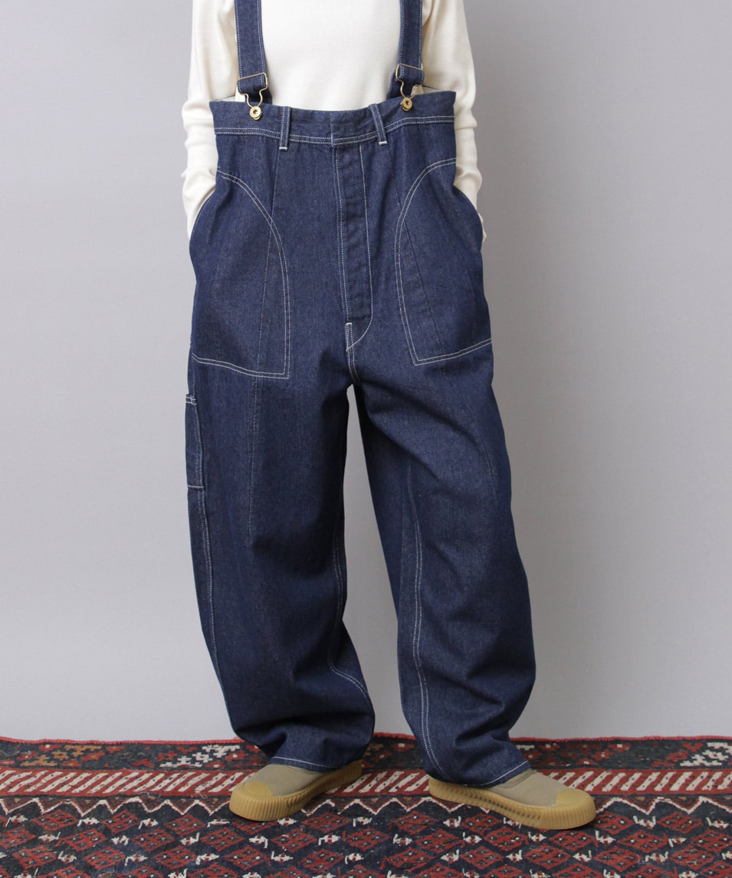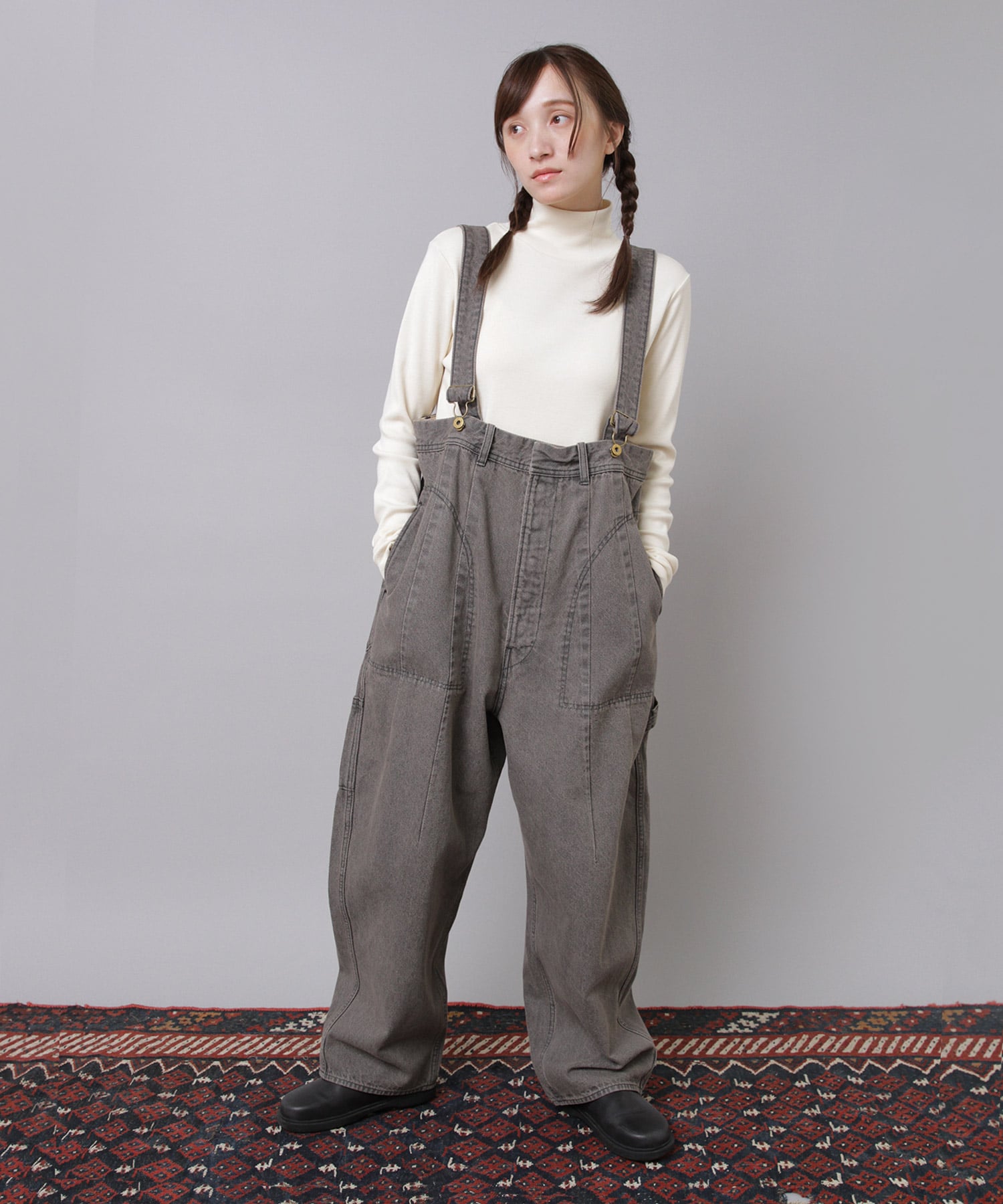 ”大きめサイズのパンツを肩ひもで吊り、胸下あたりの高めの位置でラフに着こなす”イメージの着用がおすすめです。