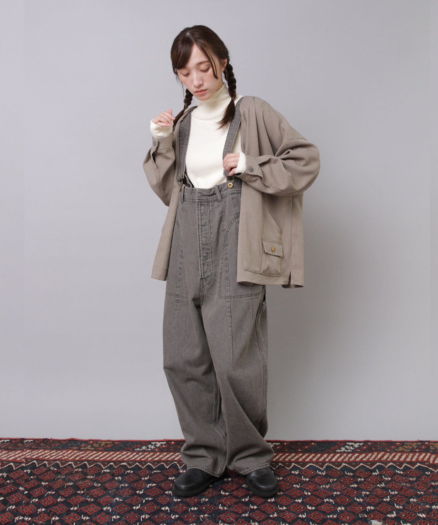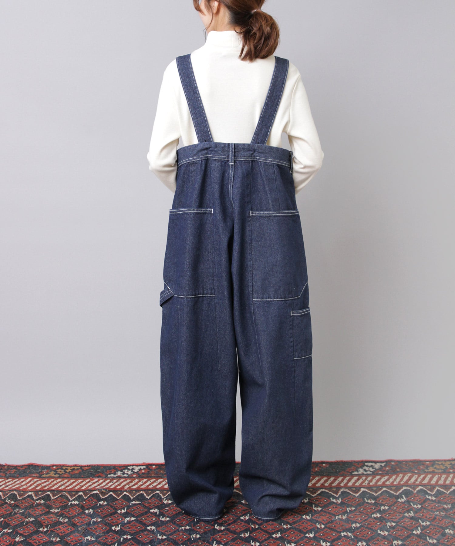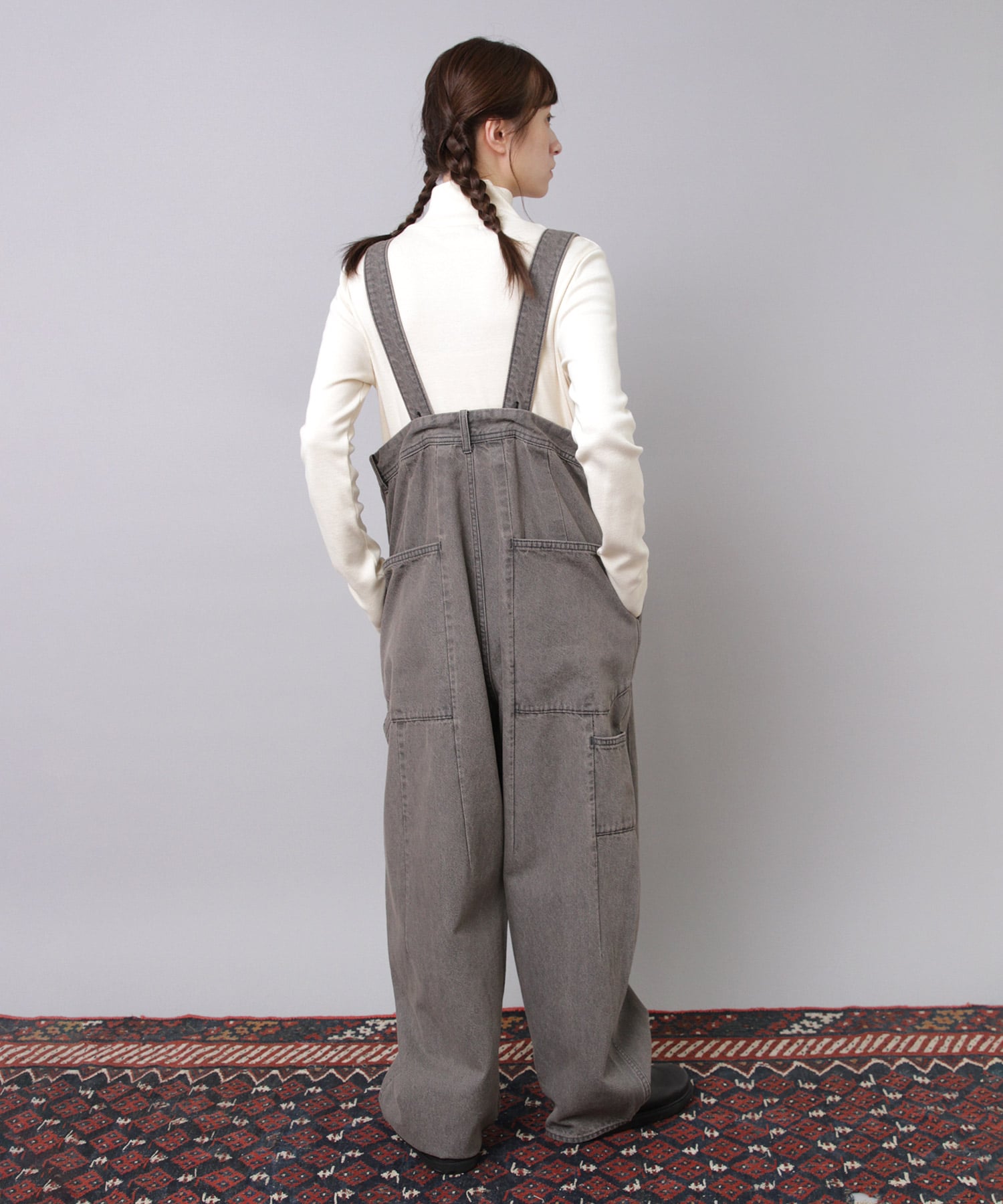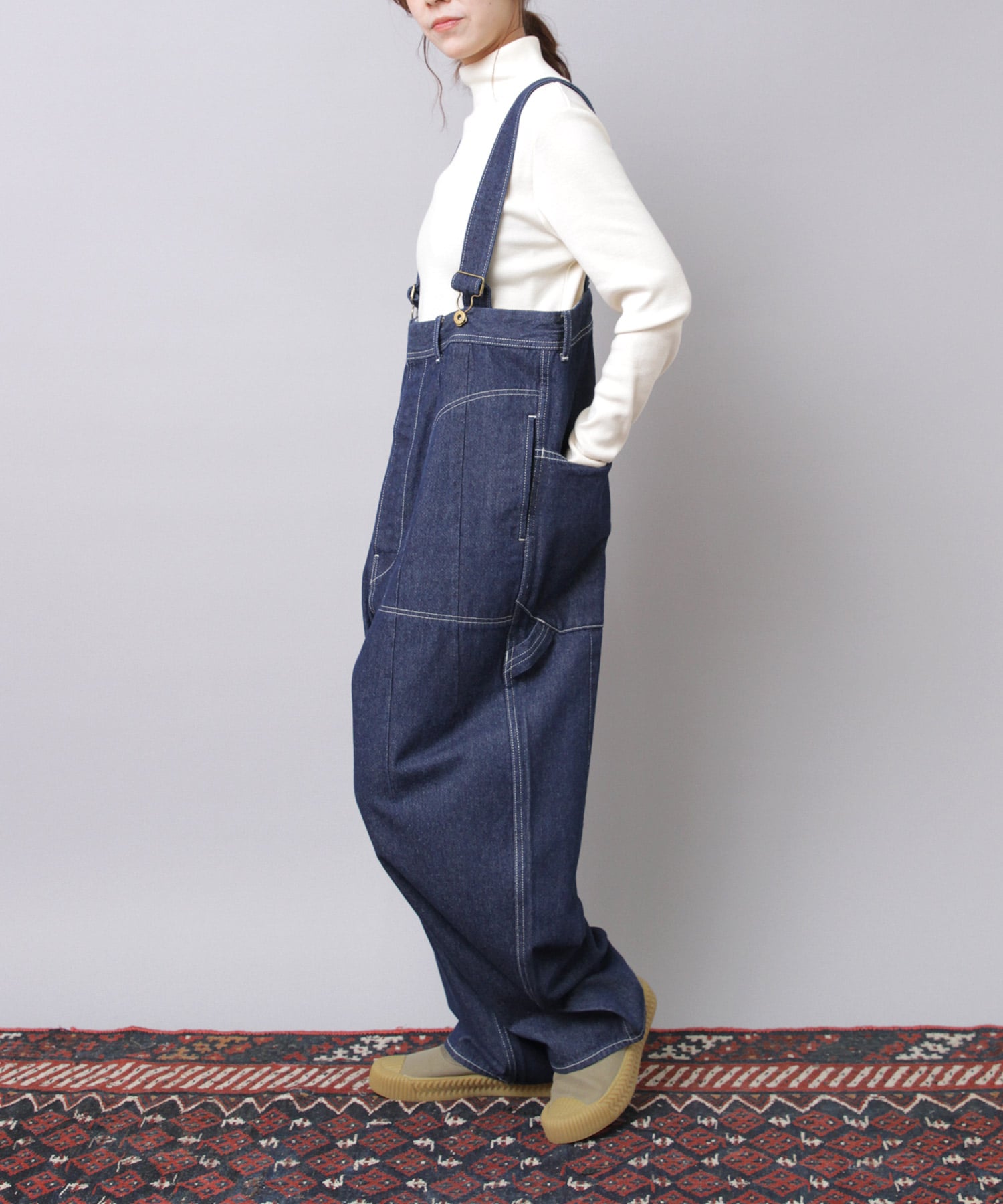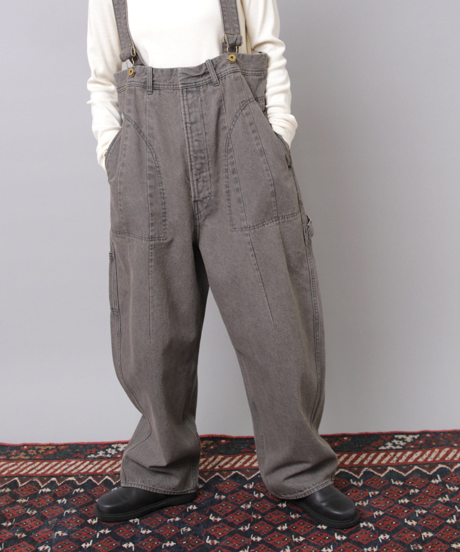 ”大きめサイズのパンツを肩ひもで吊り、胸下あたりの高めの位置でラフに着こなす”イメージの着用がおすすめです。