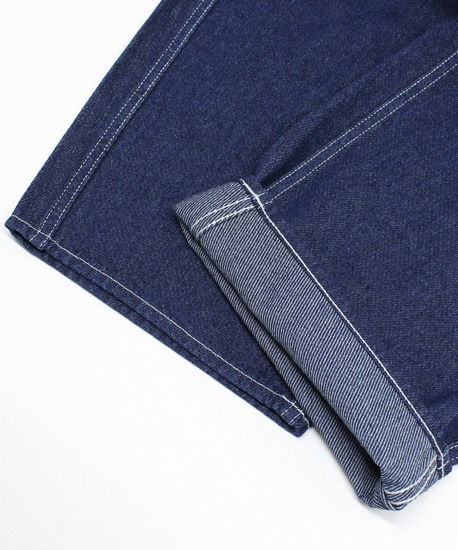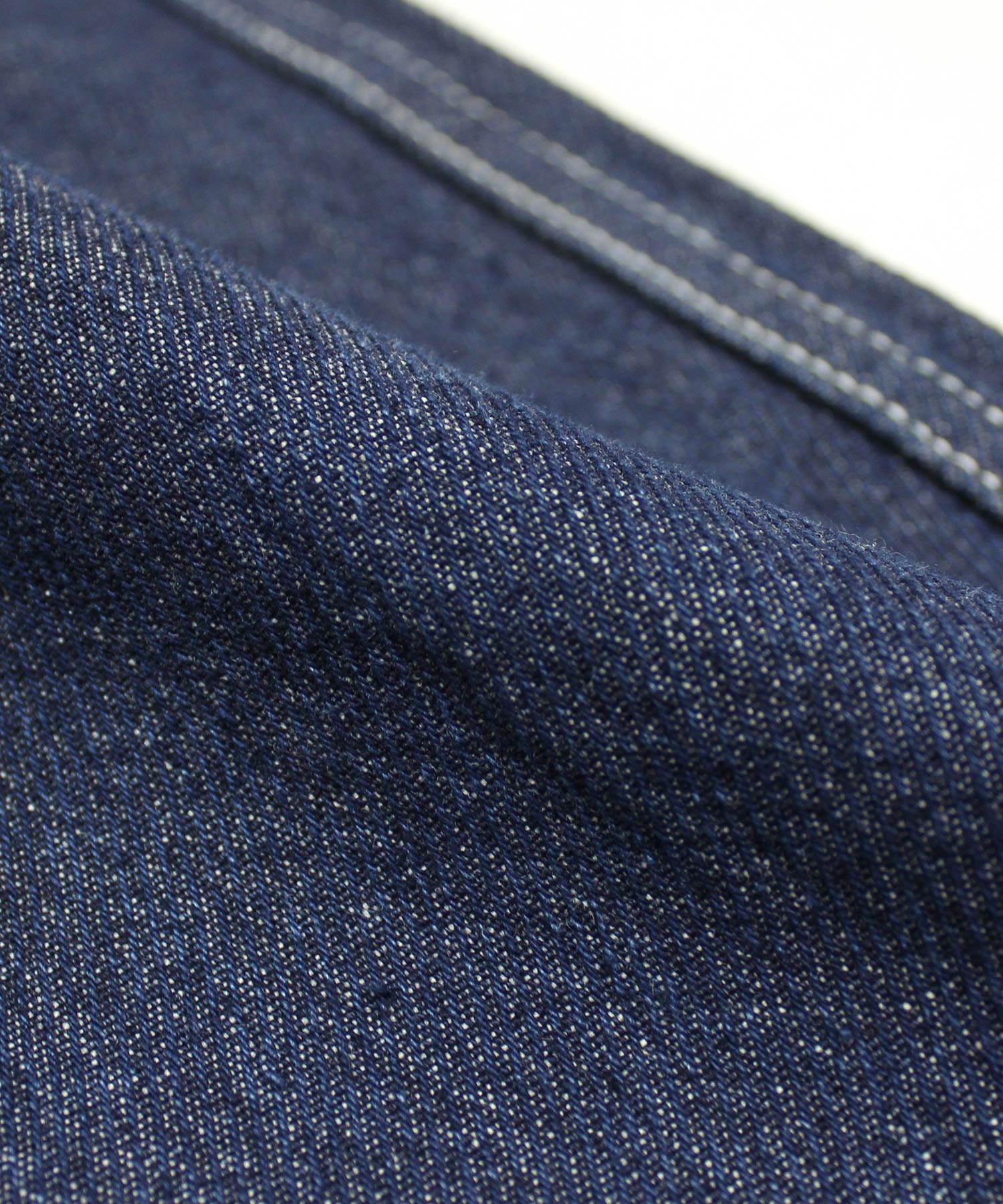 カルゼ織りの特殊デニムを使用しており、太番手の糸で立体的な綾目を表現し、シワになりにくく耐久性に優れています。