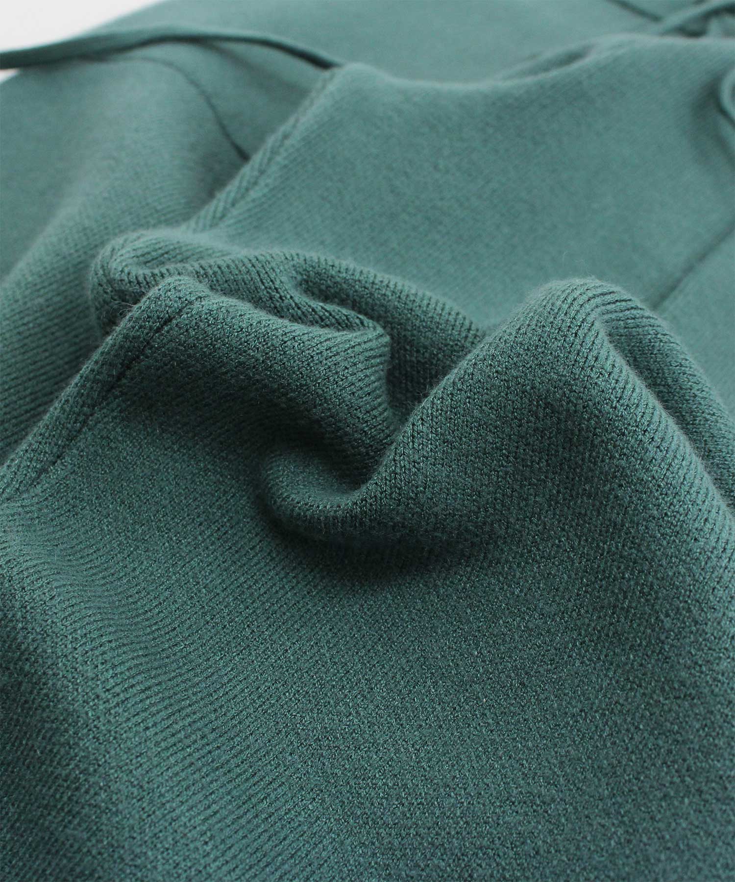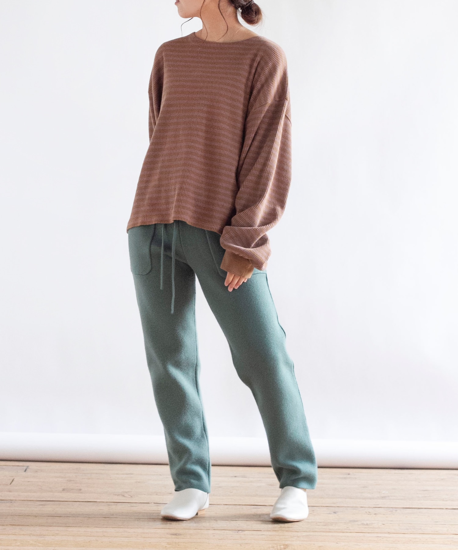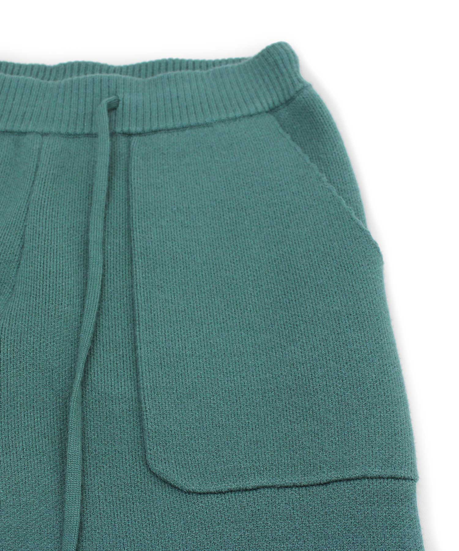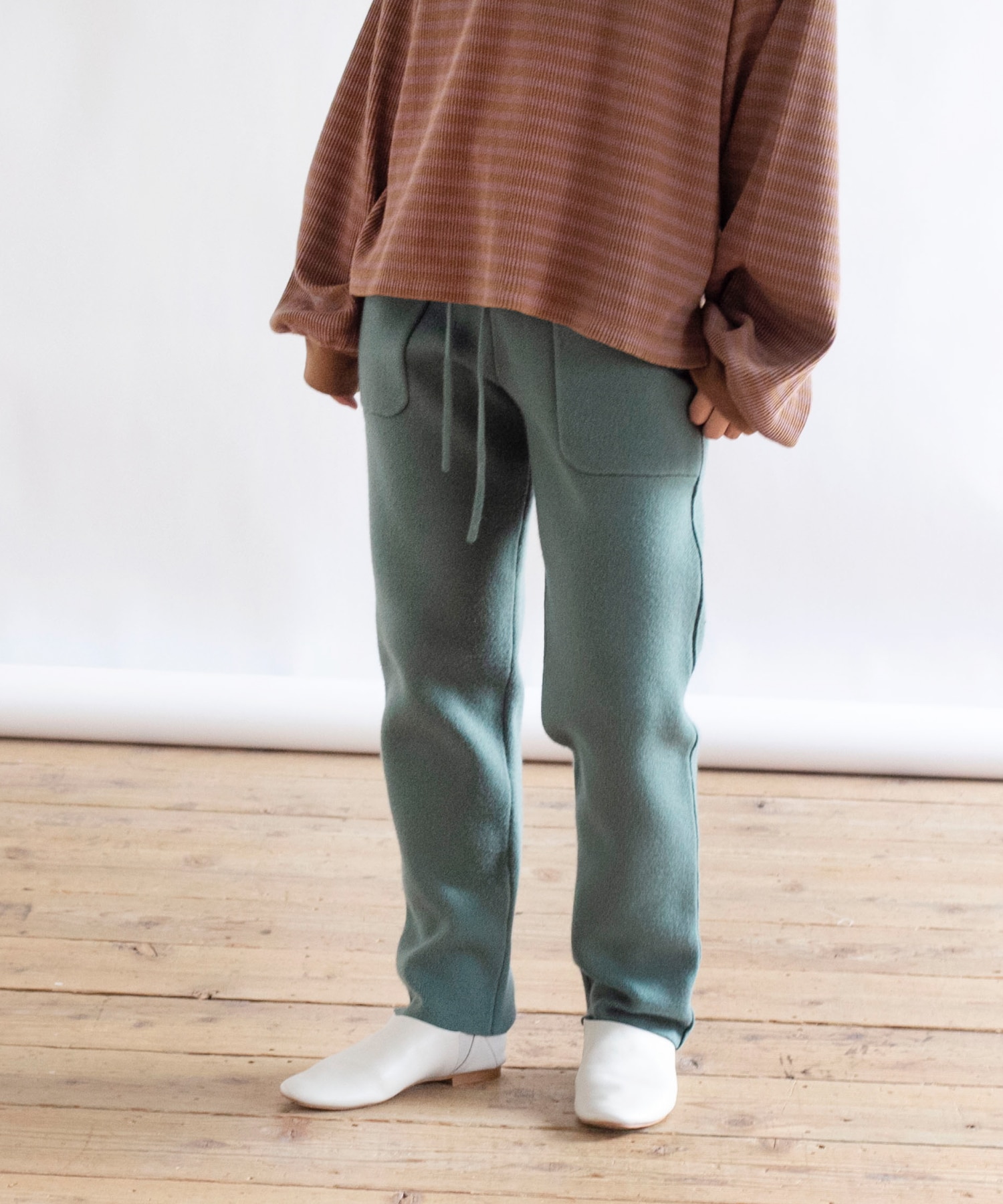 体の線が出過ぎない編地のニットパンツ。