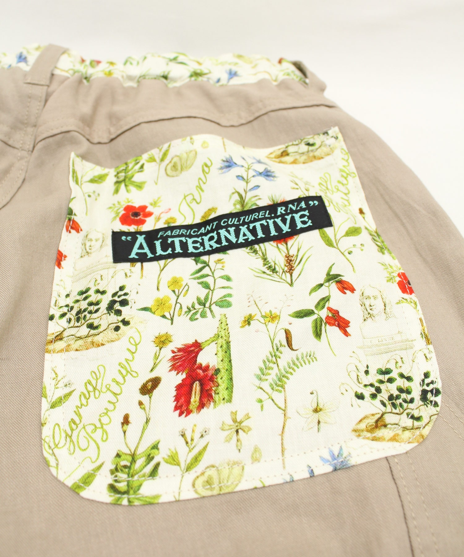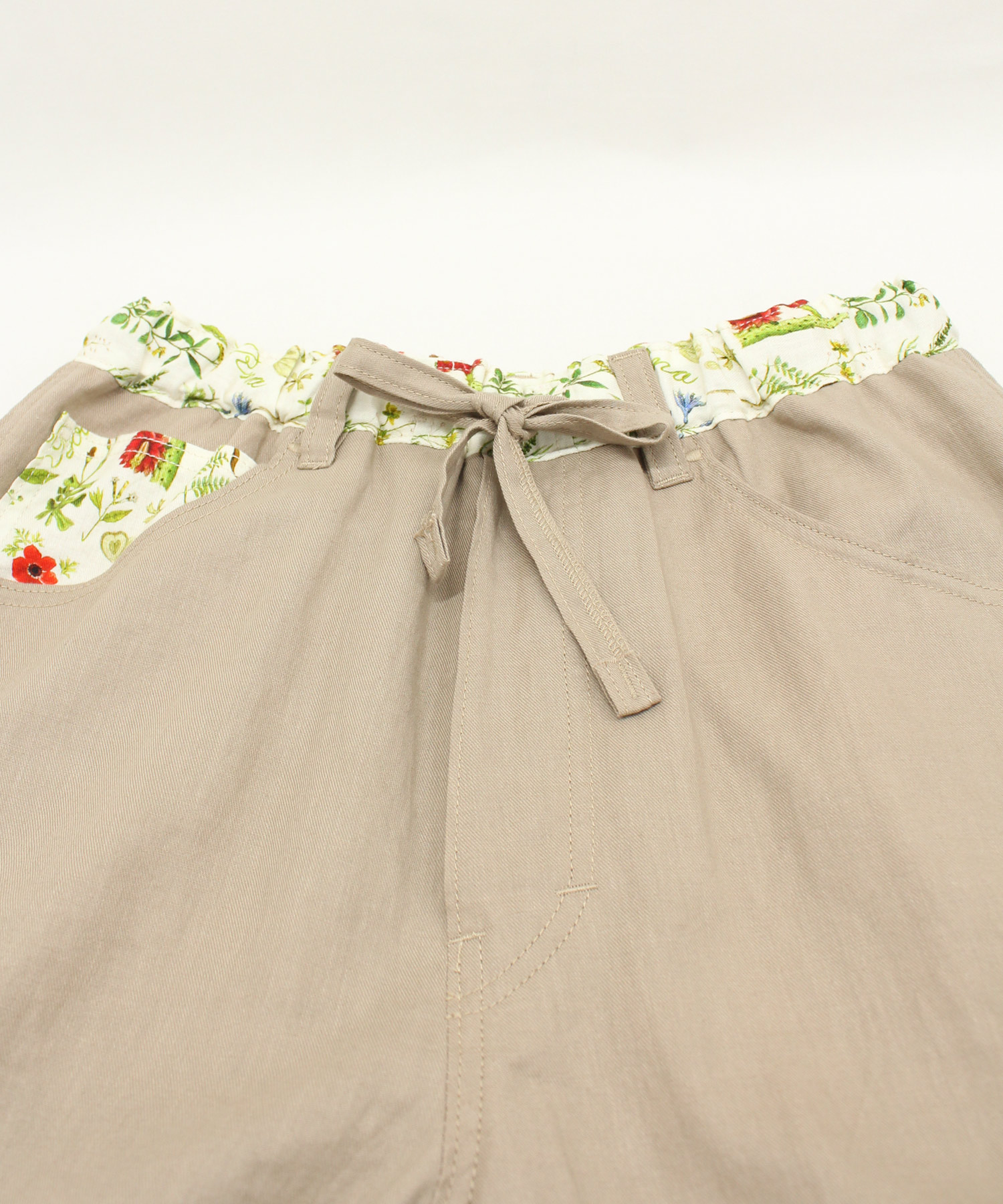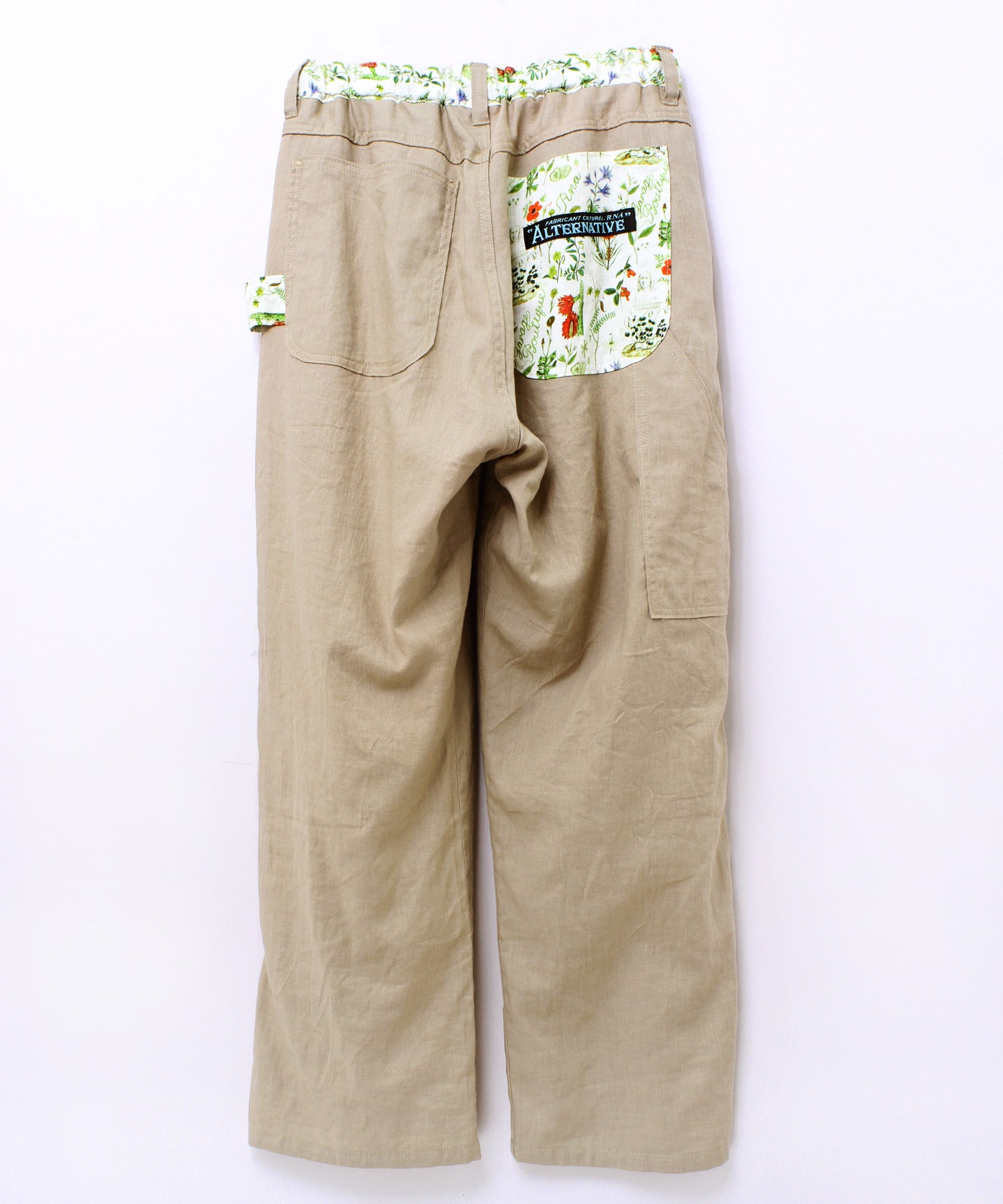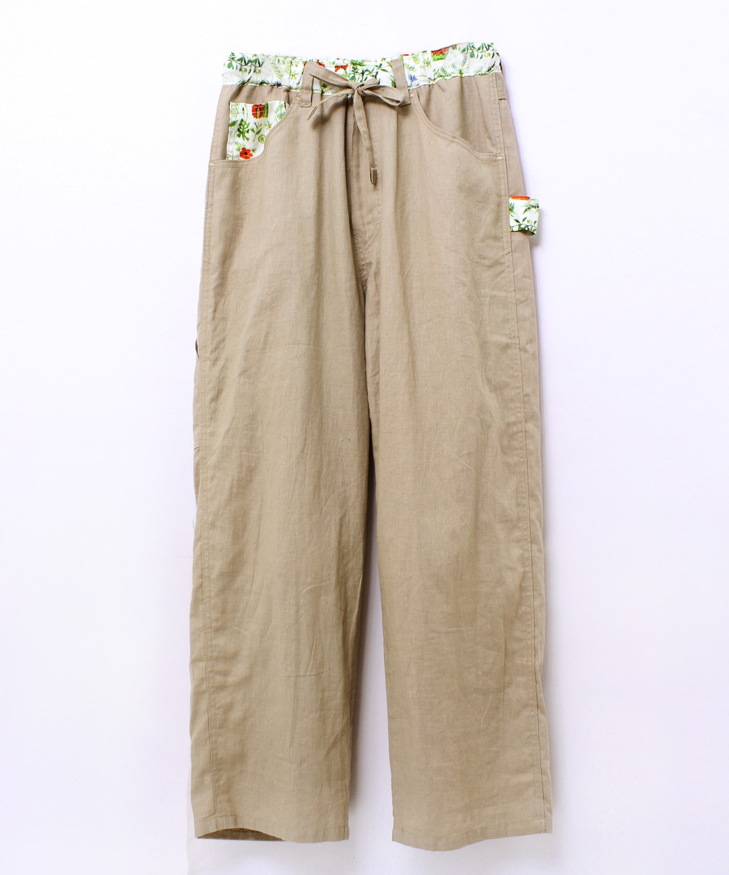 オリジナルボタニカルプリントと無地リネン綾織のコンビパンツで、