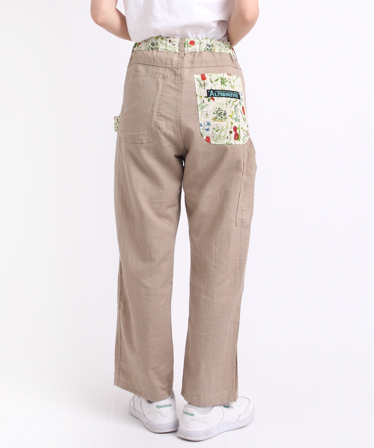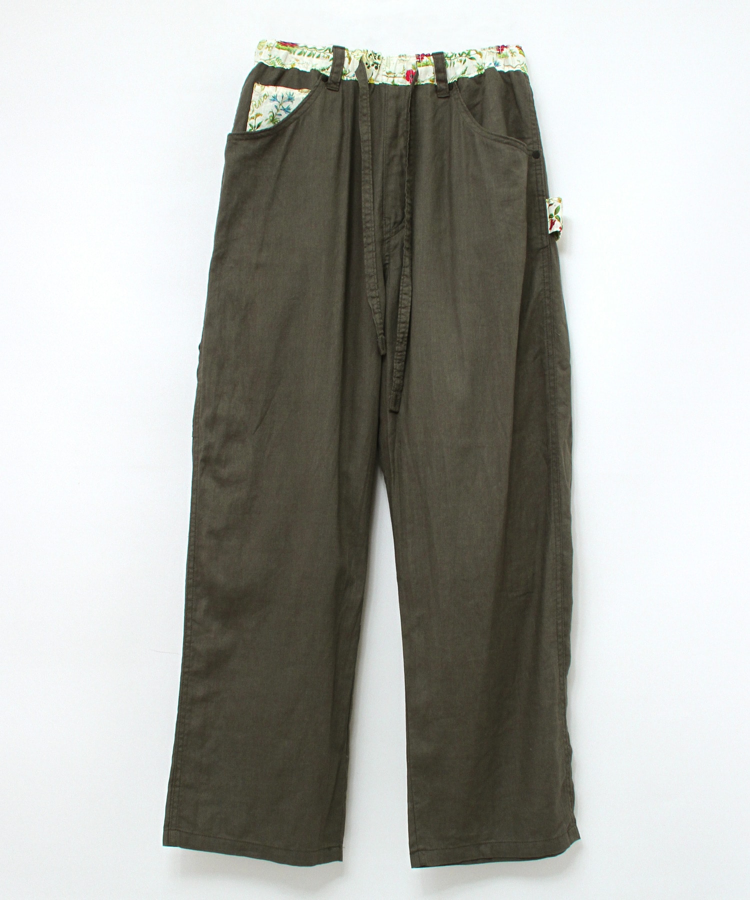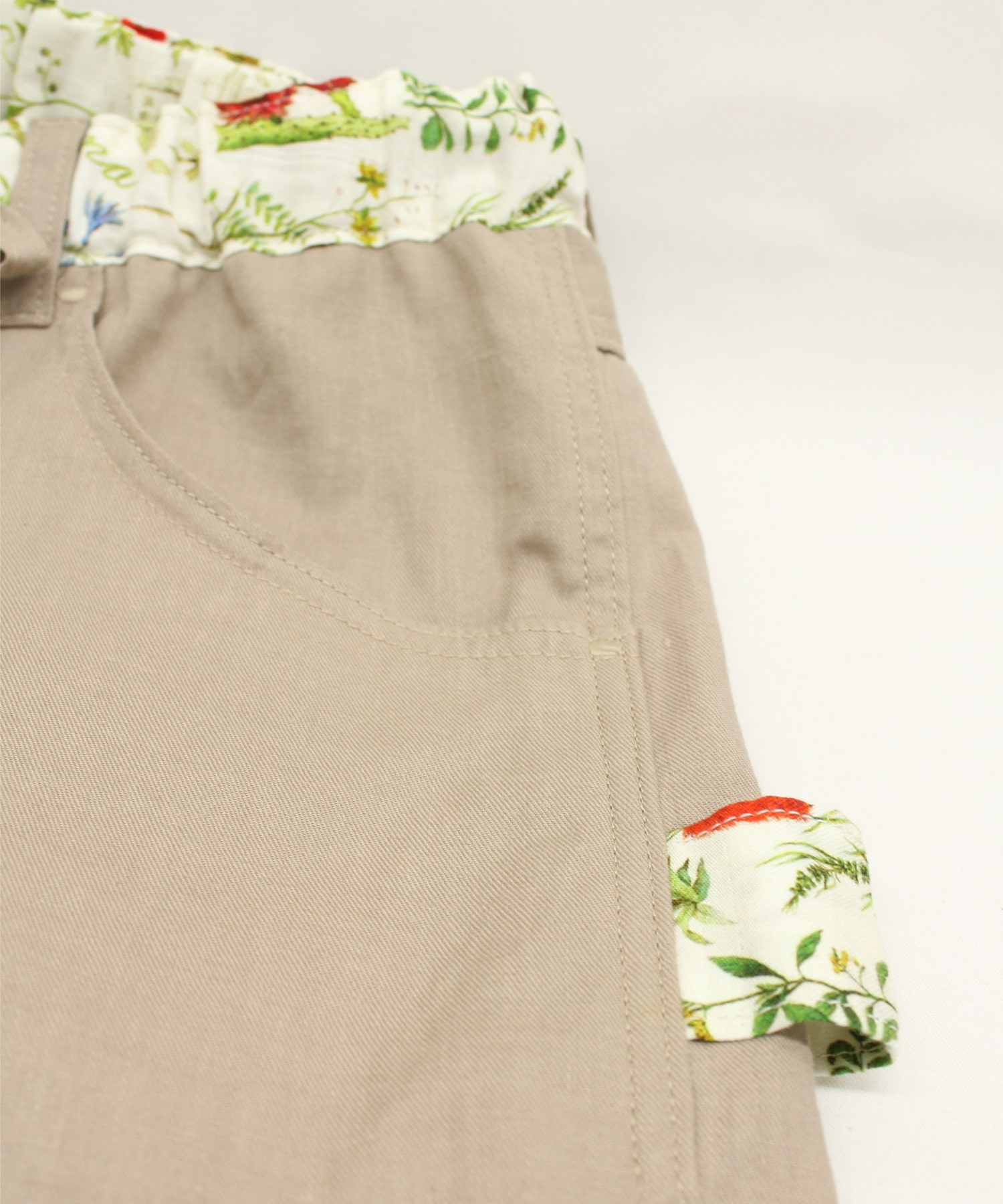 オリジナルボタニカルプリントと無地リネン綾織のコンビパンツで、