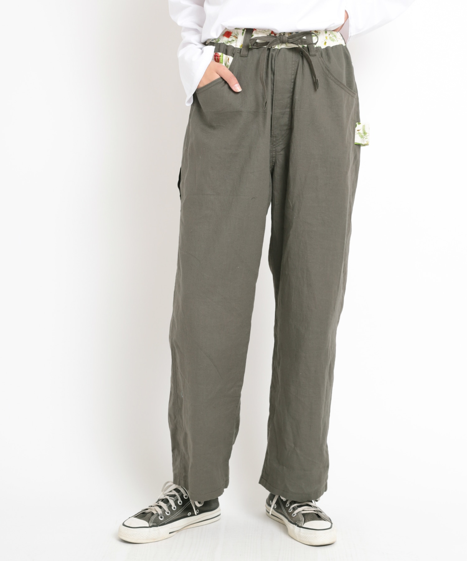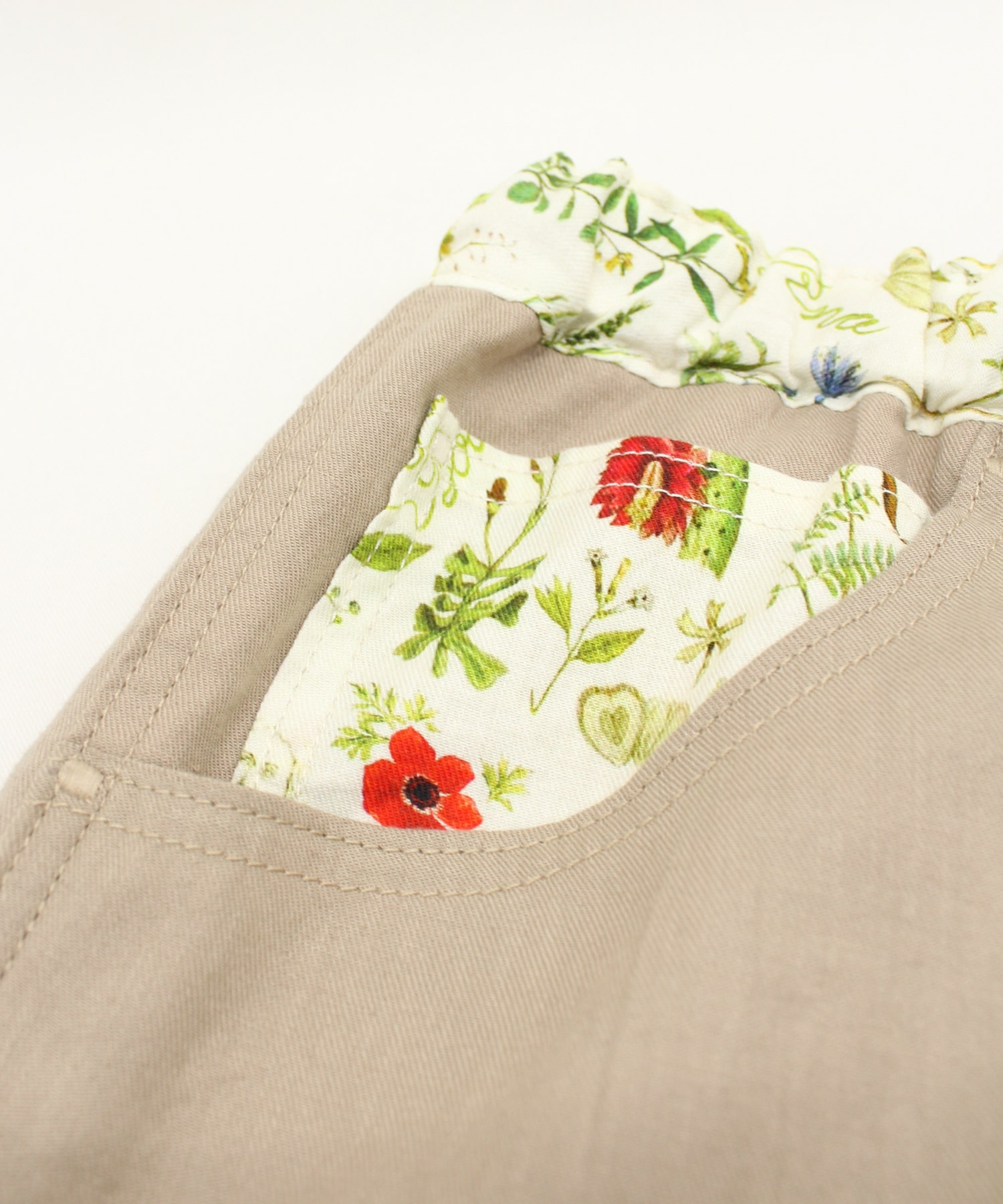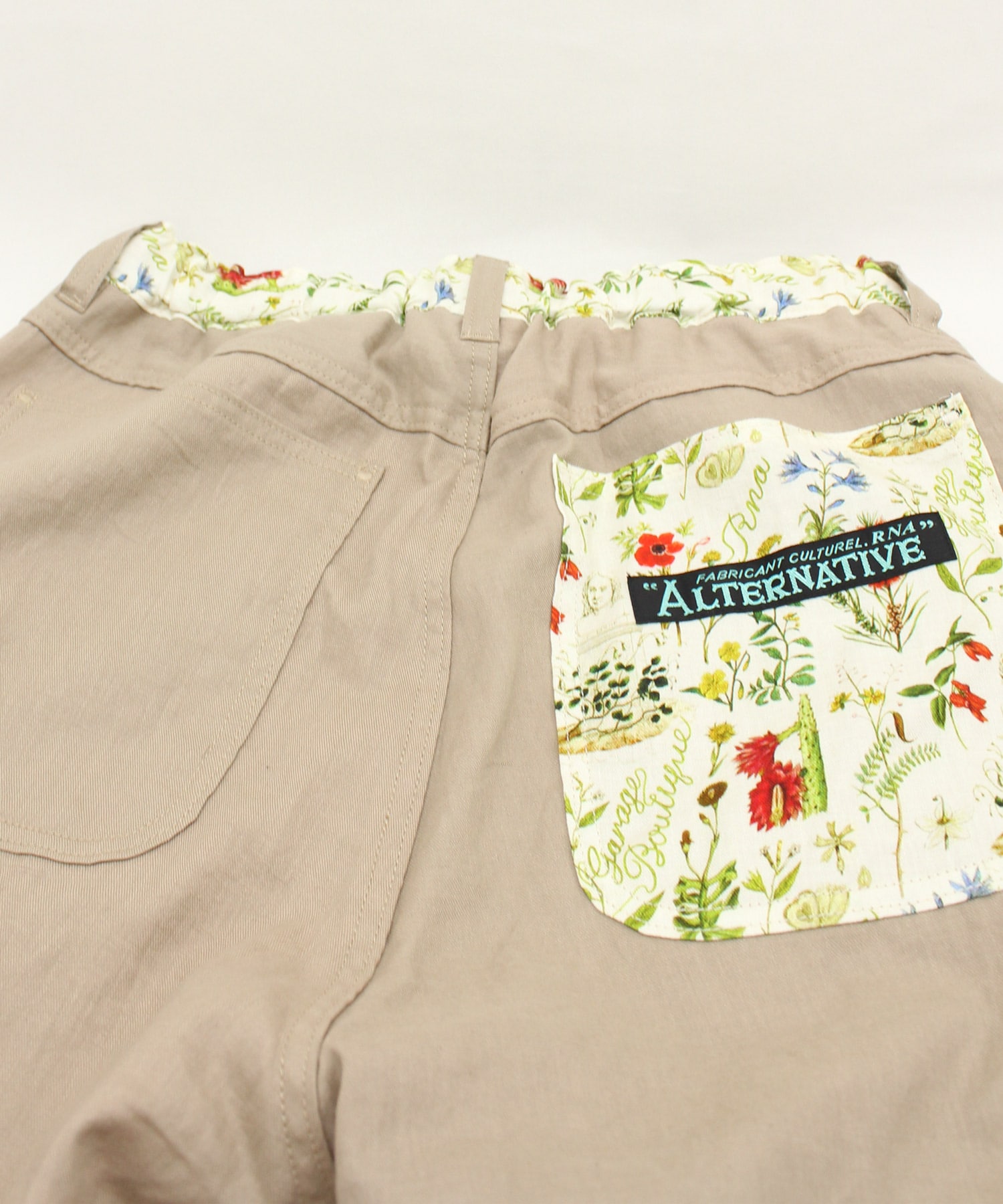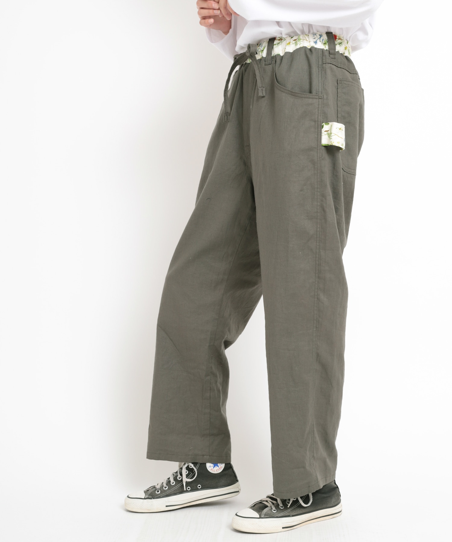 オリジナルボタニカルプリントと無地リネン綾織のコンビパンツで、