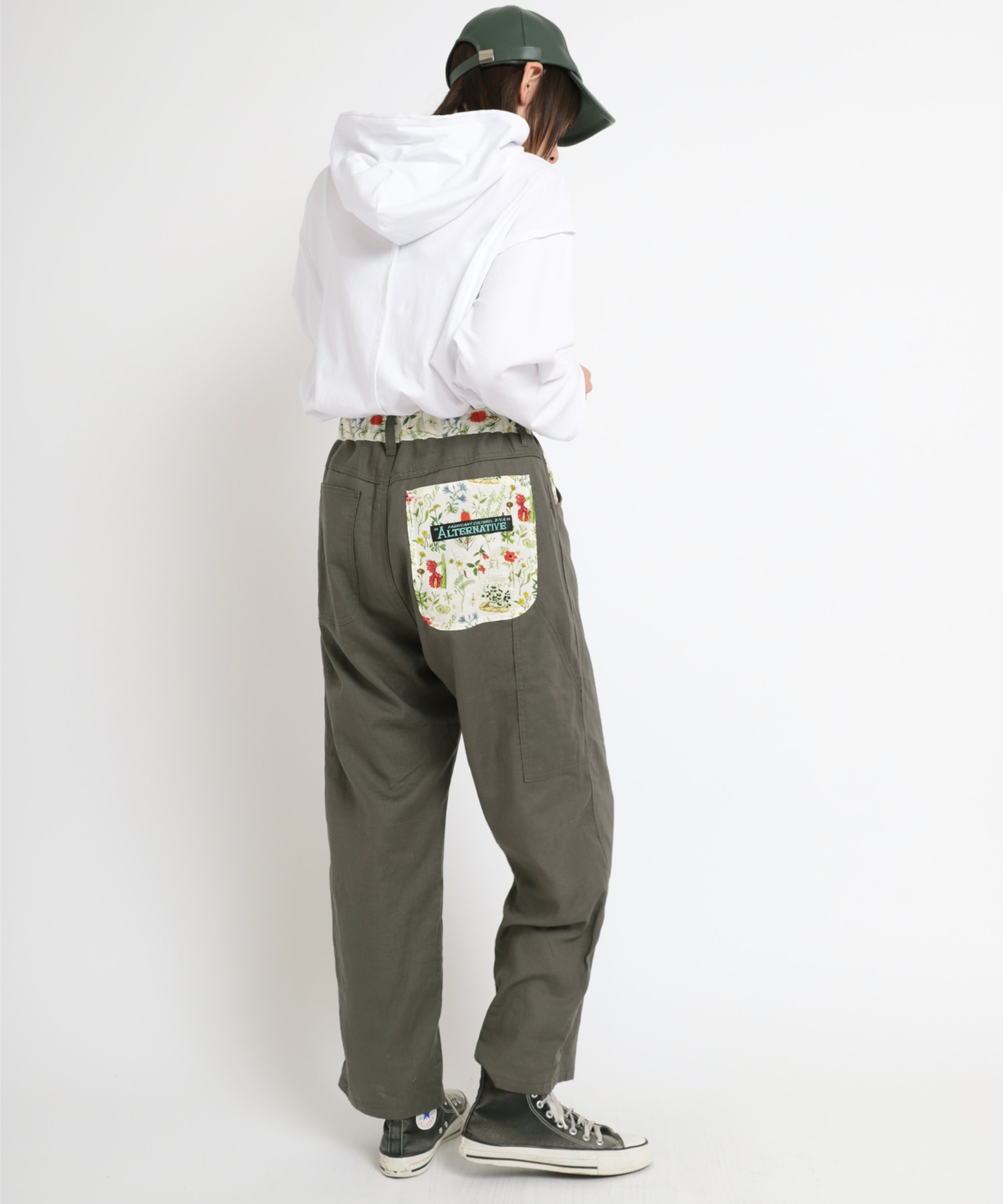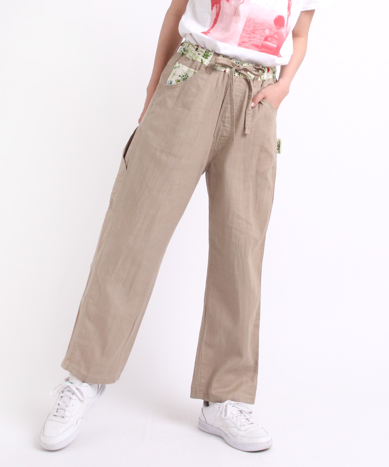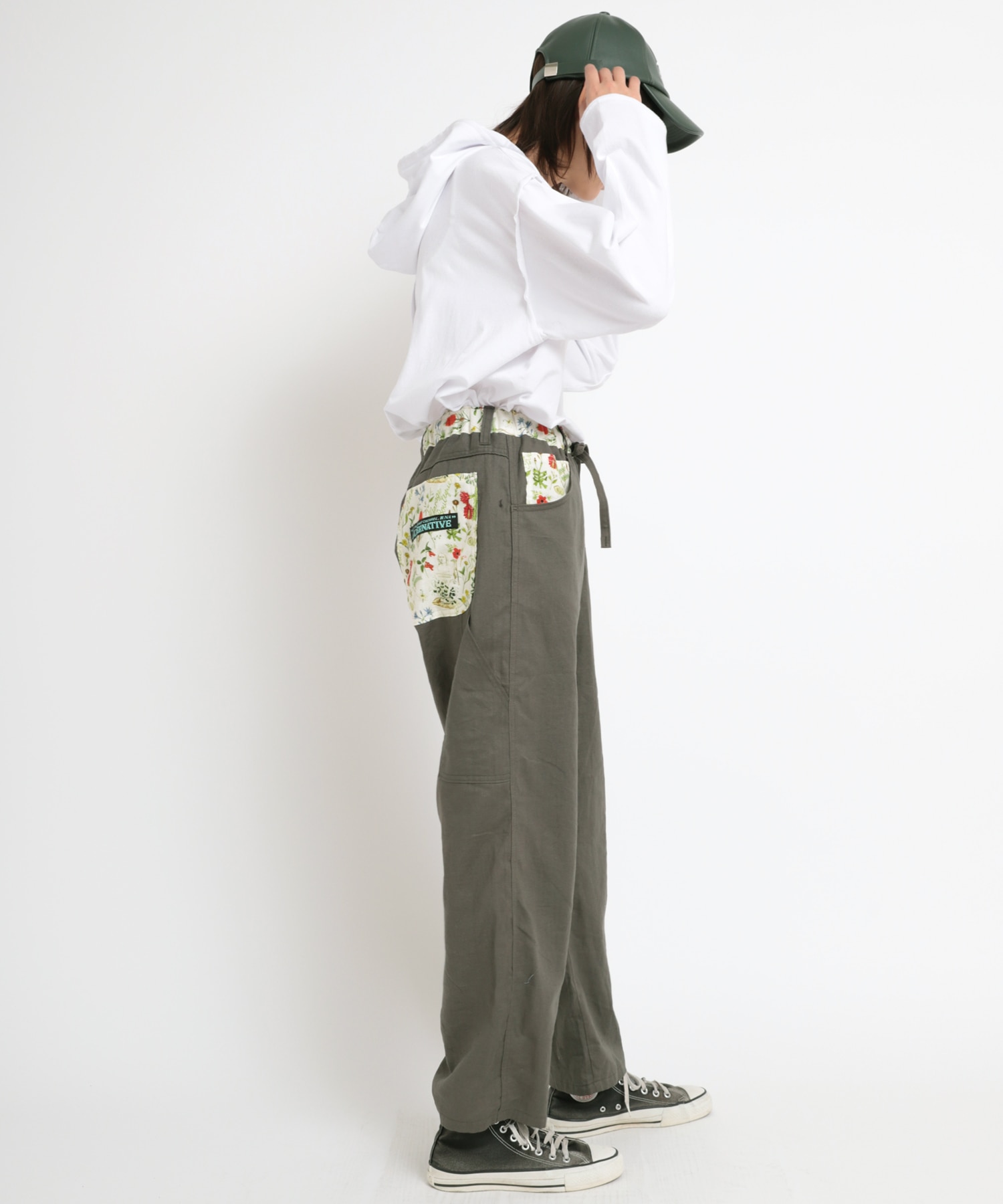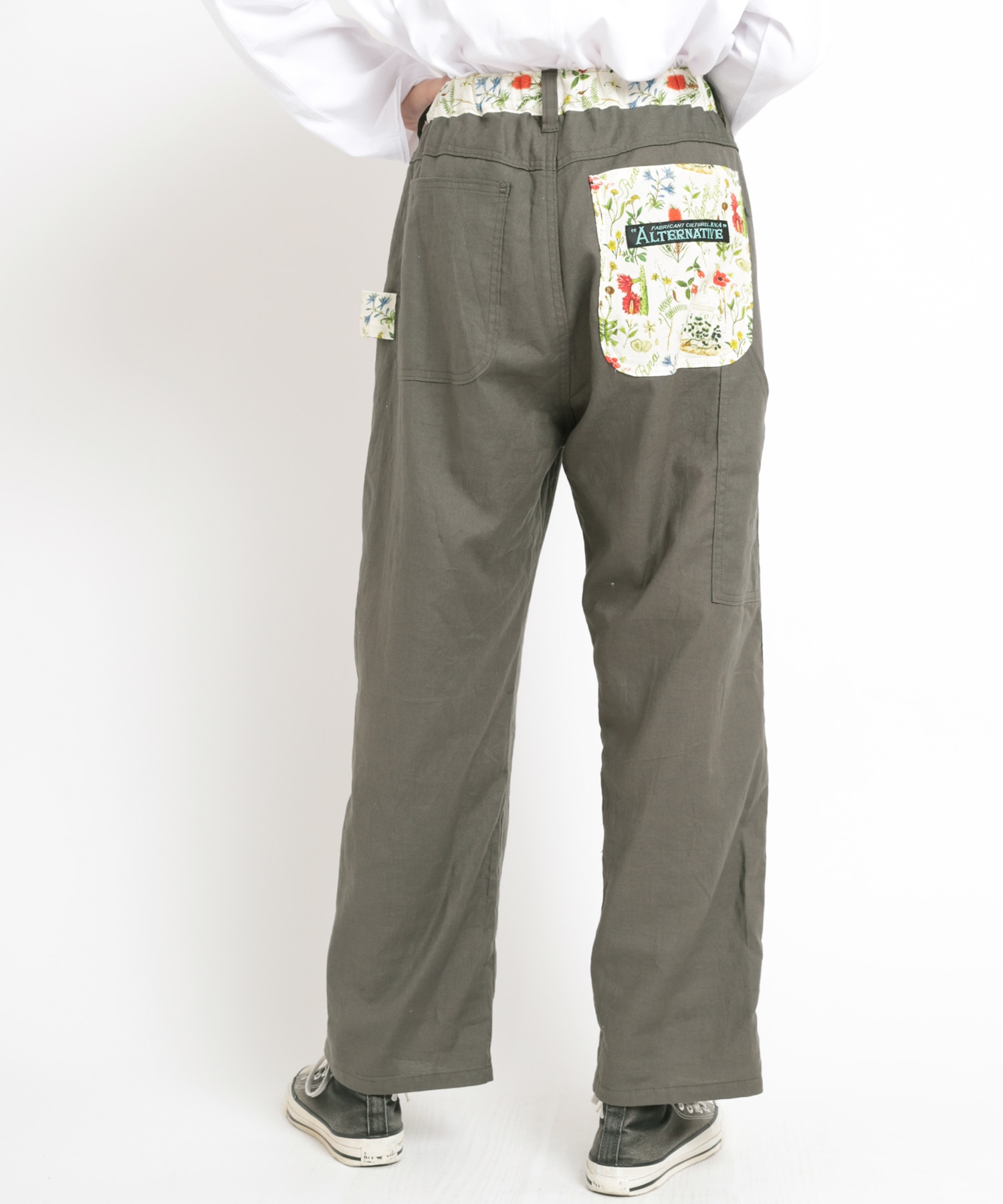 ややテーパードしたワイドストレートシルエットのボタニカルプリントコンビペインター