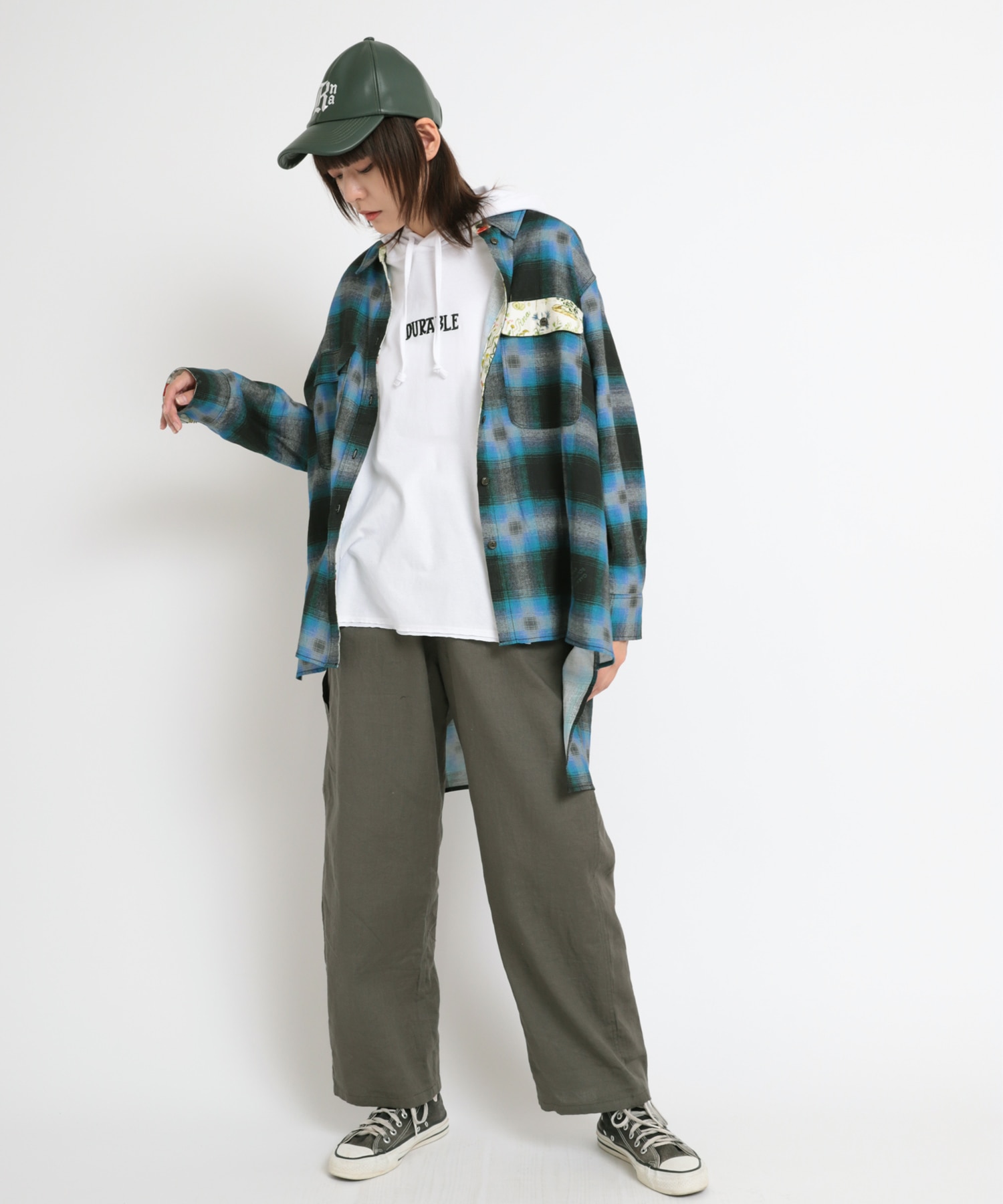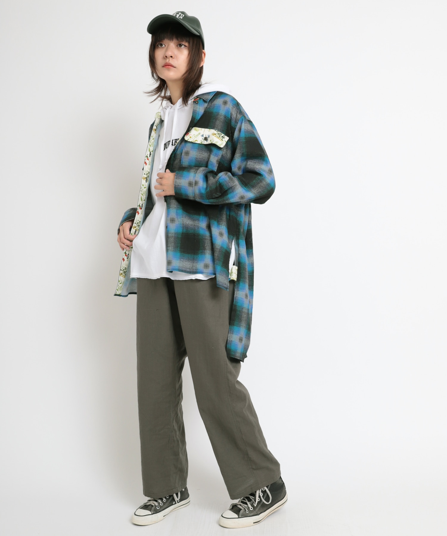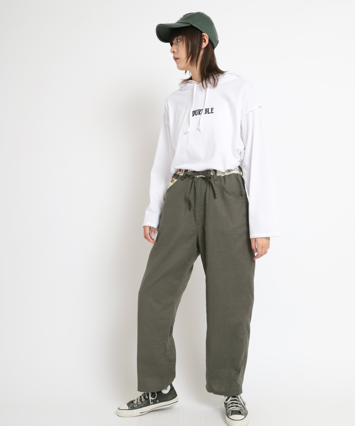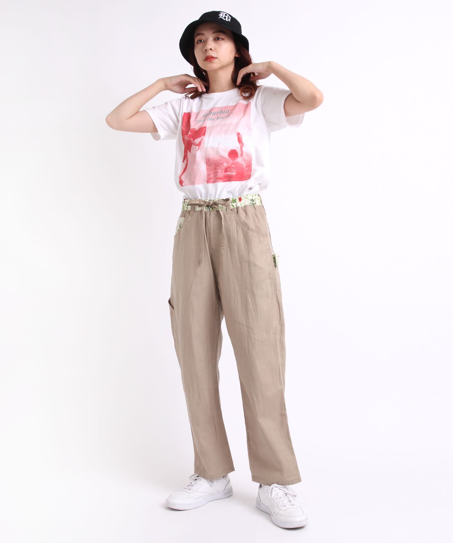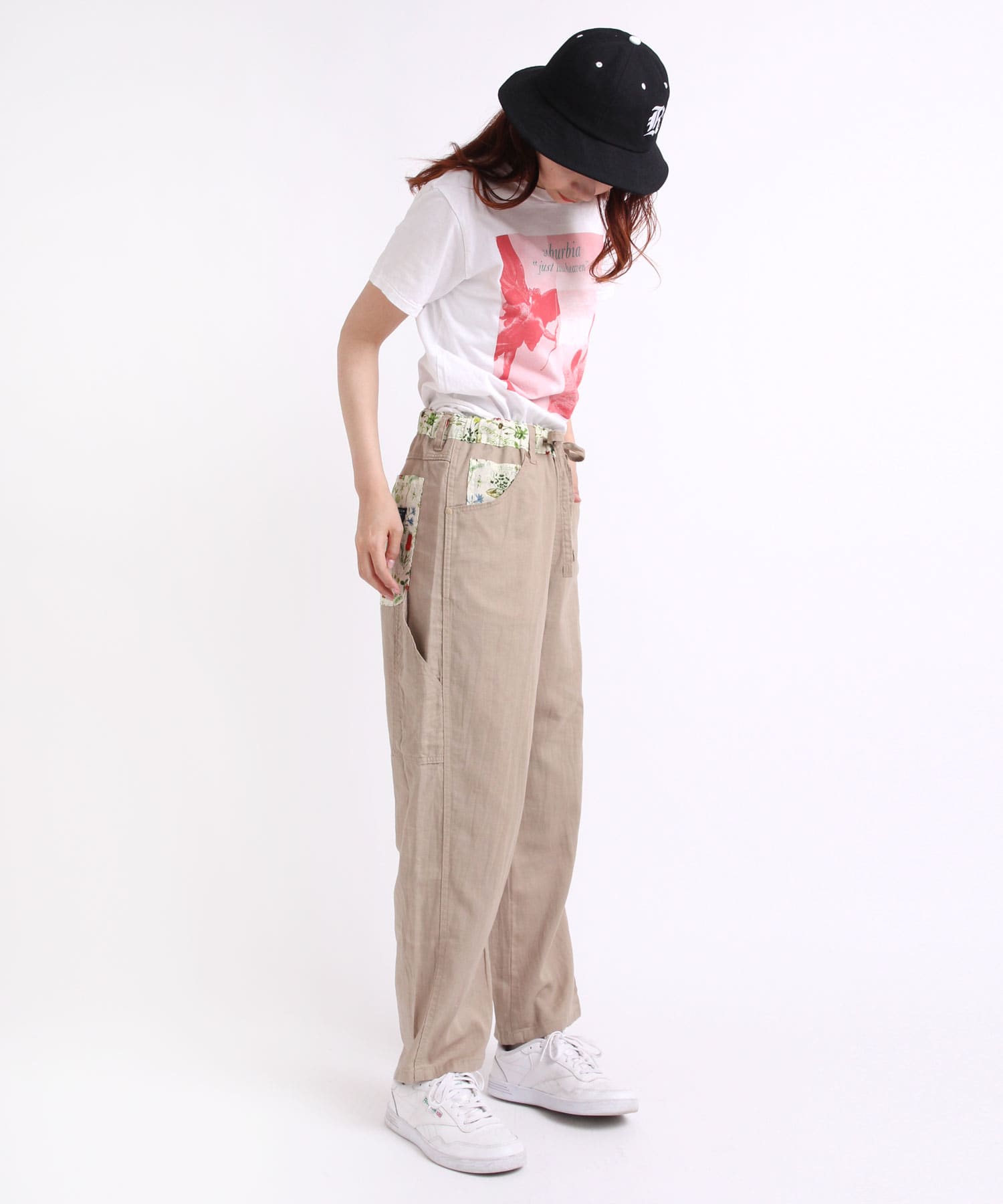 ややテーパードしたワイドストレートシルエットのボタニカルプリントコンビペインター