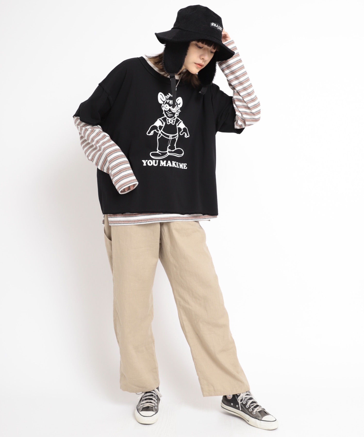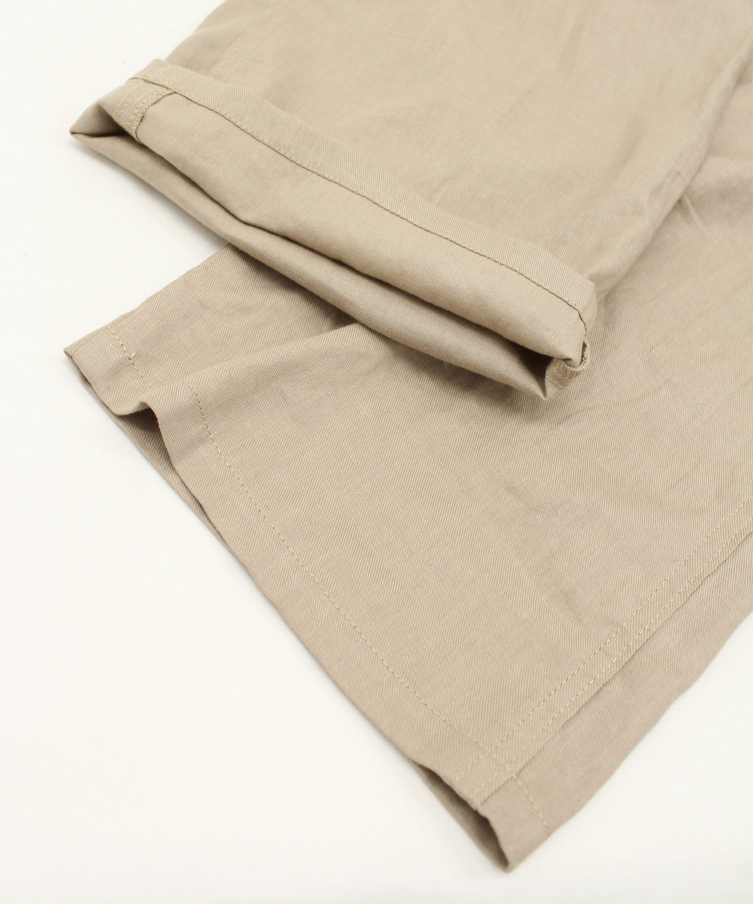 リラックスして着用できるよう、ZIP・リベットの金属パーツは使用せずに、丸いカンドメなどでディテールを表現しています。