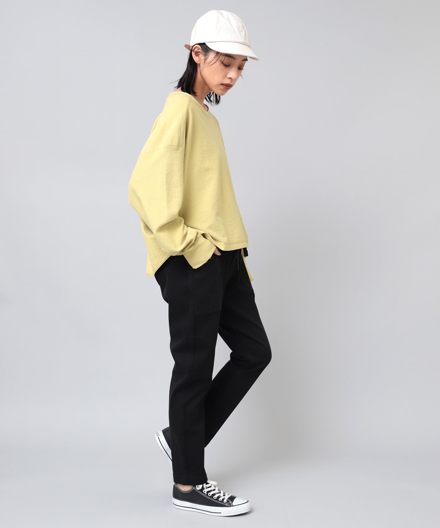 クリーンな印象のクリームは、程よく厚みのある生地で透ける心配もなく、爽やかなコーデが完成。