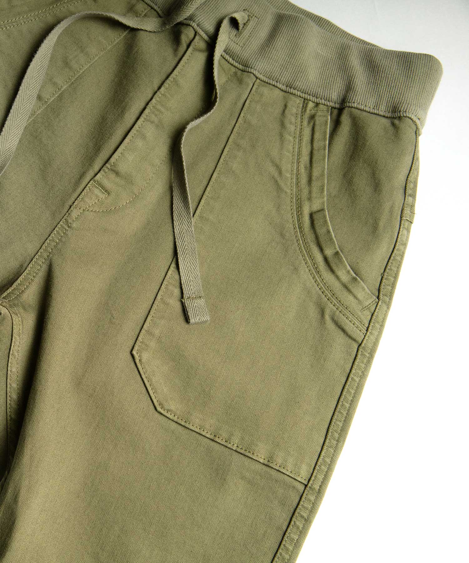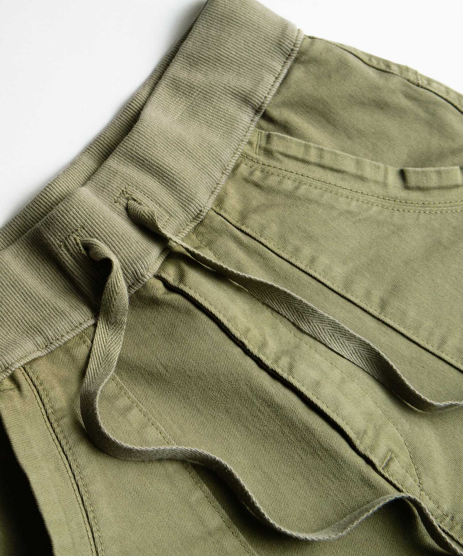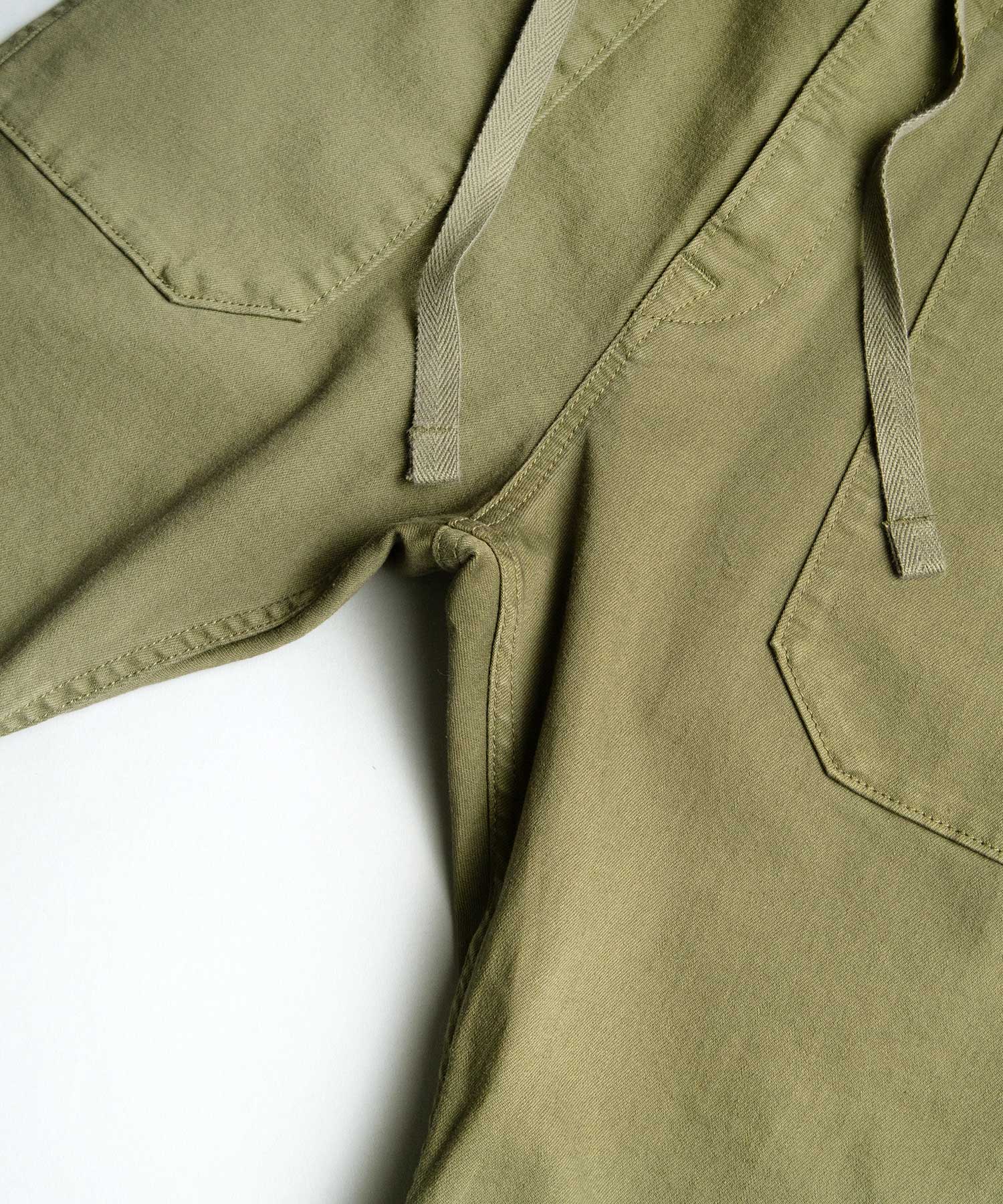 ウエストは締め付けのないゴムのリブ仕様。ドロストコードでサイズの調整が可能です。