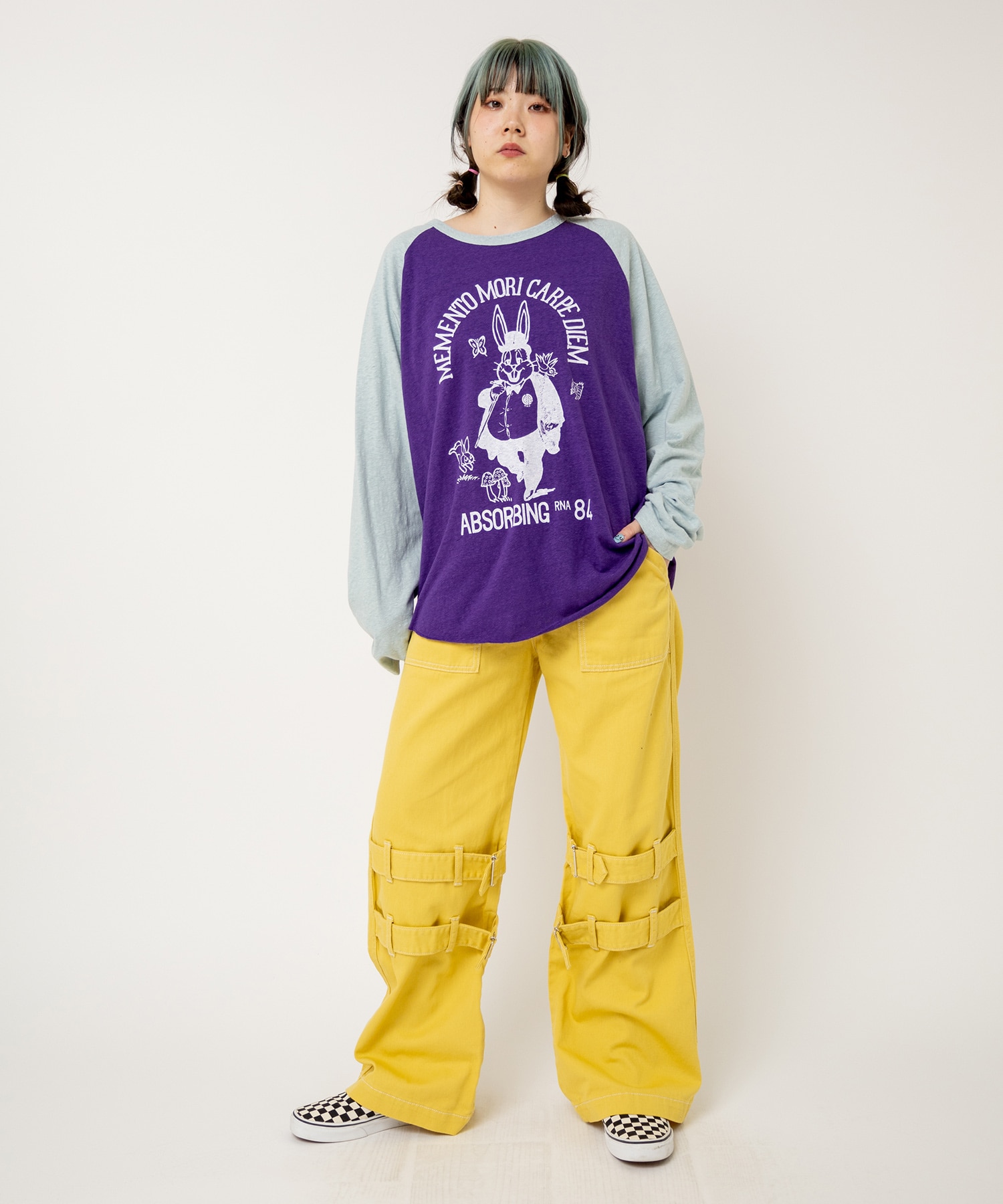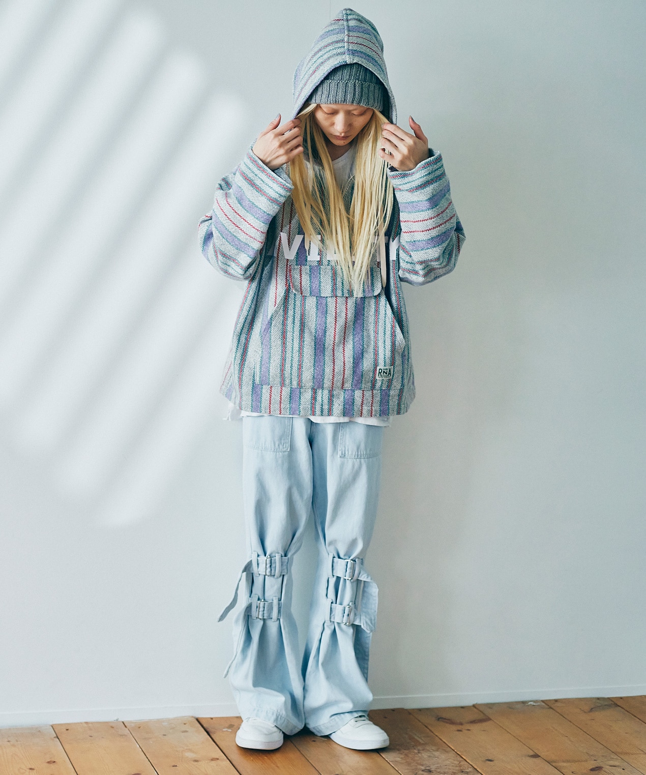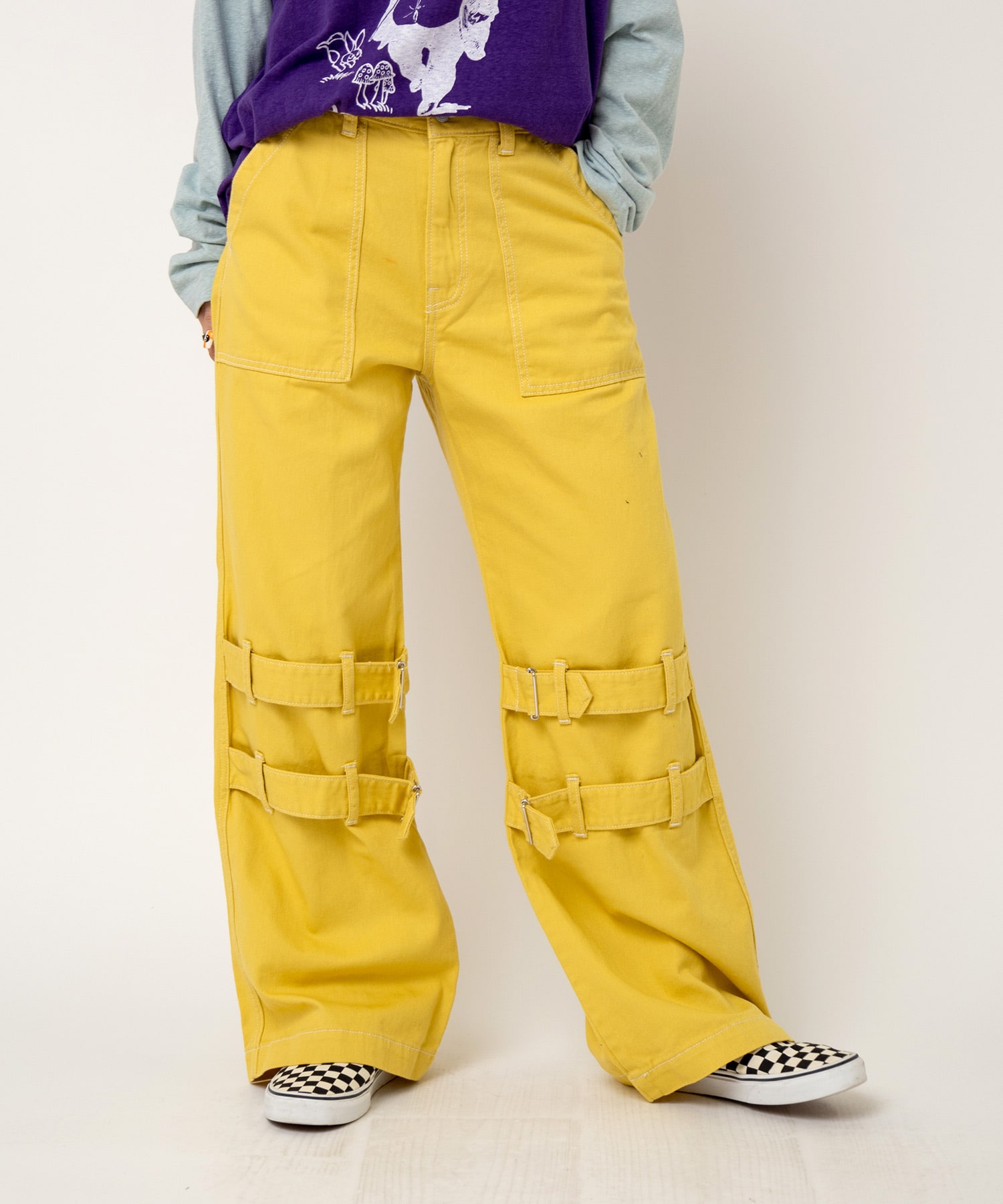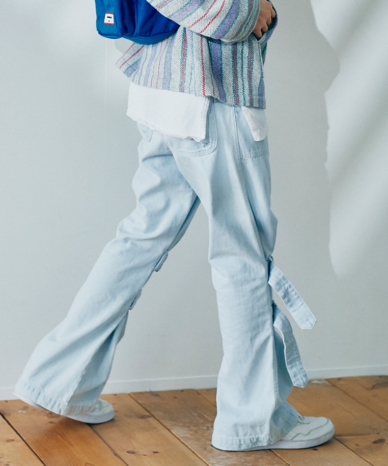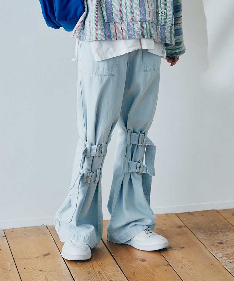 少しバギーなシルエットのパンツを膝のあたりの2本のベルトを締めて履くことで、