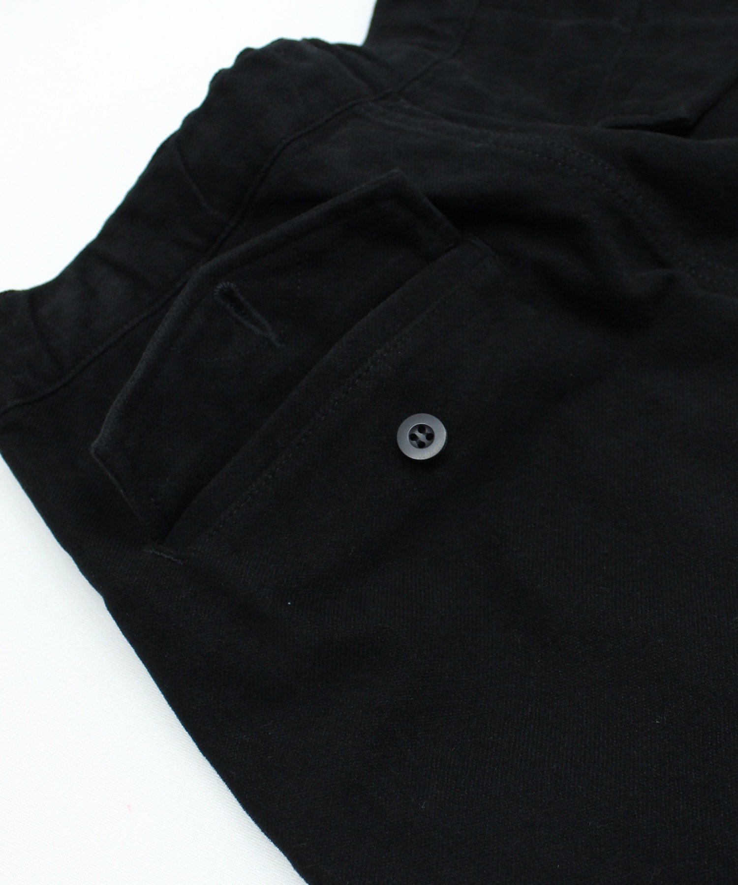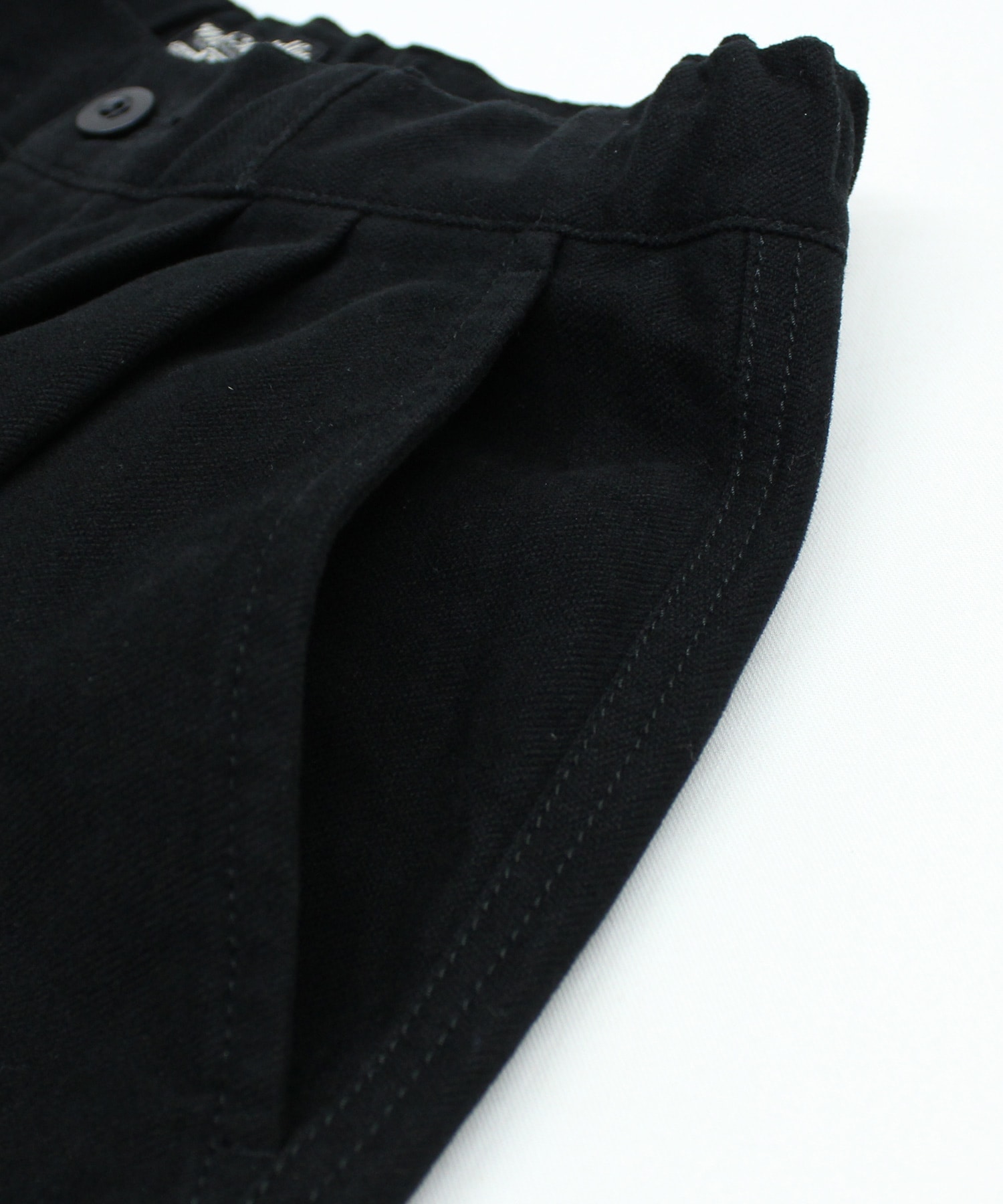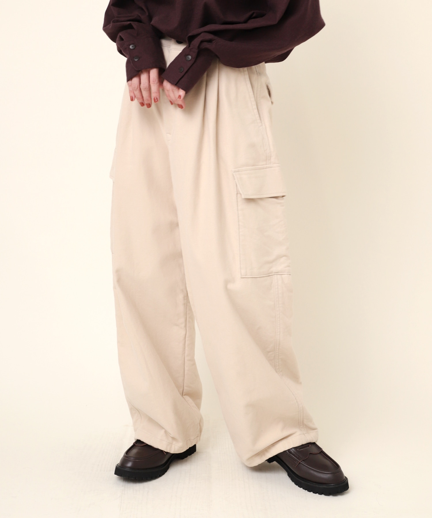 表面変化に富んだ組織で織り上げたドビークロスに毛足の長い起毛を施された生地を使ったカーゴパンツです。