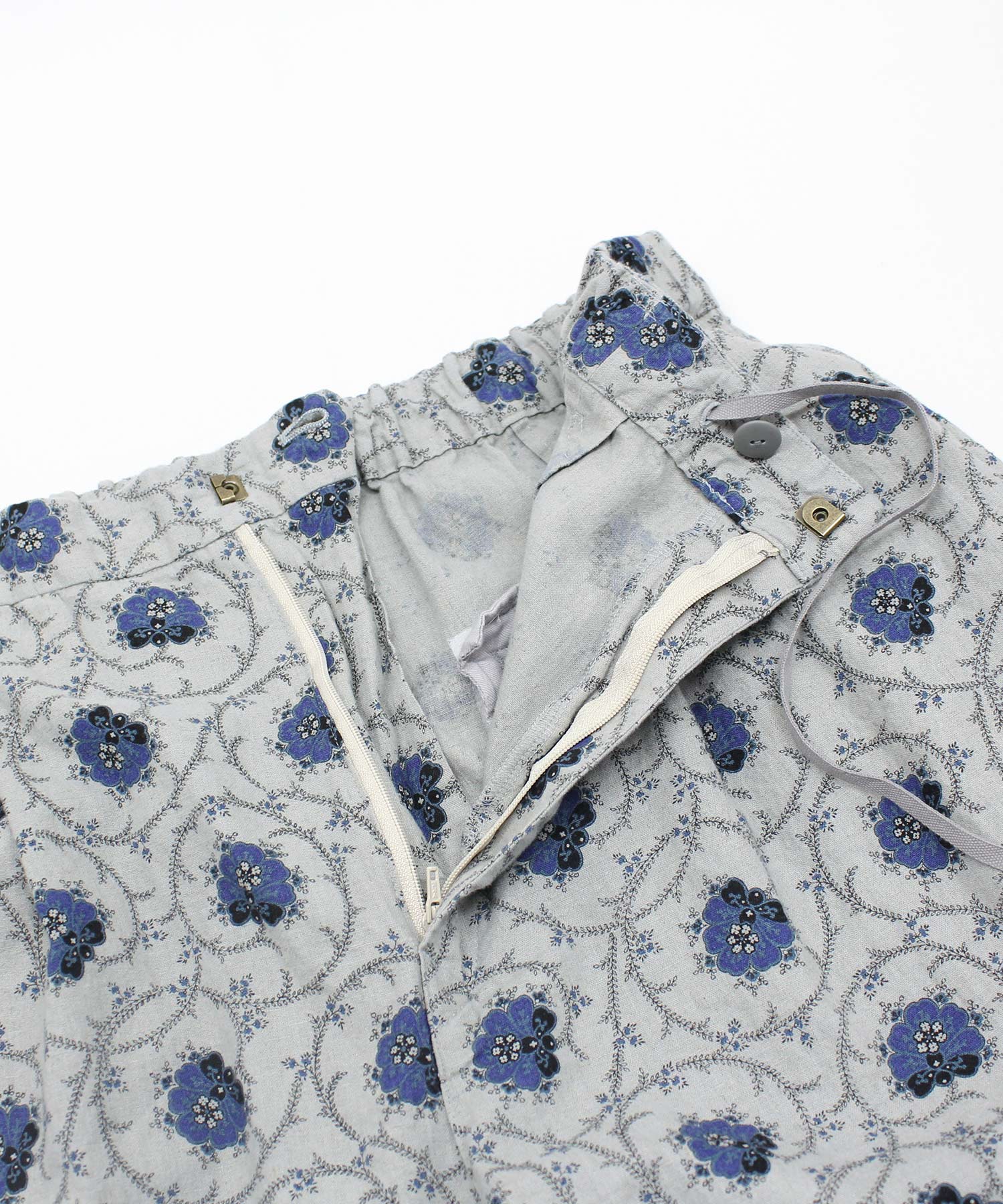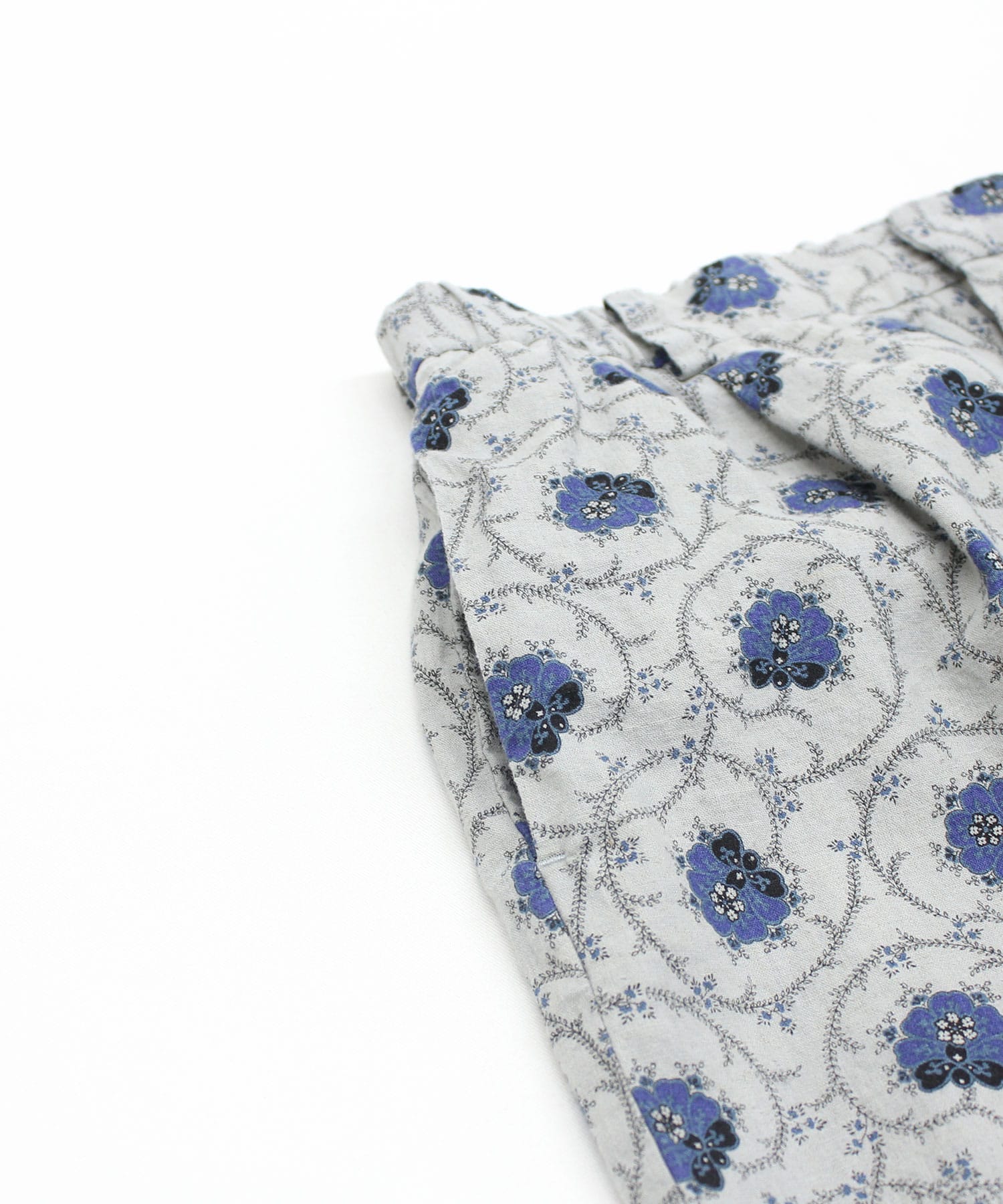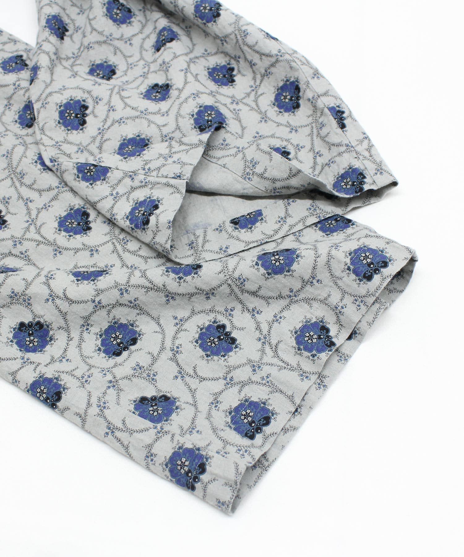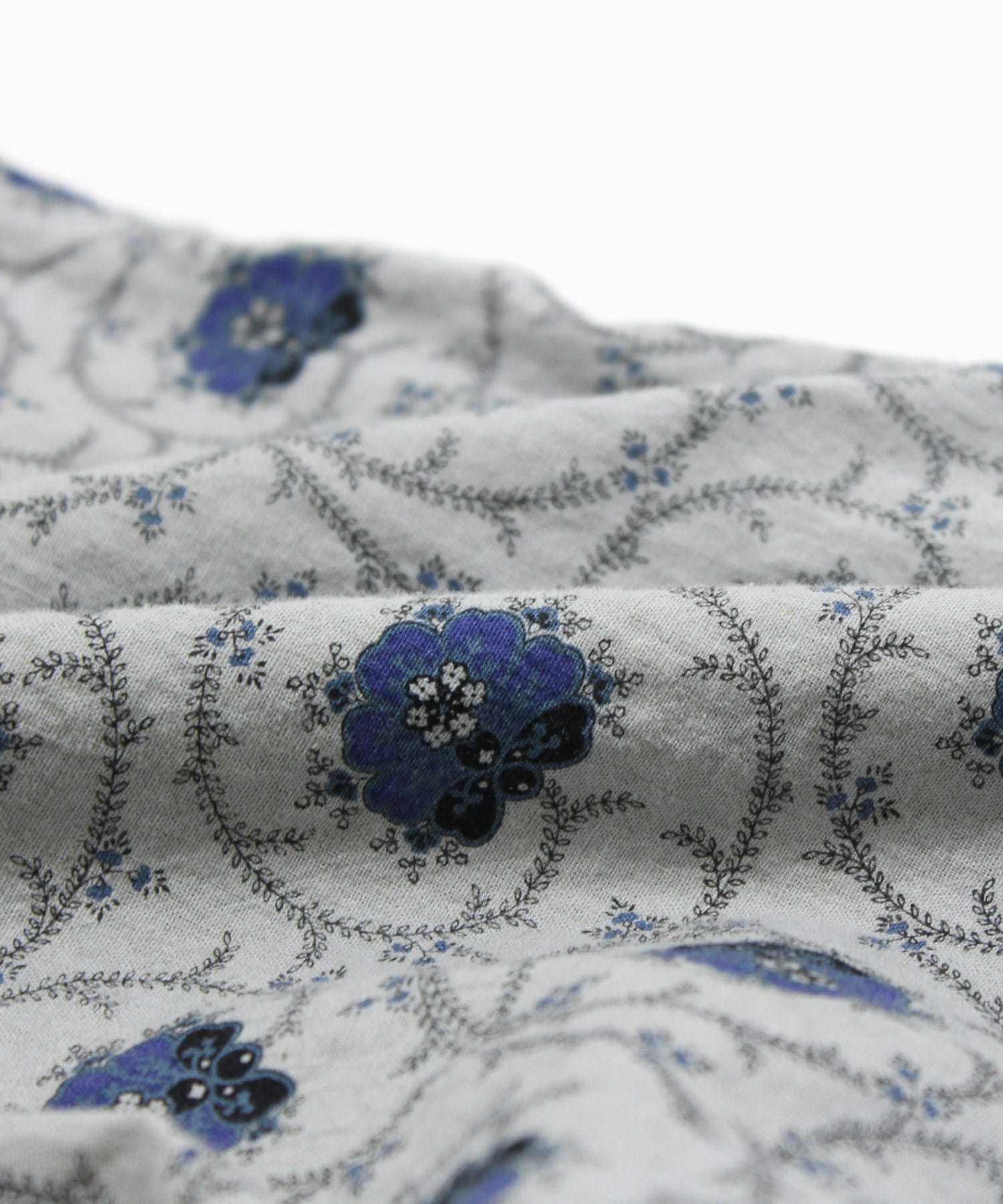 生地はコットンリネンのシーチング素材に、ヴィンテージのマテリアルなどから着想を得たセミオリジナルの柄をプリントしました。(この場合のセミオリジナルとは、生地屋との共同企画の意味です。)