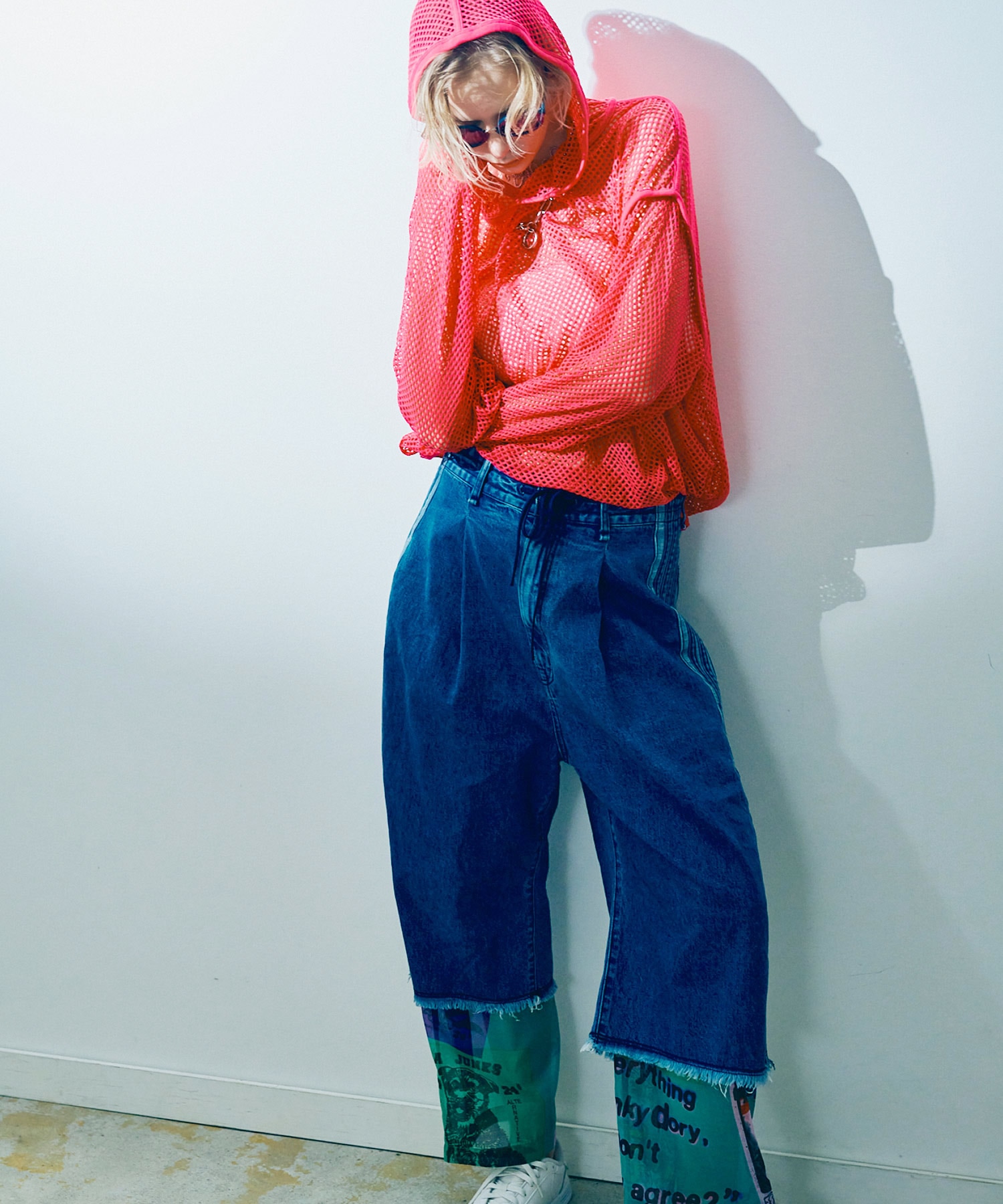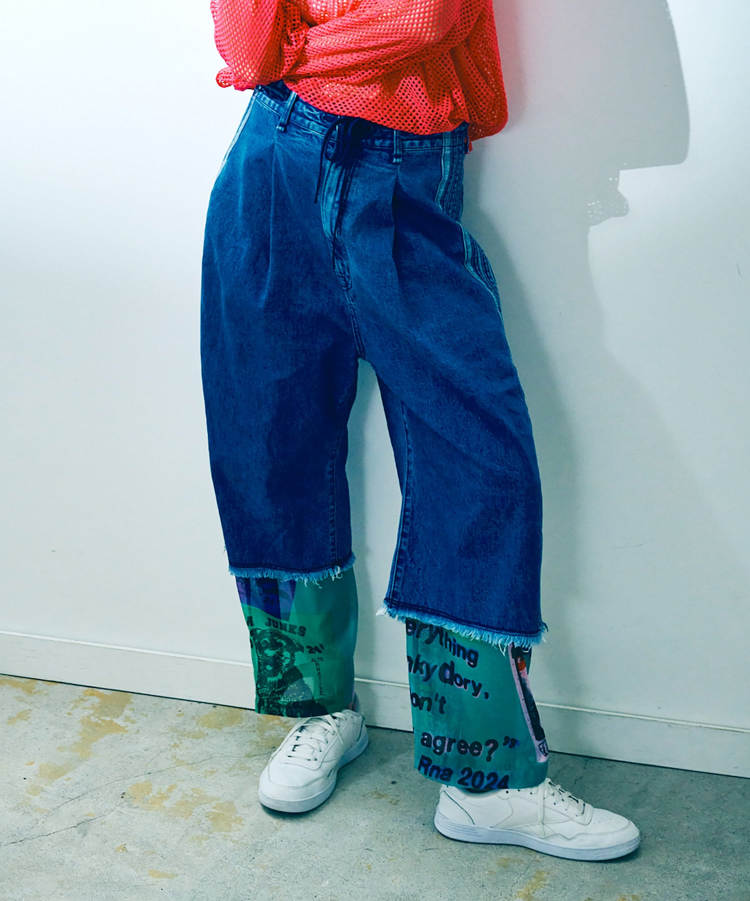 ワイド系シルエットで脇線をヒップライン~膝にかけて柔らかくカーブさせて、