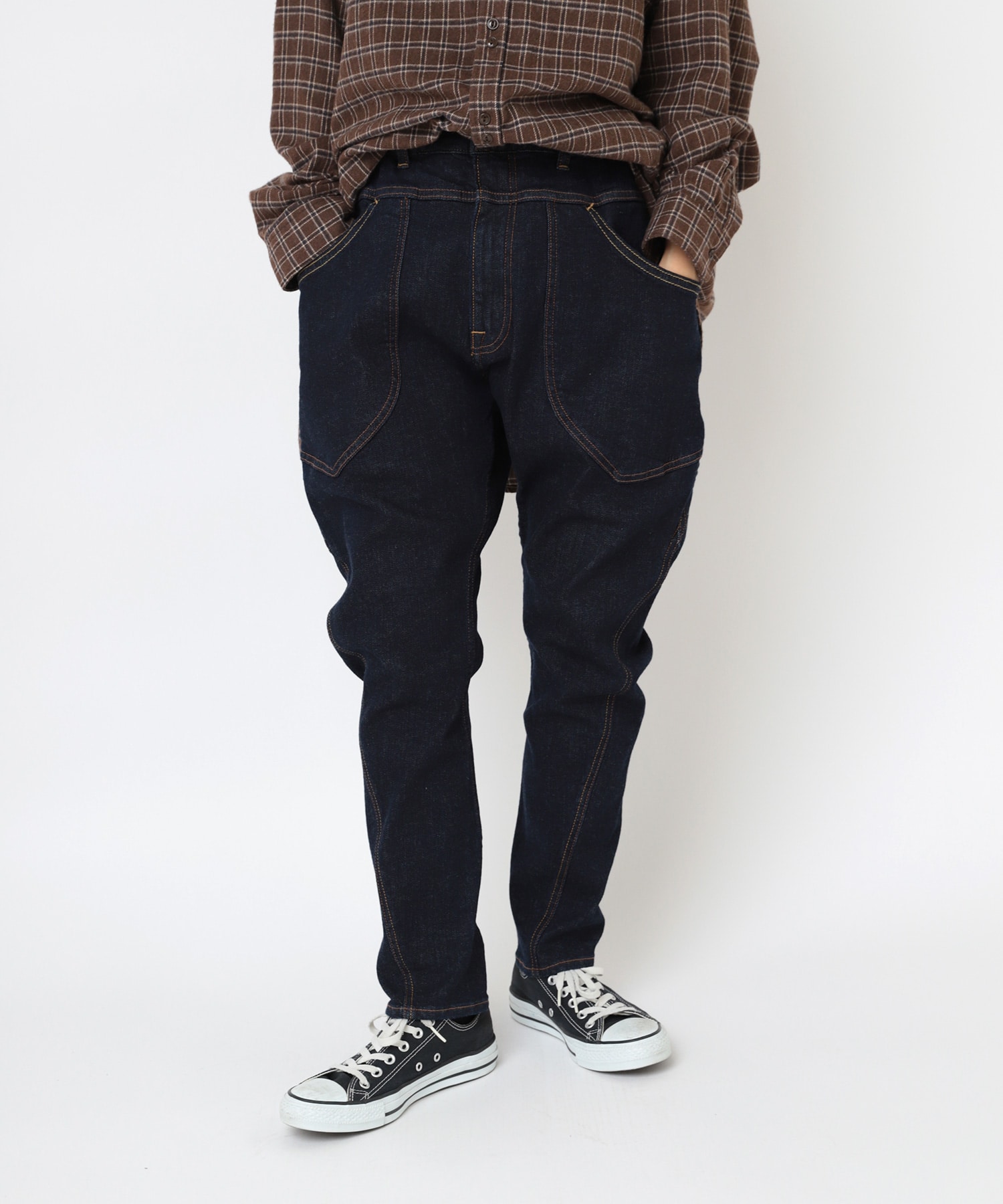 お尻から膝上にかけてゆとりがあり、膝から裾に向かって細くなる、URCH RNA定番のオリジナルロークロッチスリムシルエット。