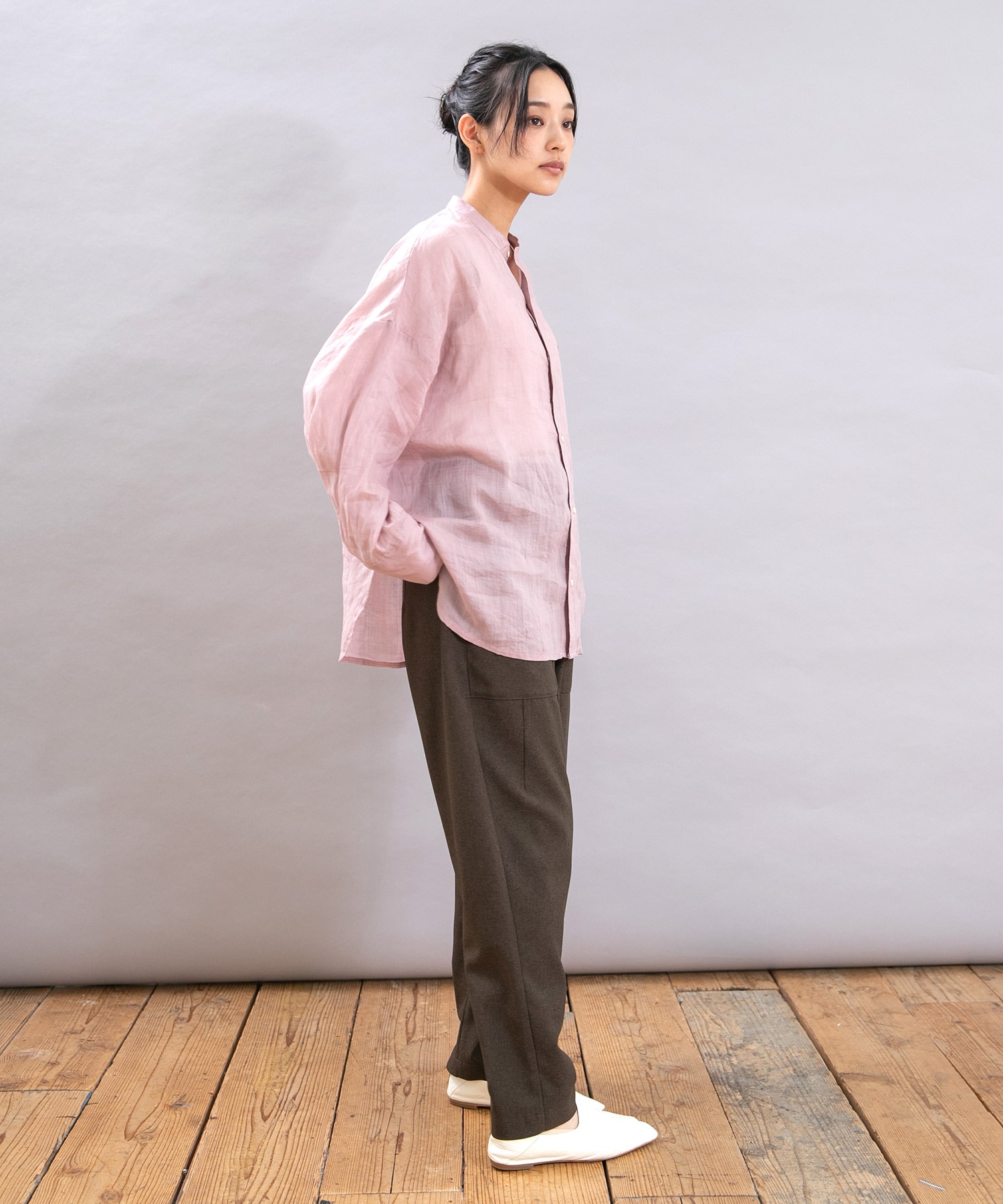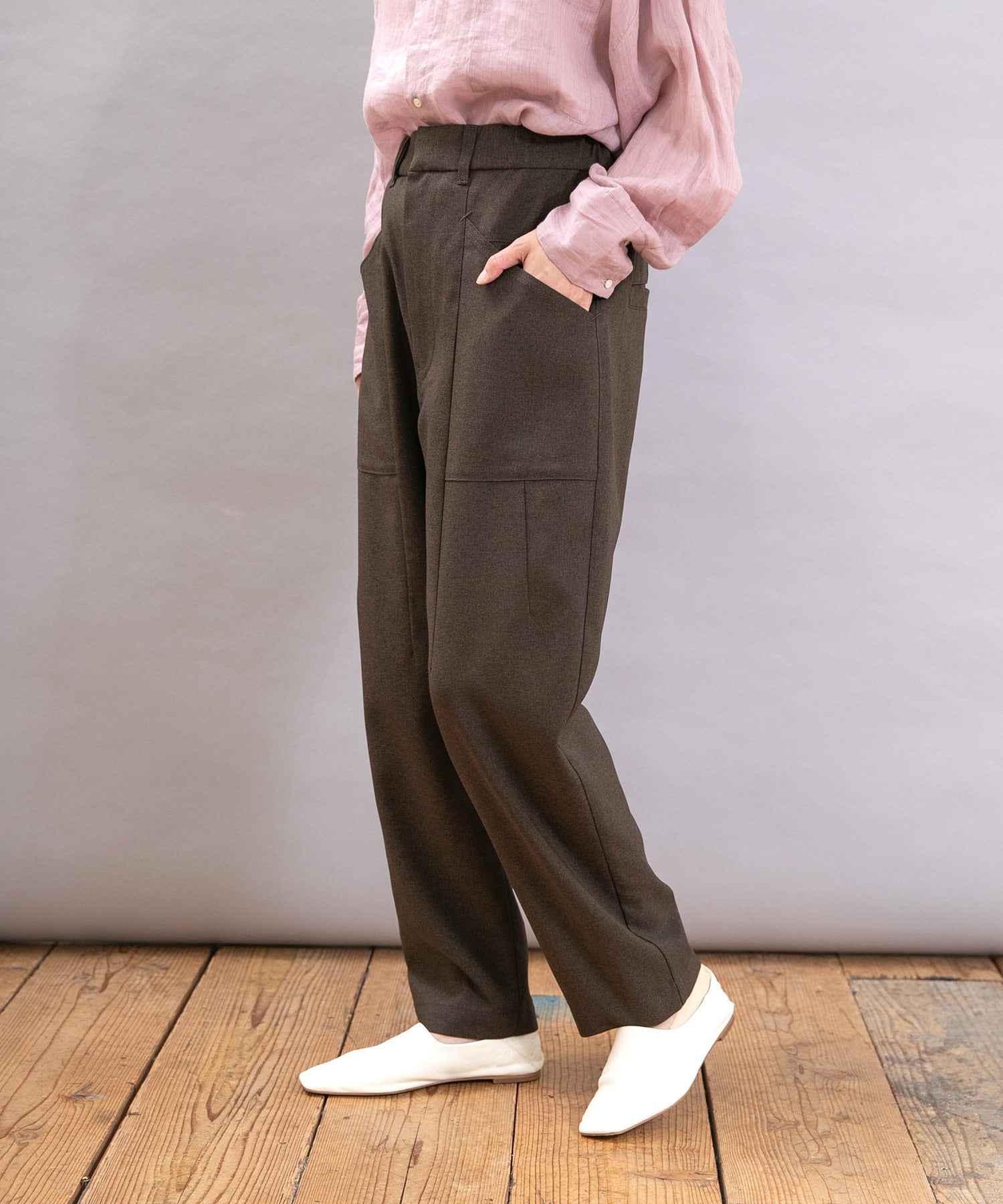 腰からヒップにかけた程よいゆとりが体型をカバーしつつ、すっきりとした印象で着こなせます。