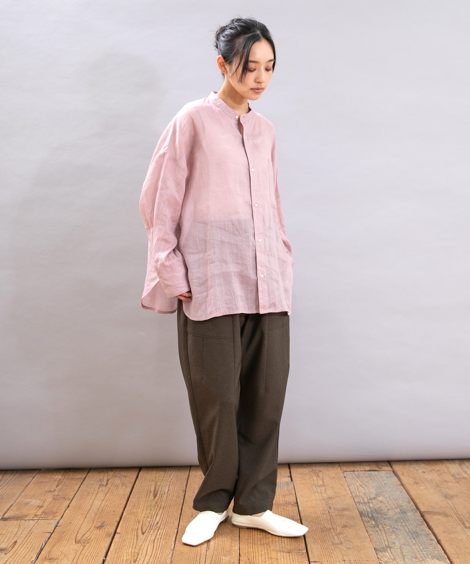 素材には、メランジ感のある表面と、適度なドライ感が特徴の中肉平織生地を採用。
