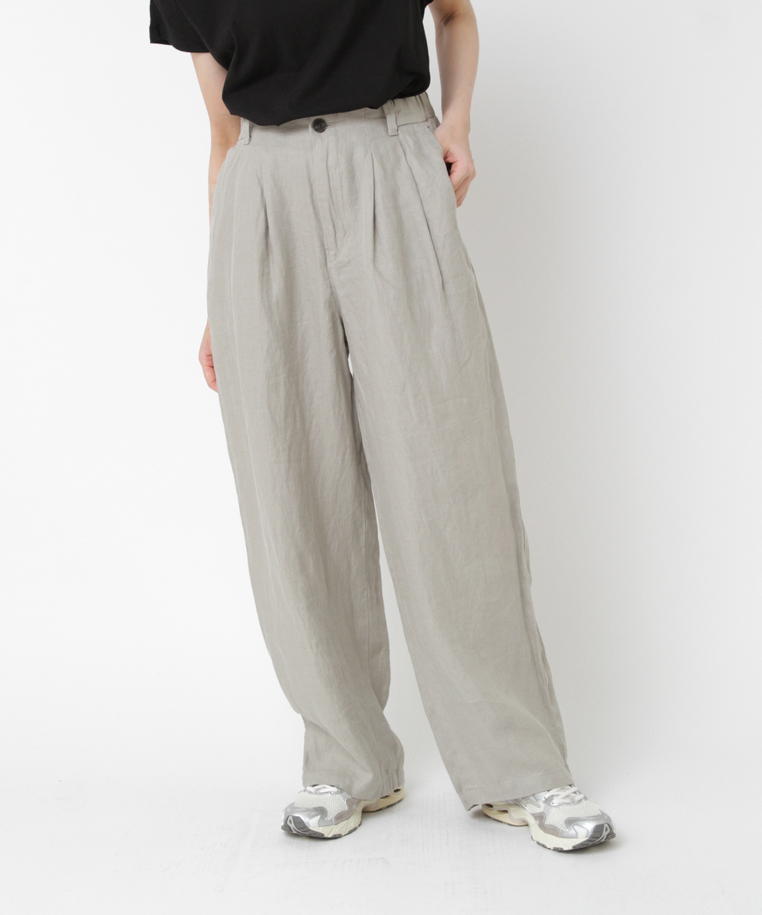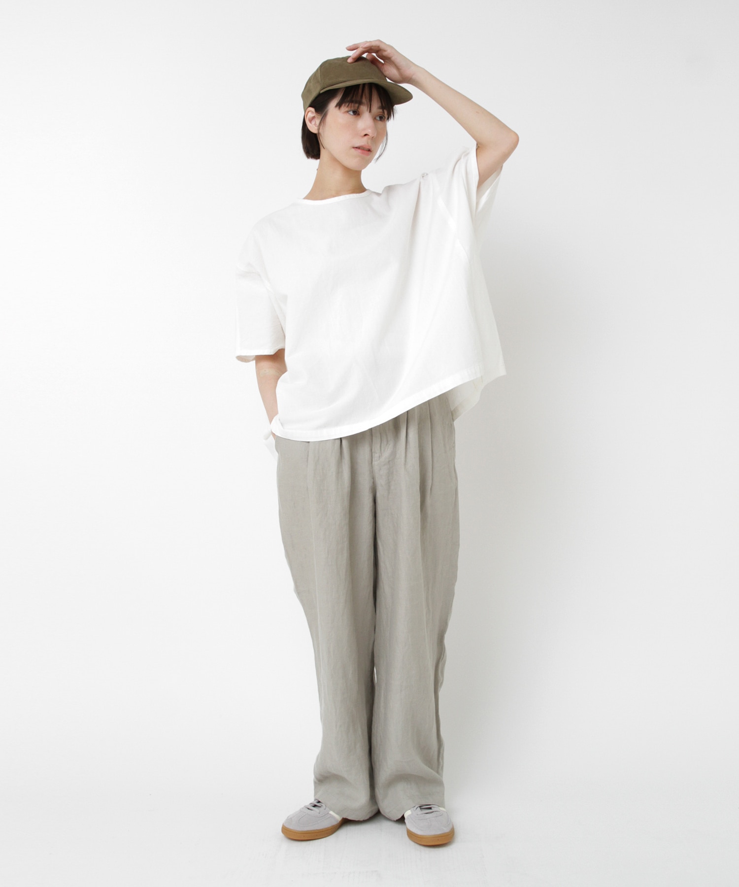 フロントの大きく長めのタックが腰回りにゆとりをもたせるワイドストレートシルエットになっています。
